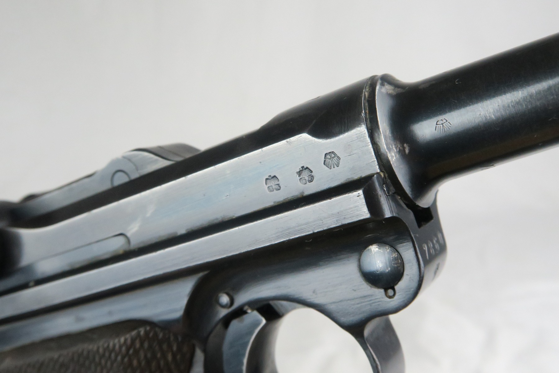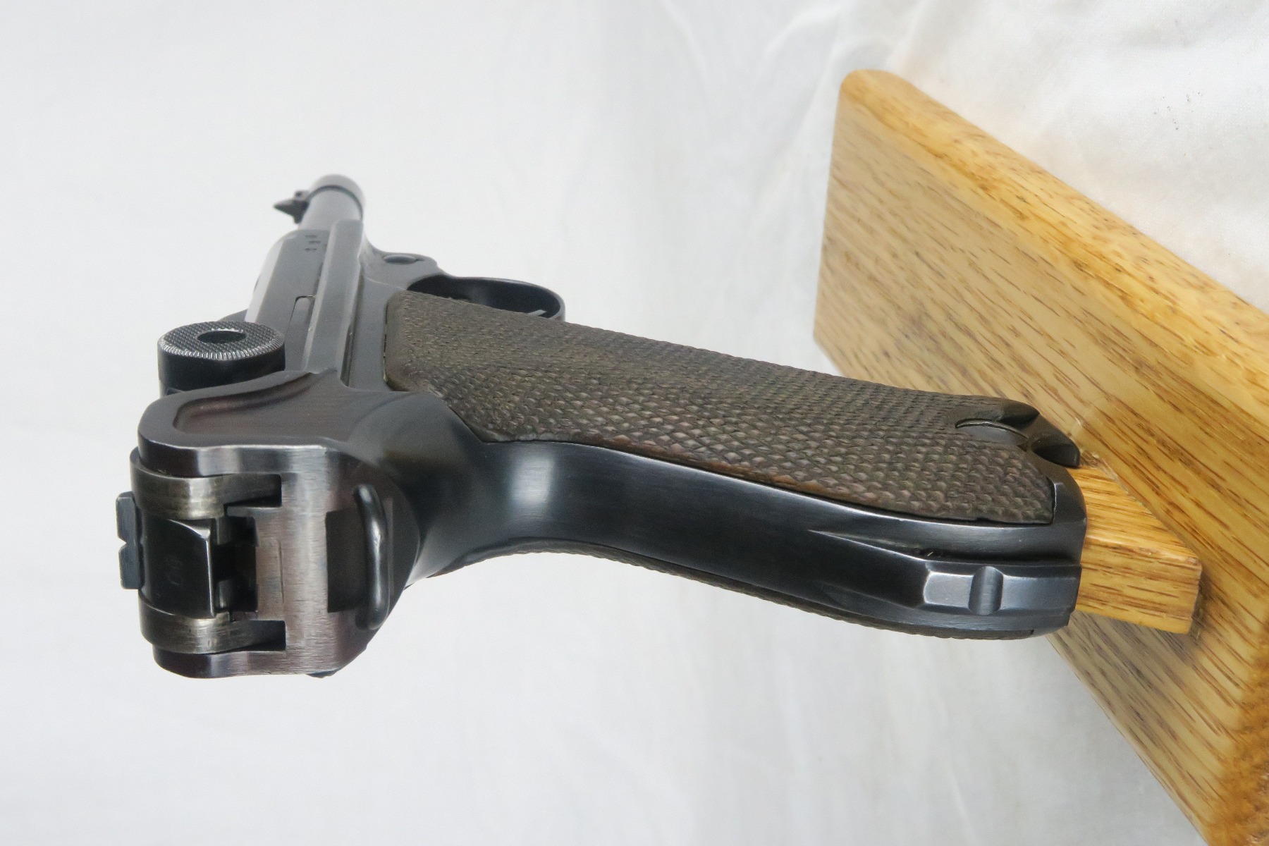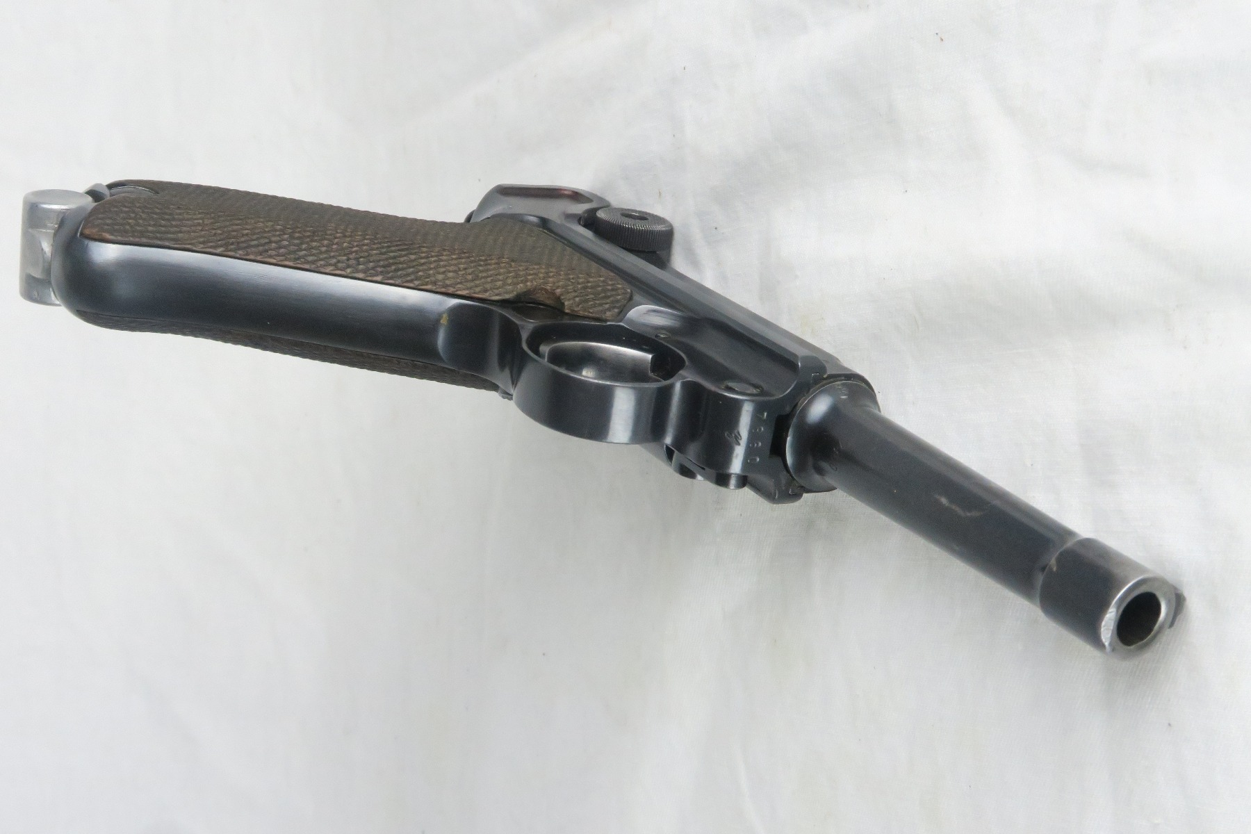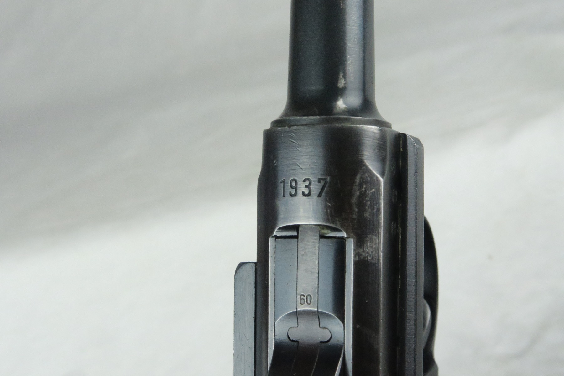 12/20/17 – This is an original and completel Mauser luger rig from 1937.  Included in this listing is a spare magazine with no serial, 1938 dated holster and WaA63 proofed tool.  The pistol has all matching numbers, excluding the magazine and grips.   The finish rates at about 95% with most of the wear on the high edges of the gun. The magazine is the correct variation but numbered to a different pistol, and the grips are unnumbered but appear original to the gun because of fit.  Spare magazine is Eagle/63 proofed but has no serial.  The holster is maker marked and waffen proofed, with 1938 date.  It is in very good condition, with minor cracking on the front.  The bore shows minor frosting but is very good overall.