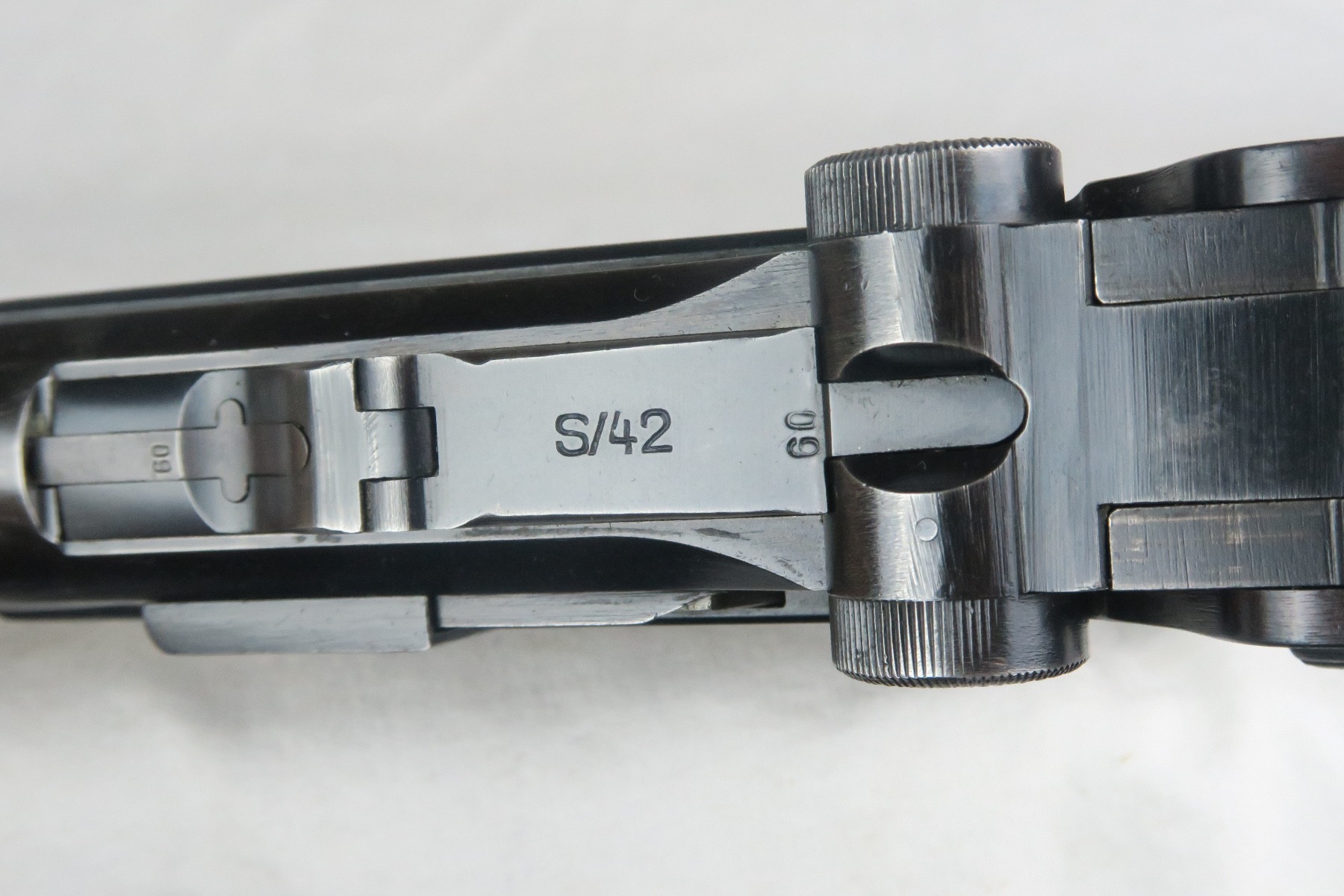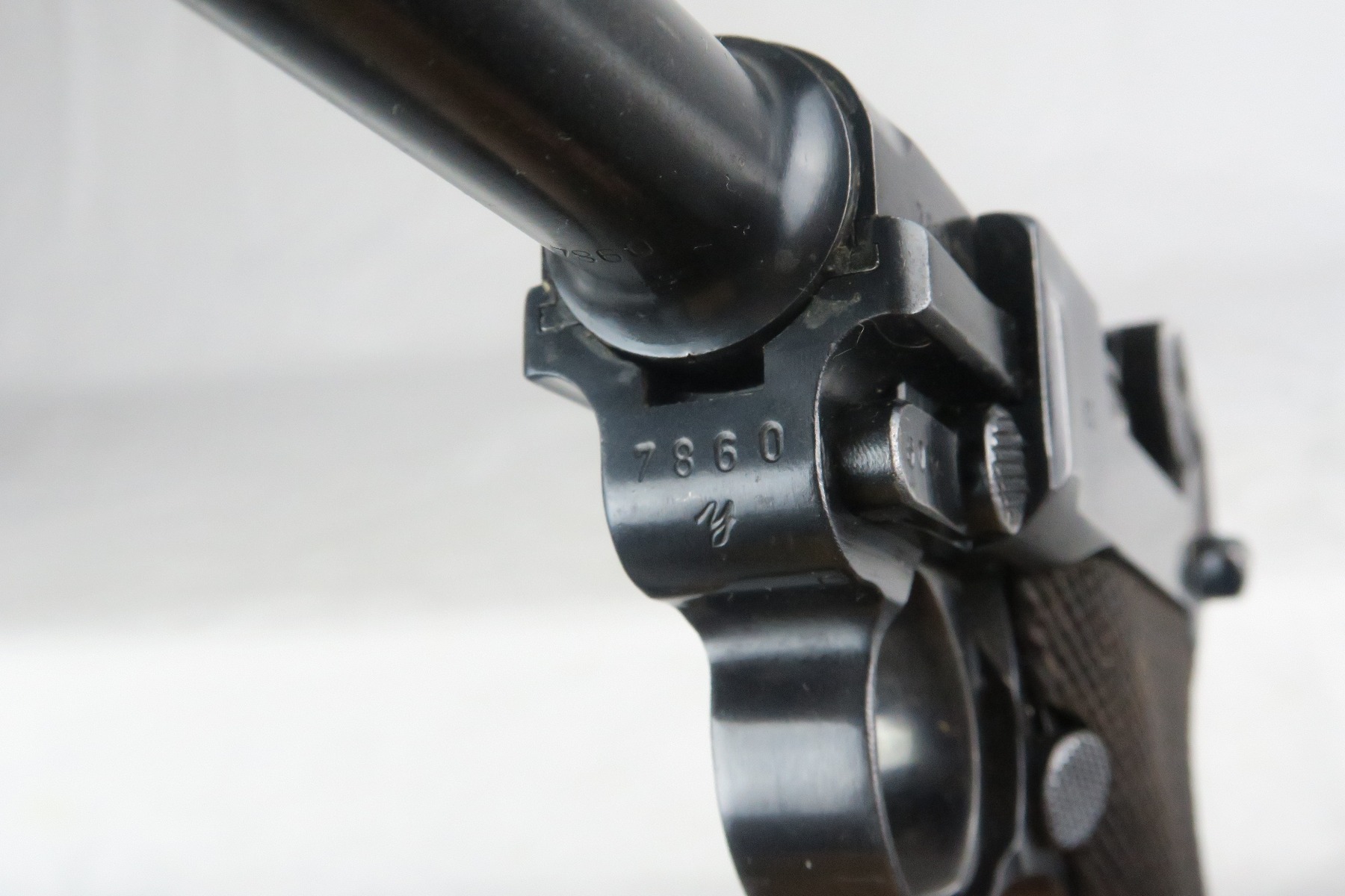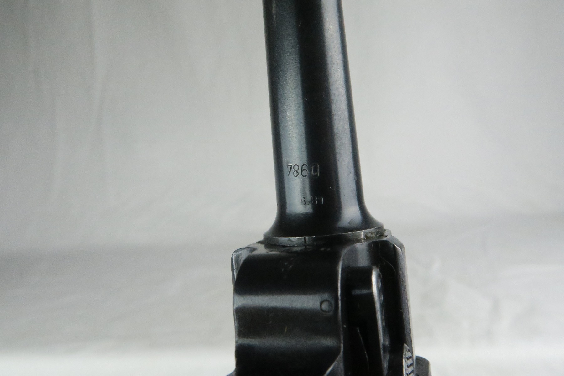 12/20/17 – This is an original and completel Mauser luger rig from 1937.  Included in this listing is a spare magazine with no serial, 1938 dated holster and WaA63 proofed tool.  The pistol has all matching numbers, excluding the magazine and grips.   The finish rates at about 95% with most of the wear on the high edges of the gun. The magazine is the correct variation but numbered to a different pistol, and the grips are unnumbered but appear original to the gun because of fit.  Spare magazine is Eagle/63 proofed but has no serial.  The holster is maker marked and waffen proofed, with 1938 date.  It is in very good condition, with minor cracking on the front.  The bore shows minor frosting but is very good overall.