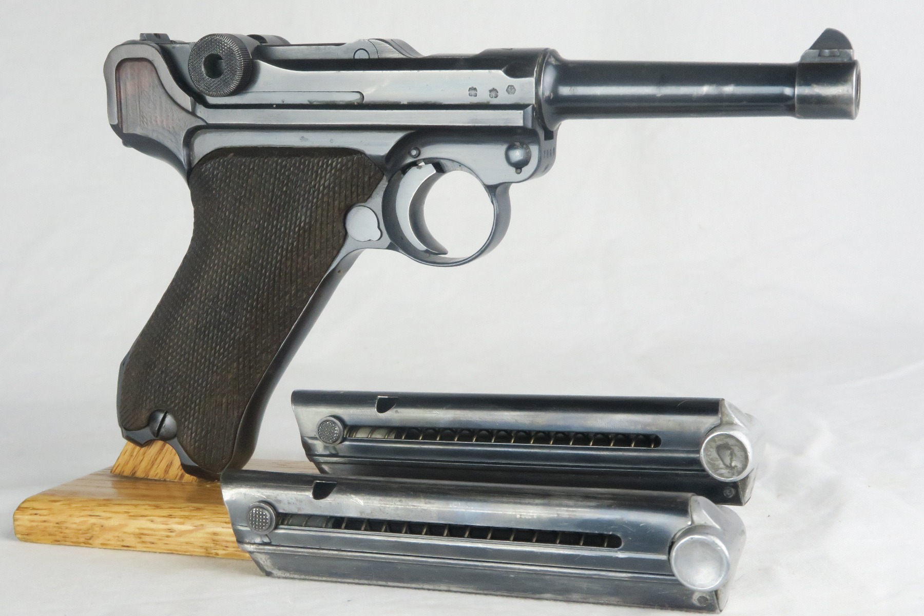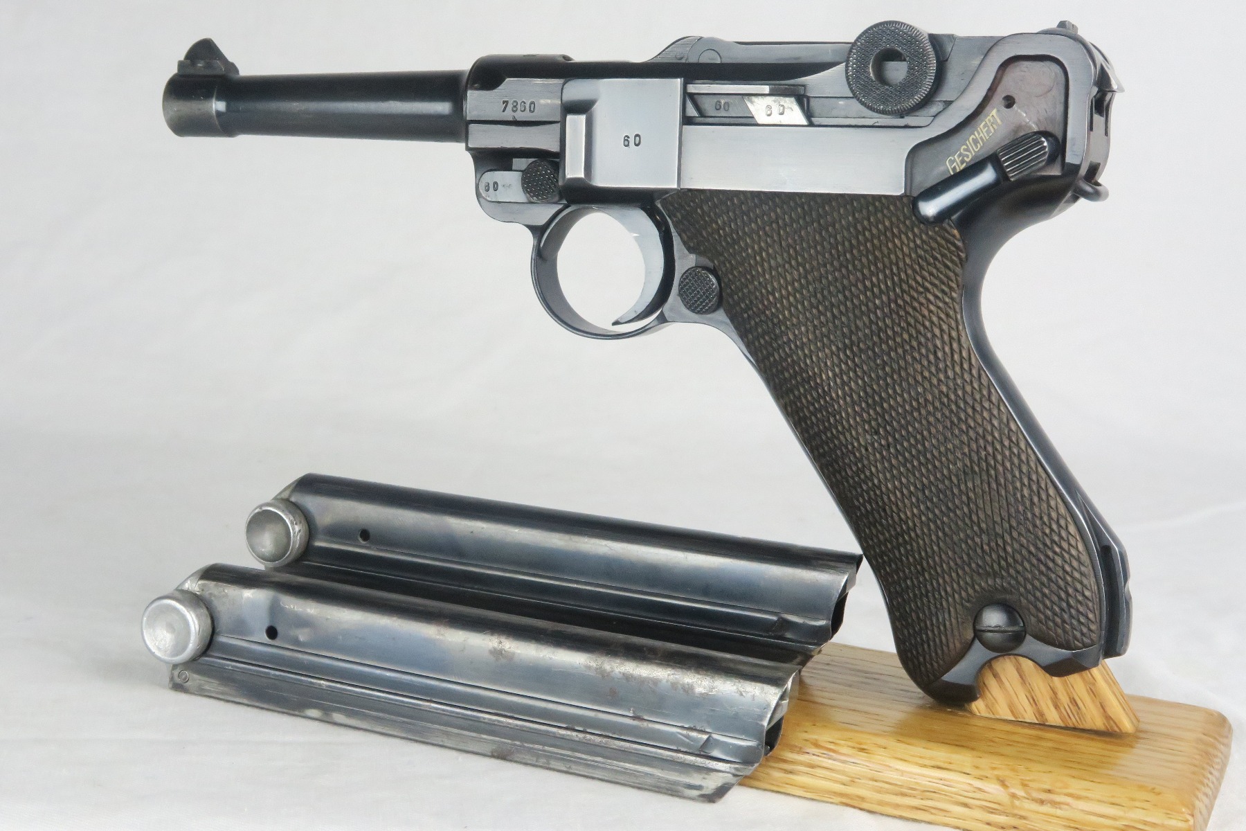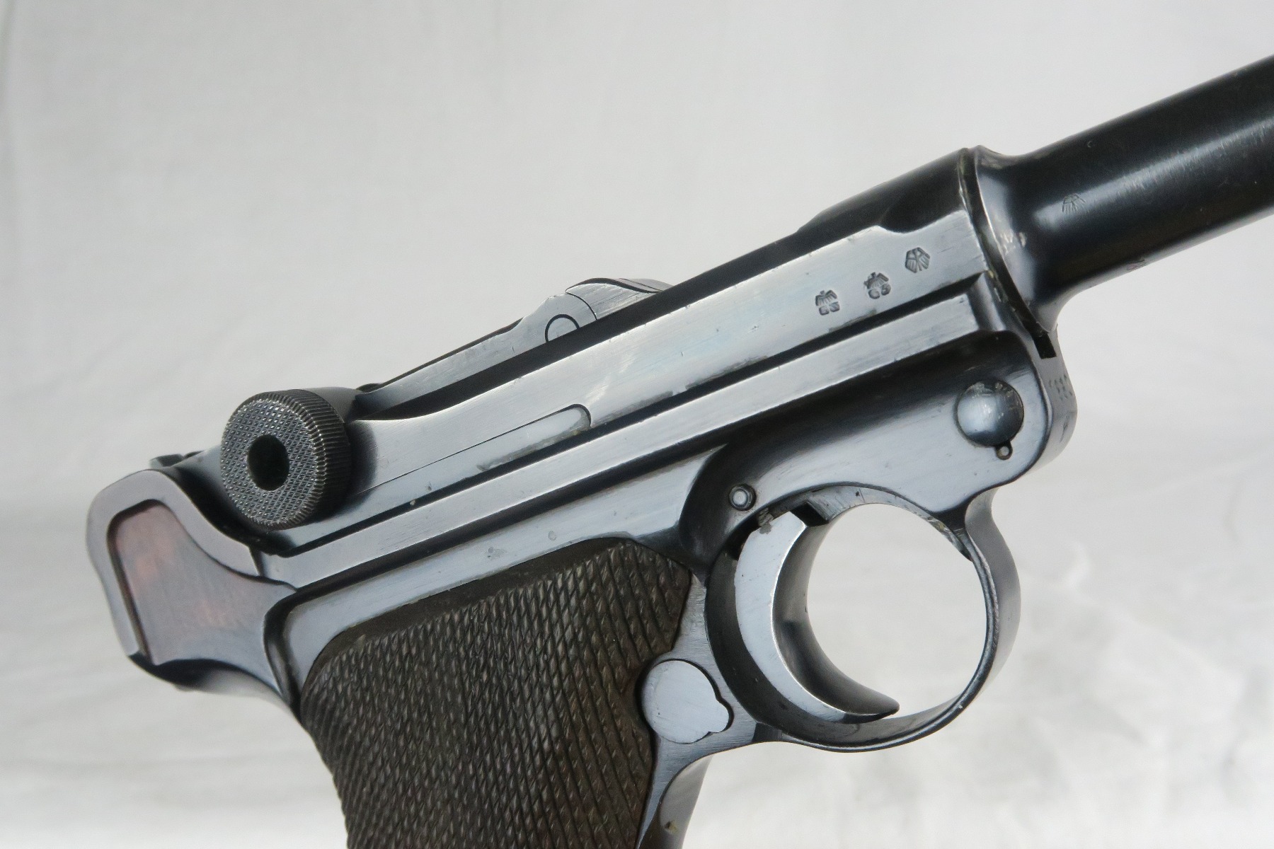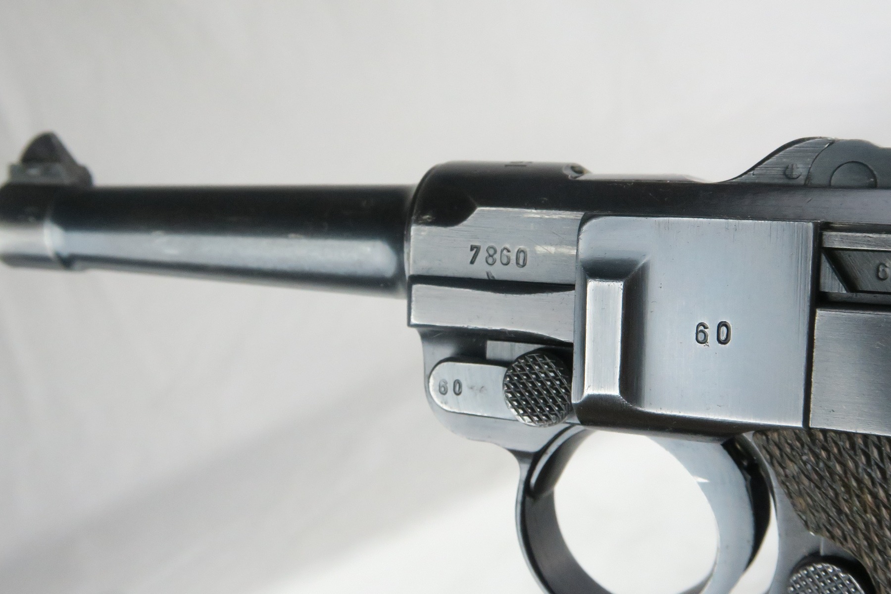 12/20/17 – This is an original and completel Mauser luger rig from 1937.  Included in this listing is a spare magazine with no serial, 1938 dated holster and WaA63 proofed tool.  The pistol has all matching numbers, excluding the magazine and grips.   The finish rates at about 95% with most of the wear on the high edges of the gun. The magazine is the correct variation but numbered to a different pistol, and the grips are unnumbered but appear original to the gun because of fit.  Spare magazine is Eagle/63 proofed but has no serial.  The holster is maker marked and waffen proofed, with 1938 date.  It is in very good condition, with minor cracking on the front.  The bore shows minor frosting but is very good overall.