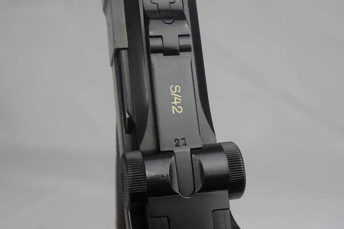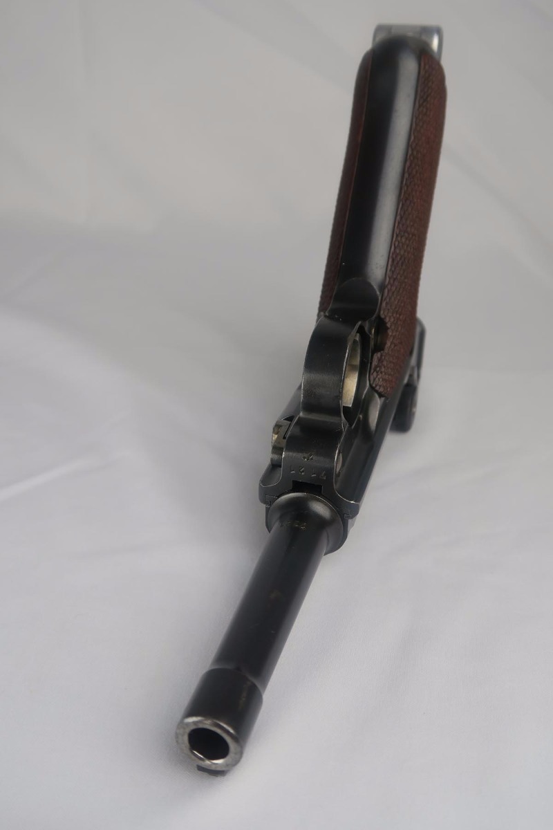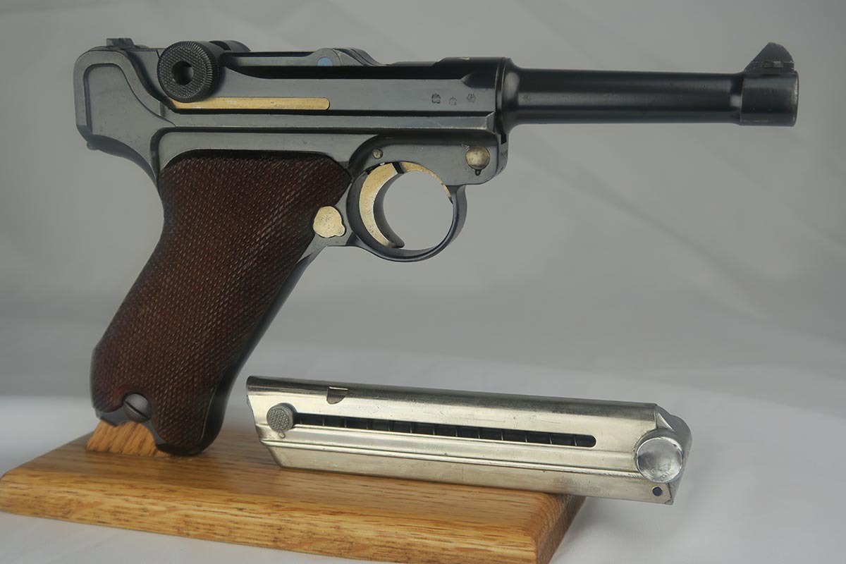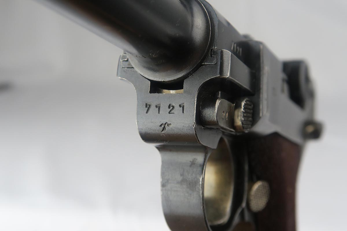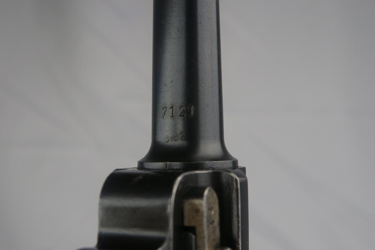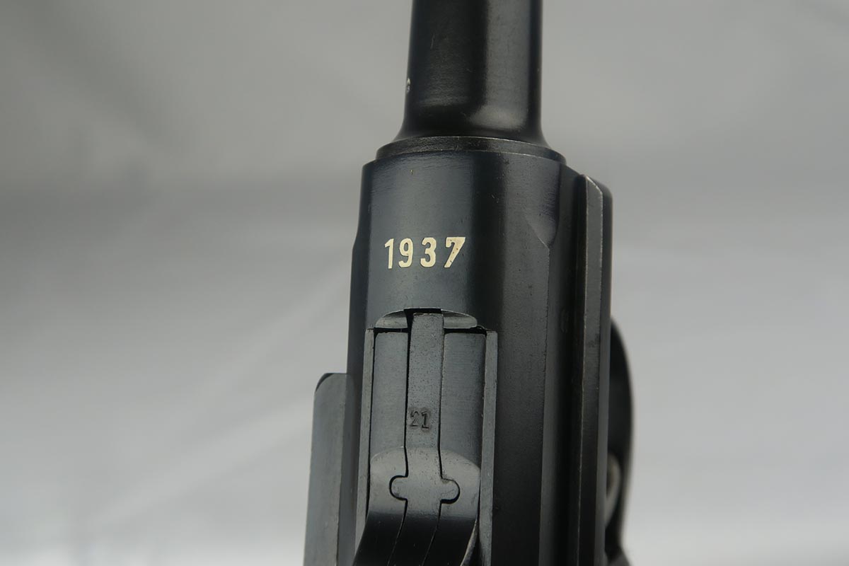 9/8/17 – This is a very nice Mauser luger from 1937, with all matching small parts and grips.  The original finish rates at about 97-98% with only minor muzzle and sideplate wear, plus a spot of finish loss on the very bottom of the front strap.  The magazine is period correct but numbered to another pistol.  Pistol still shows some pretty nice straw remaining on the trigger, mag release, takedown lever and safety.  Excellent bore.
