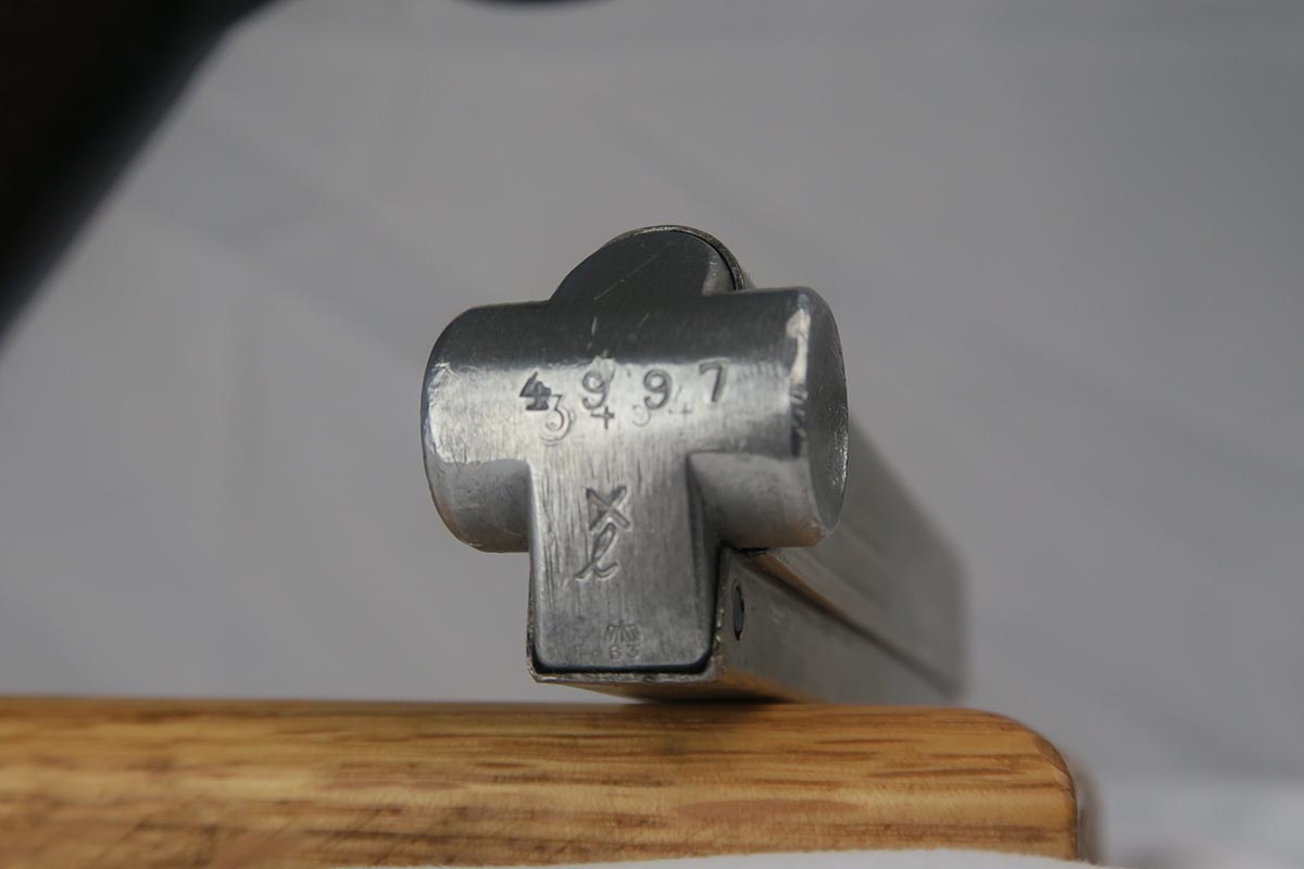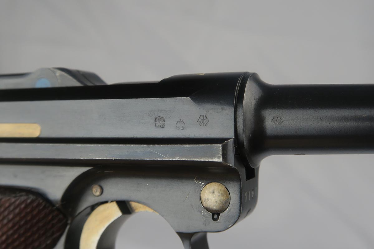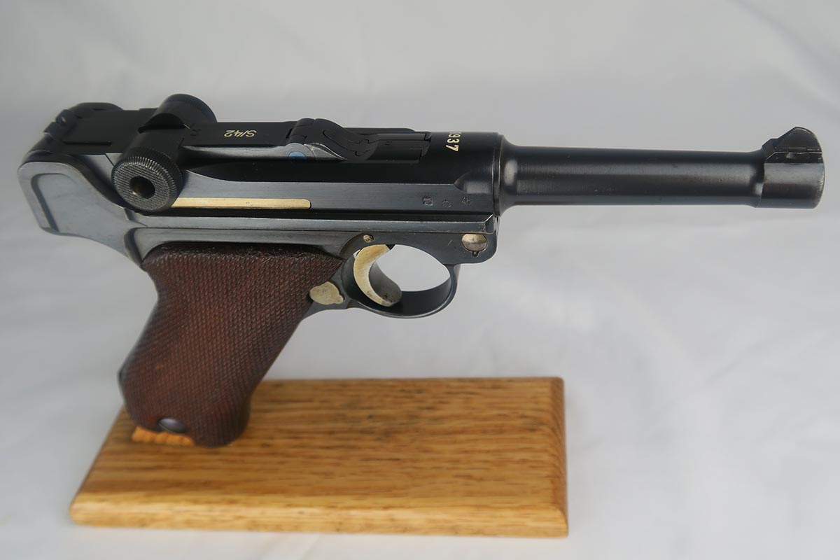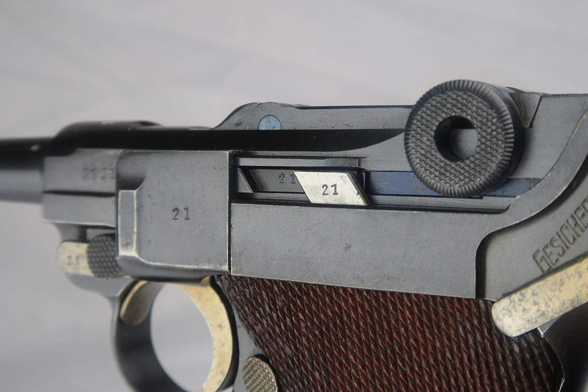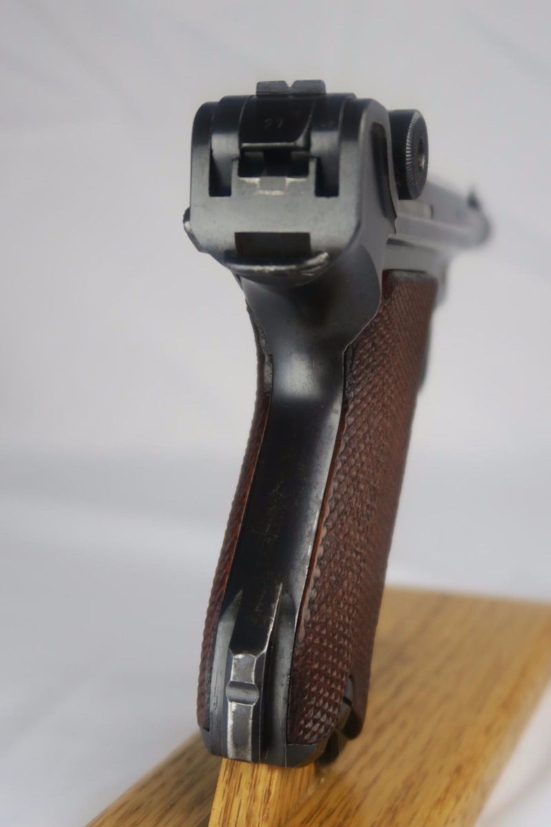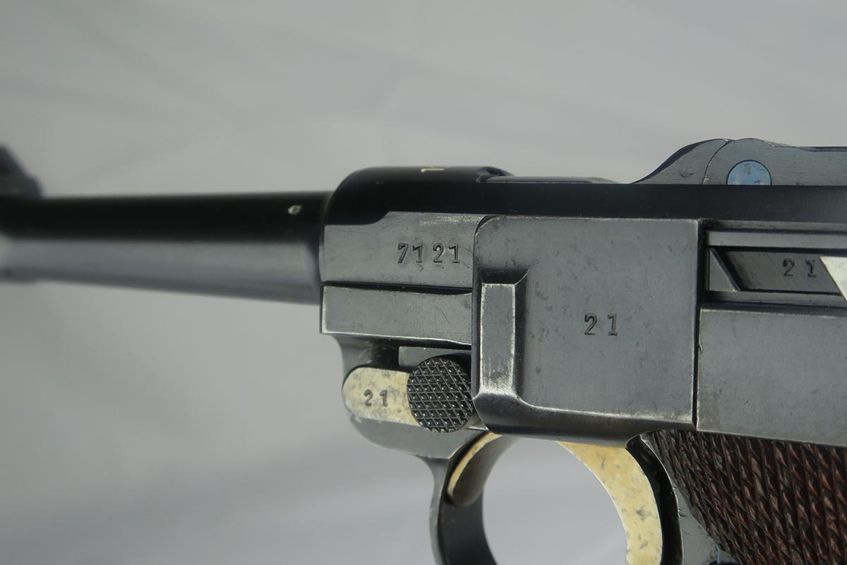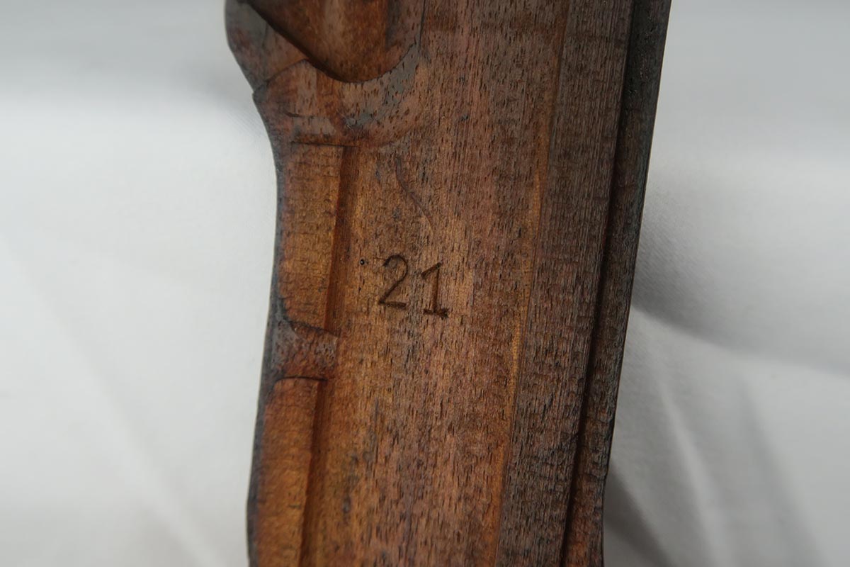 9/8/17 – This is a very nice Mauser luger from 1937, with all matching small parts and grips.  The original finish rates at about 97-98% with only minor muzzle and sideplate wear, plus a spot of finish loss on the very bottom of the front strap.  The magazine is period correct but numbered to another pistol.  Pistol still shows some pretty nice straw remaining on the trigger, mag release, takedown lever and safety.  Excellent bore.