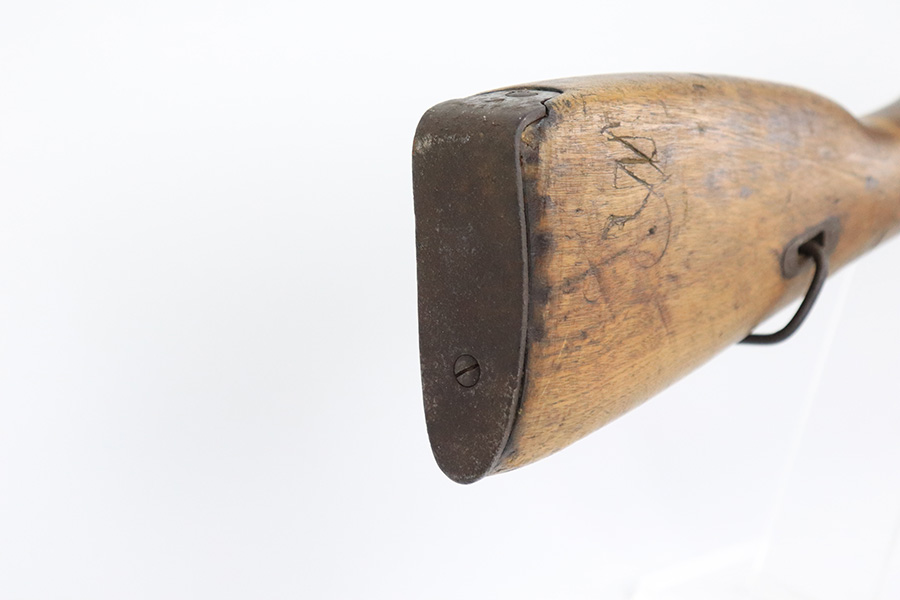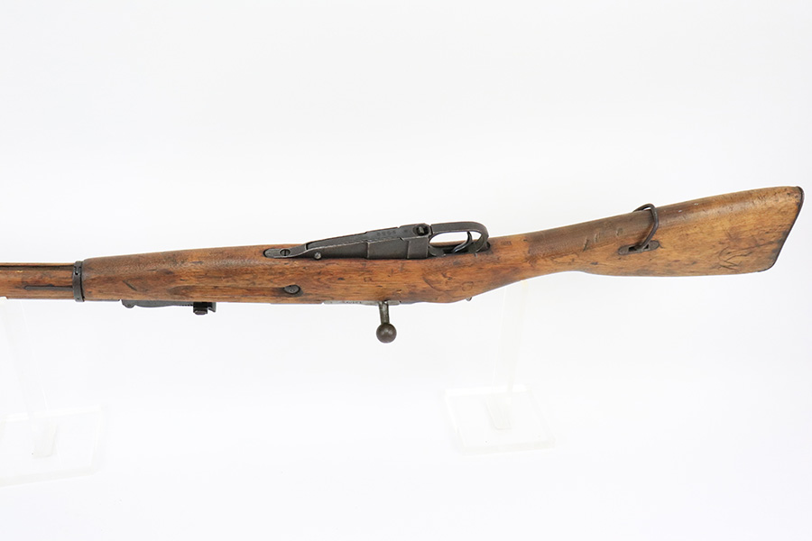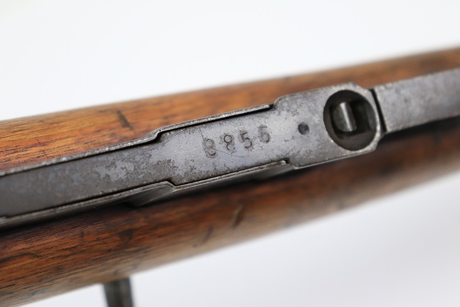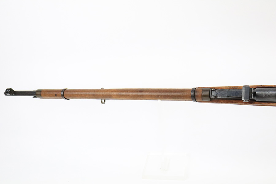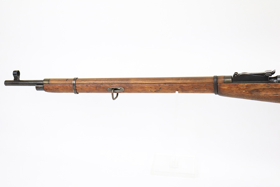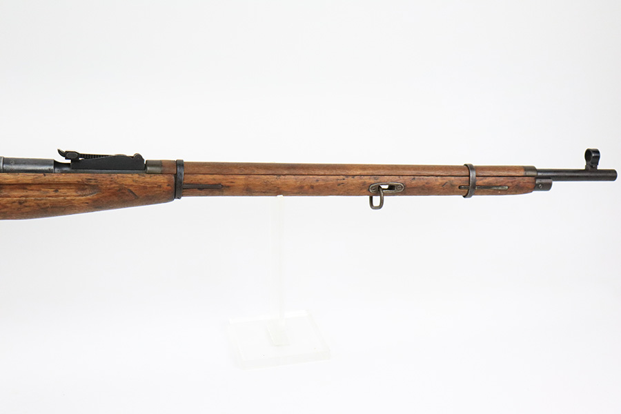 8/31/22 – This is a nice example of a Mosin Nagant Model 91/30 manufactured in 1937. From its unique features, such as 1947 date, lack of modern import stamps, its wire sling swivels, and heavily sanded stock, we believe this gun was issued to Spanish forces during the Spanish Civil War (1936-39). This one is mostly mismatched but in nice condition overall. There is light scratchy wear on the receiver and spotty oxidation on the barrel. Some areas of heavier oxidation on the barrel bands and magazine. Some spotty surface rust and heavy oxidation on the butt plate. The stock has been heavily sanded, and there are noticeable dings, bruises, and scratches throughout. The gun is missing its cleaning rod. The bore has decent rifling, with noticeable oxidation in the grooves.