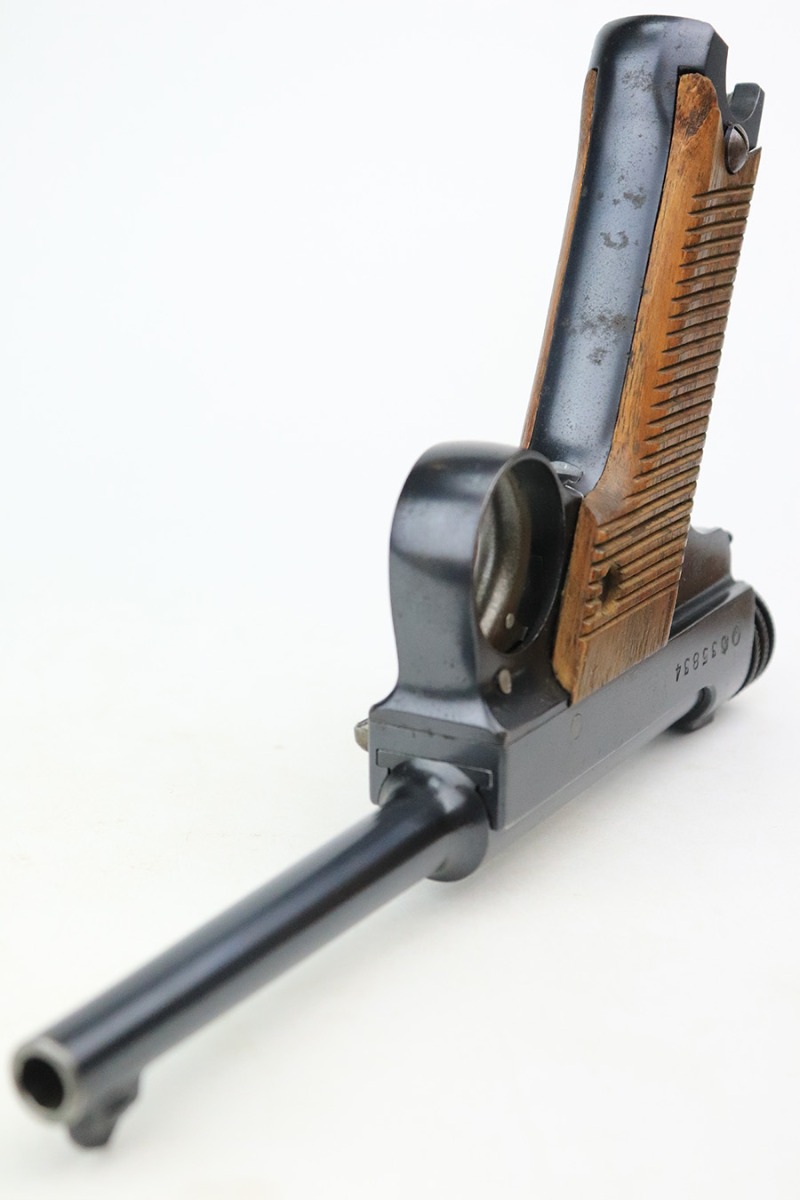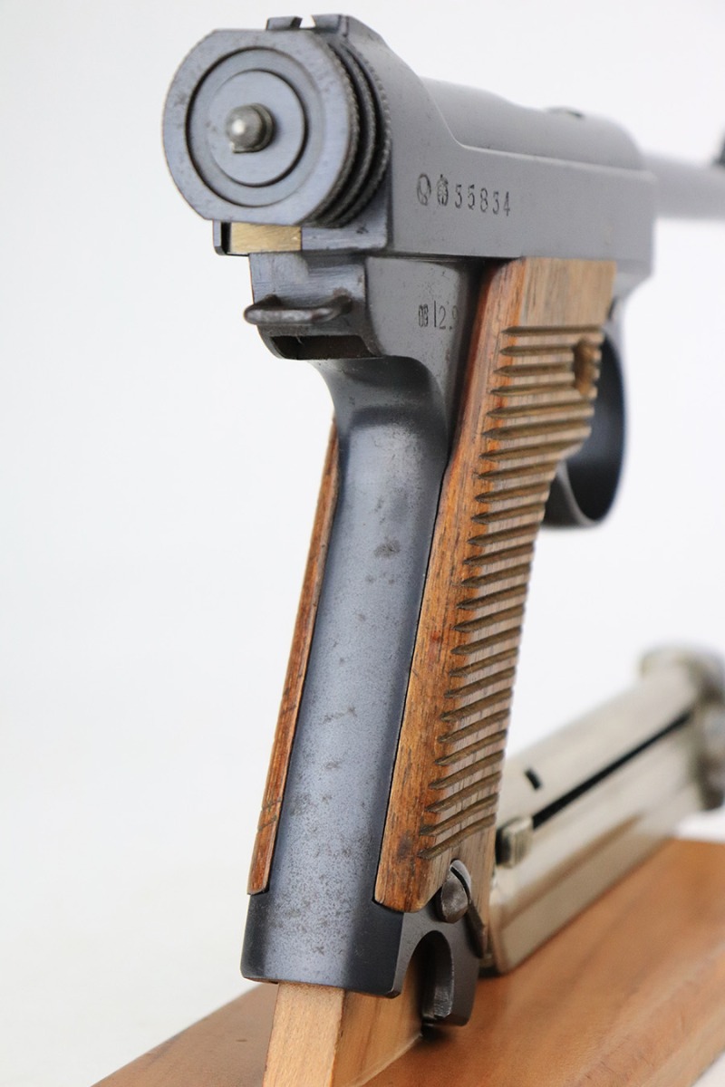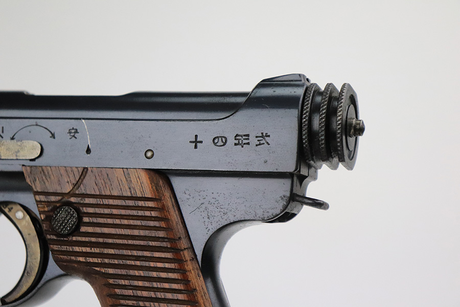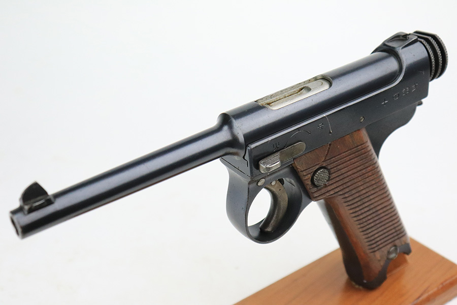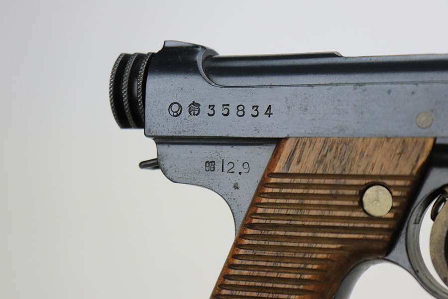 8/11/22 – This is an excellent example of an early Nambu Type 14 issued to the Japanese military in September of 1937. The gun is all matching and comes with one original matching-numbered magazine. It has retained about 98% of its original finish. While there is next-to-no actual bluing loss, there is some freckling on both sides of the frame and on the grip straps. A couple of small spots of tiny pitting on the front strap. Comes with excellent wood grips that are hand-numbered to match the gun. The bore is near-mint.
