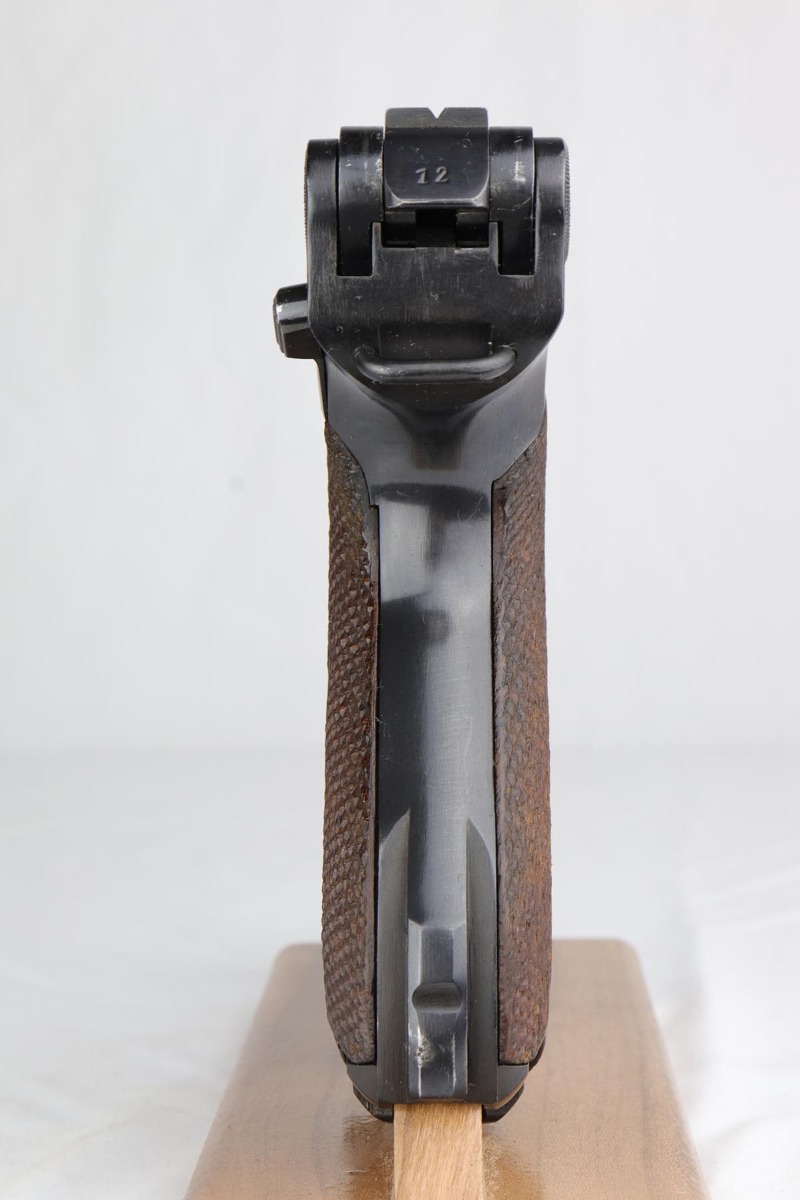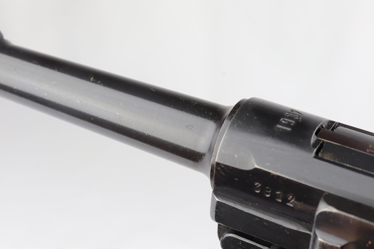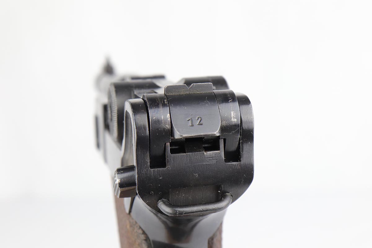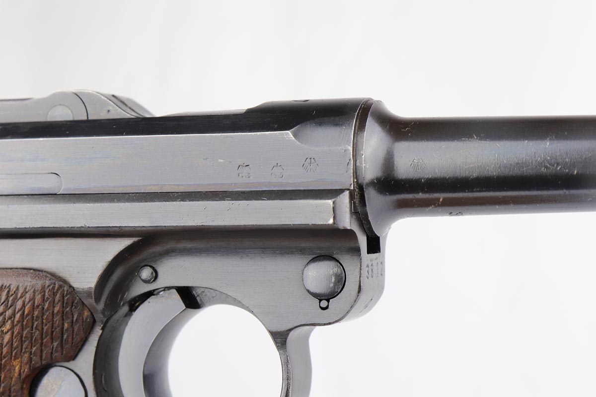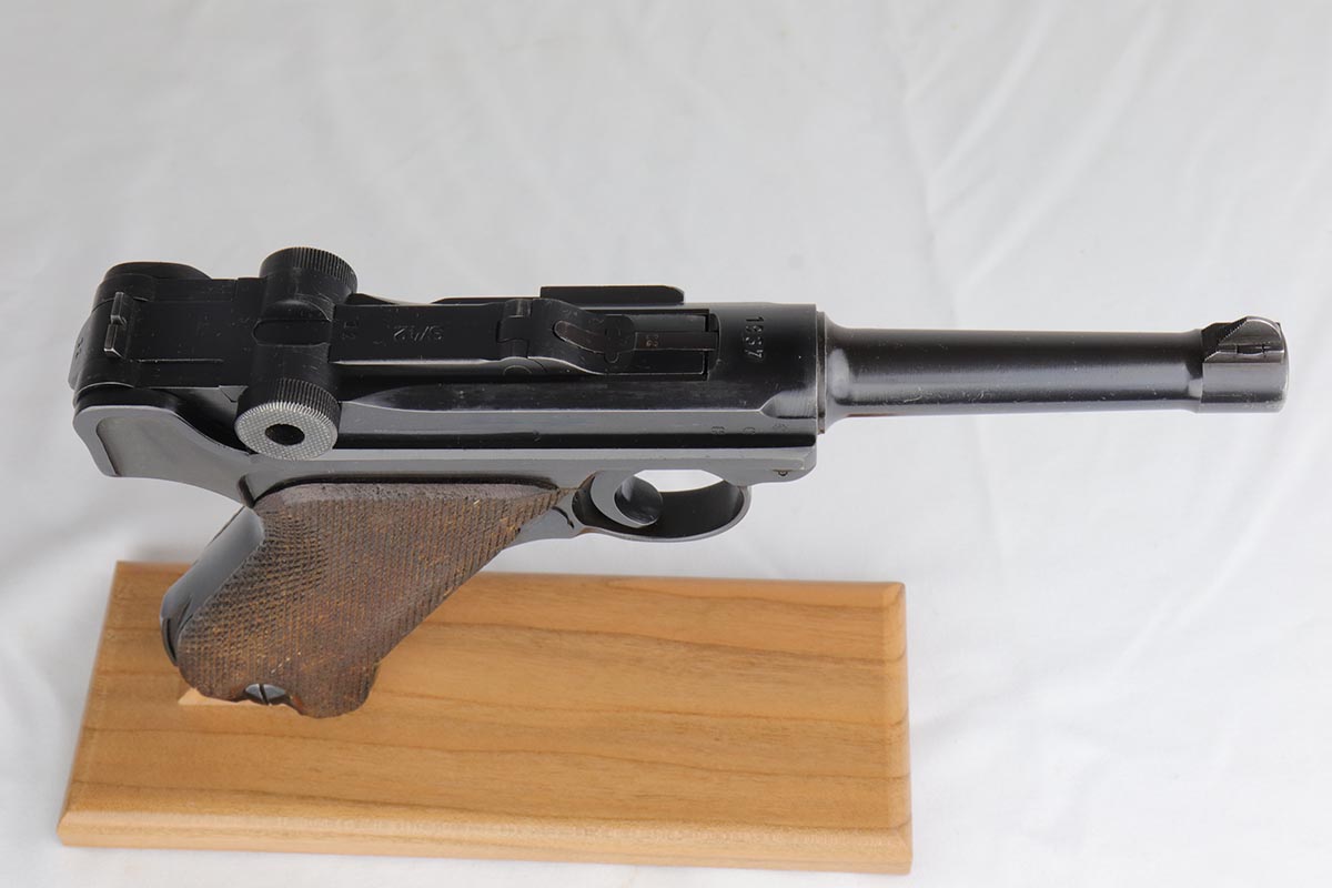 3/1/19 – This is a fantastic 1937 Nazi Mauser Luger with O-propery Naval marking on the front strap. The pistol is all original and matching with 98% blue remaining, showing minor muzzle and side plate wear, as well as a few small scratches on the left side frame. It is a second variation 1937 pistol with blued small parts. Matching, original grips. 1937 is the most rare World War II era date for Navy Lugers, with only a few hundred estimated. However, we are not certain this property marking is original after comparing to a couple others we’ve offered. Take a look at the photo and compare for yourself. The pistol comes with a matching numbered magazine with matching property mark but the numbering on the magazine is not original. The frame also has a GERMANY export mark above the serial, which isn’t something we’ve seen on a World War II Luger before but we can’t see any signs of renumbering on the gun or other alterations. Excellent, shiny bore.