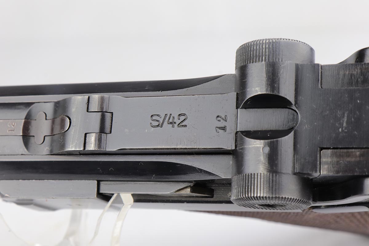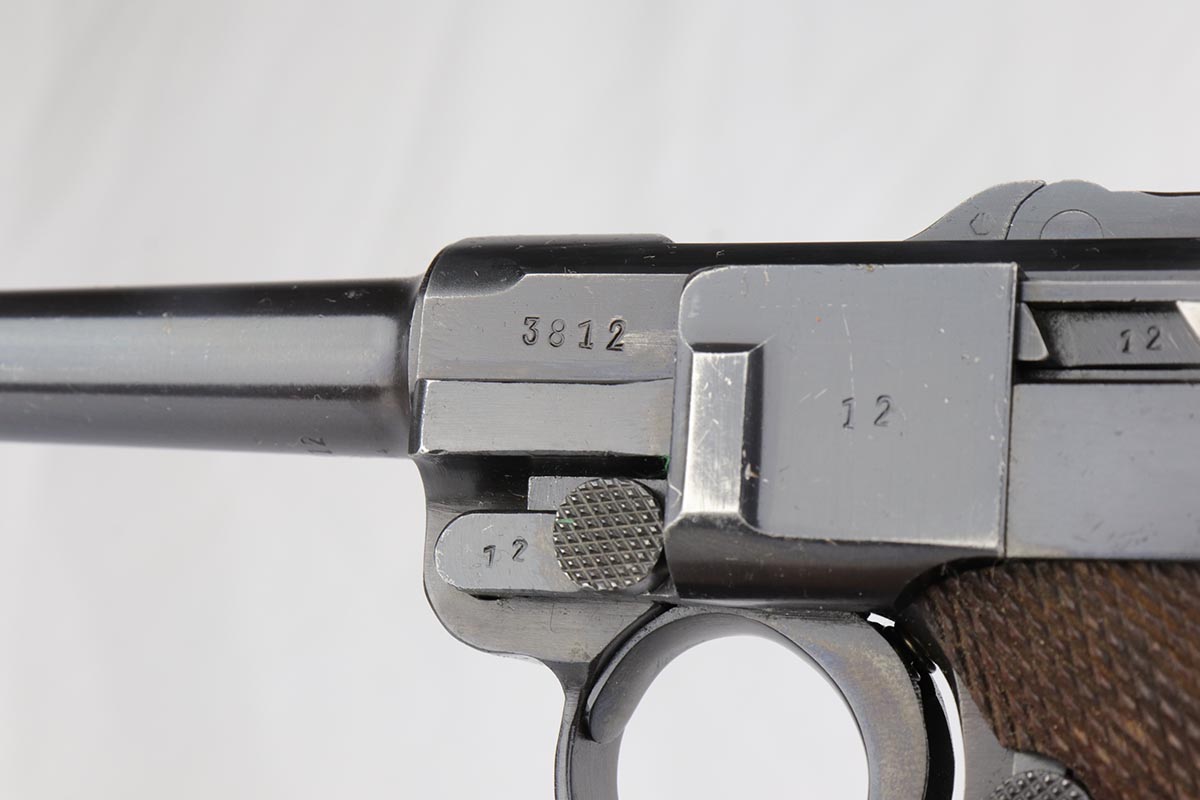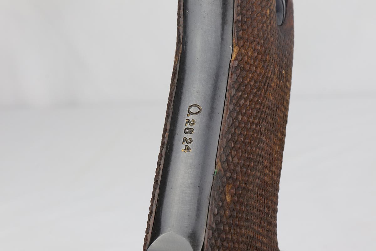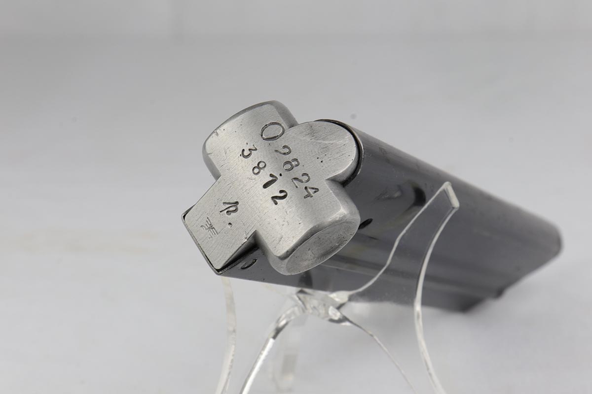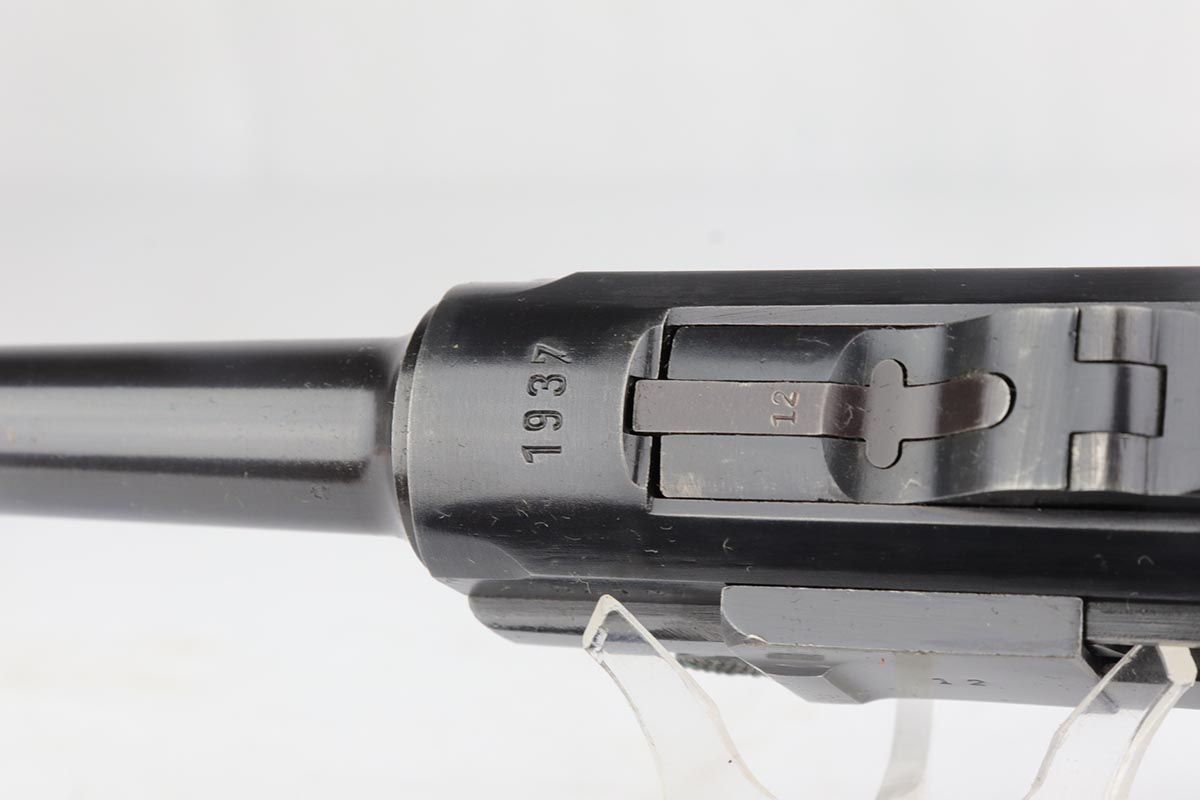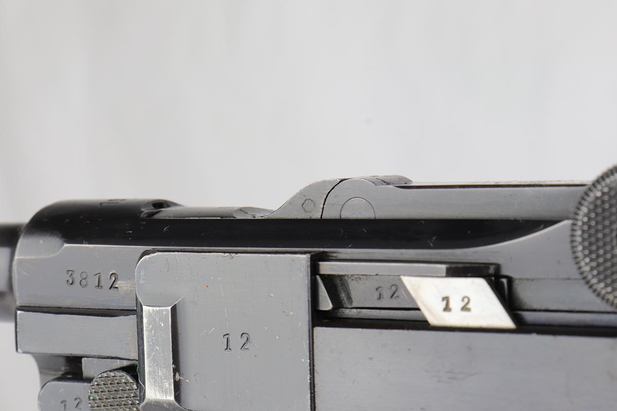 3/1/19 – This is a fantastic 1937 Nazi Mauser Luger with O-propery Naval marking on the front strap. The pistol is all original and matching with 98% blue remaining, showing minor muzzle and side plate wear, as well as a few small scratches on the left side frame. It is a second variation 1937 pistol with blued small parts. Matching, original grips. 1937 is the most rare World War II era date for Navy Lugers, with only a few hundred estimated. However, we are not certain this property marking is original after comparing to a couple others we’ve offered. Take a look at the photo and compare for yourself. The pistol comes with a matching numbered magazine with matching property mark but the numbering on the magazine is not original. The frame also has a GERMANY export mark above the serial, which isn’t something we’ve seen on a World War II Luger before but we can’t see any signs of renumbering on the gun or other alterations. Excellent, shiny bore.