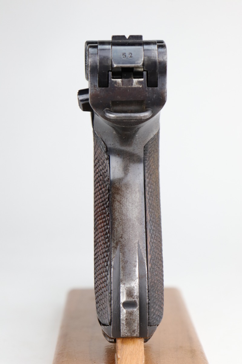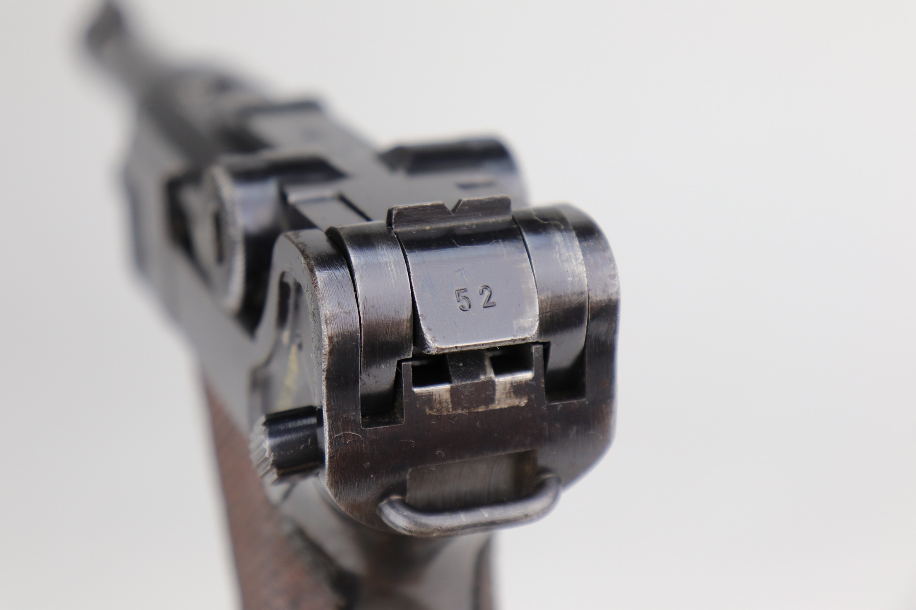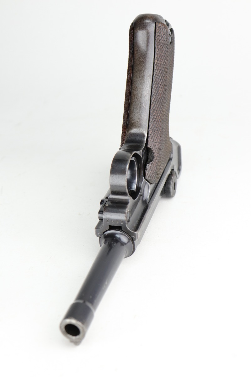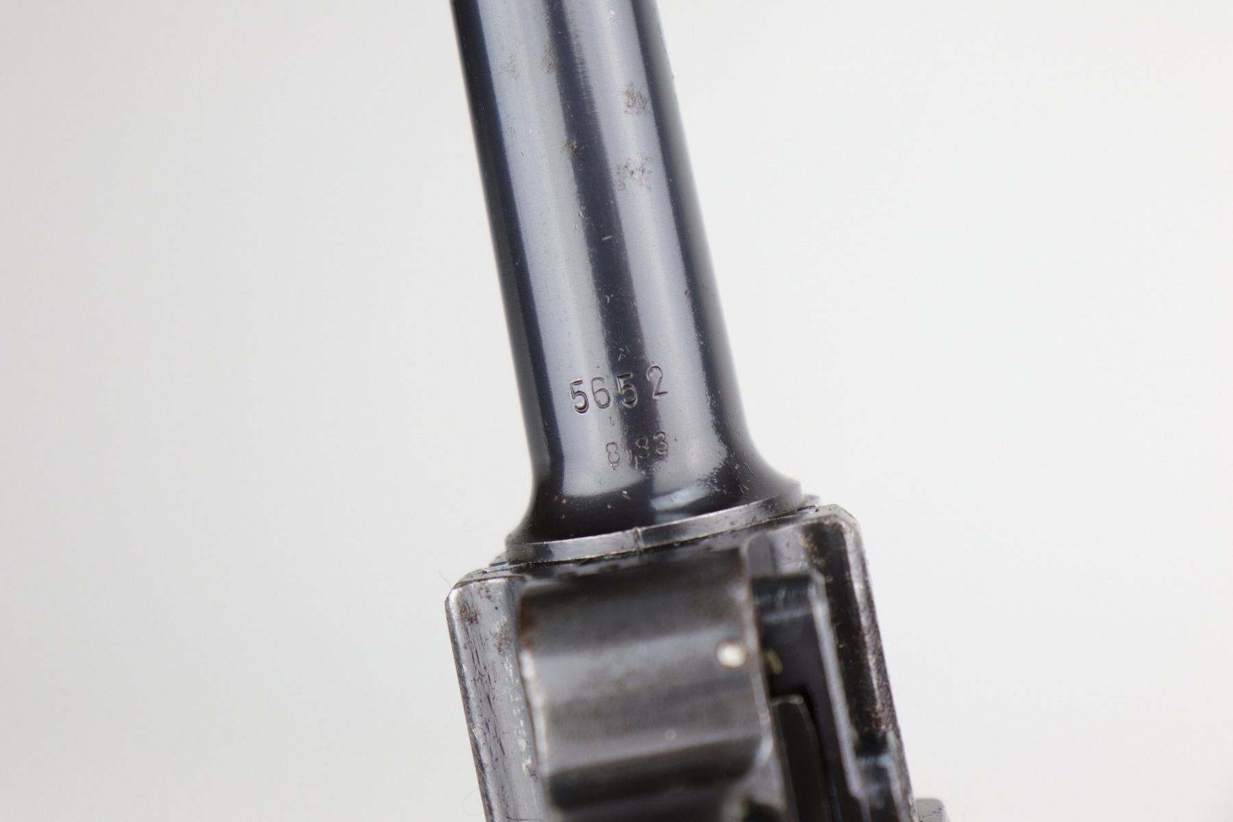 12/15/20 – This is a nice example of a Luger P.08 issued to the Nazi military in 1937. It is all matching and has the proper “Eagle 63” Nazi military acceptance proofs. This one has retained roughly 70% of its original bluing. Most of the wear is on the straps. There is also spotty wear around the muzzle, on the barrel, side plate, and high edges of the slide. There is spotty oxidation throughout but most noticeable on the straps. Comes with excellent original matching grips and a mismatched magazine. The bore is excellent – shiny with strong rifling.