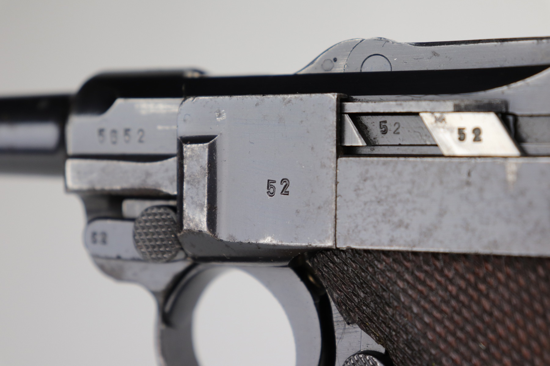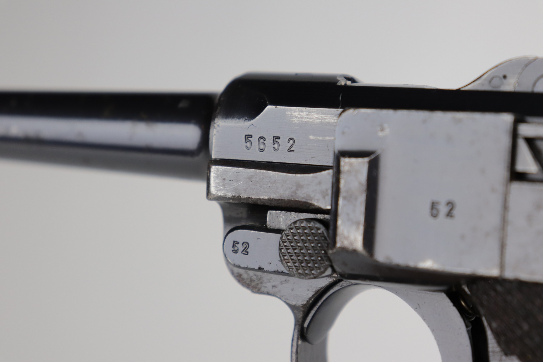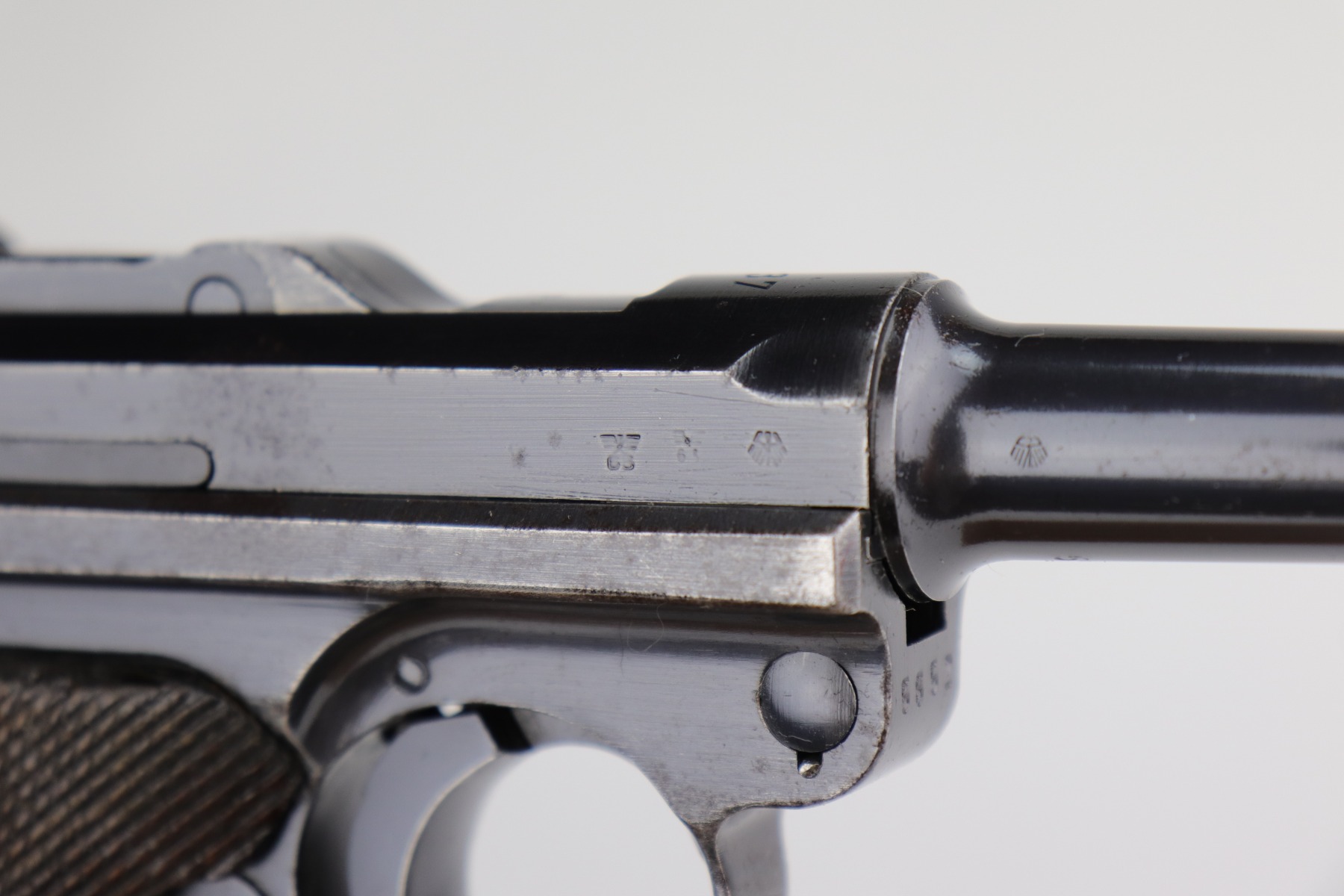 12/15/20 – This is a nice example of a Luger P.08 issued to the Nazi military in 1937. It is all matching and has the proper “Eagle 63” Nazi military acceptance proofs. This one has retained roughly 70% of its original bluing. Most of the wear is on the straps. There is also spotty wear around the muzzle, on the barrel, side plate, and high edges of the slide. There is spotty oxidation throughout but most noticeable on the straps. Comes with excellent original matching grips and a mismatched magazine. The bore is excellent – shiny with strong rifling.