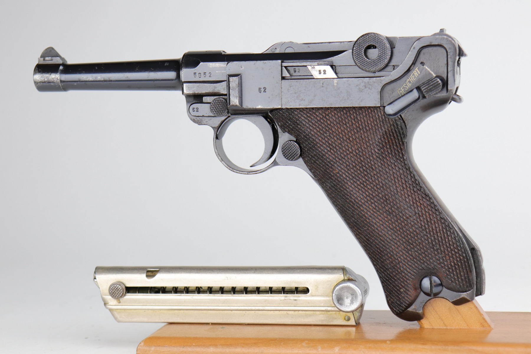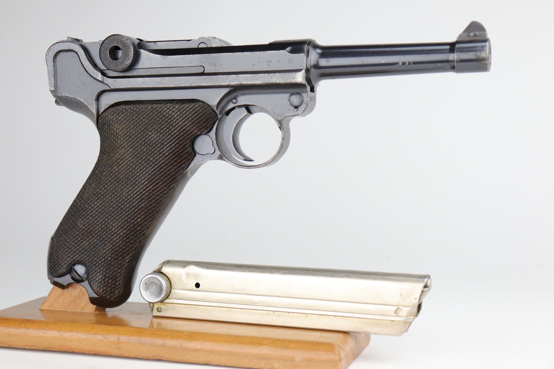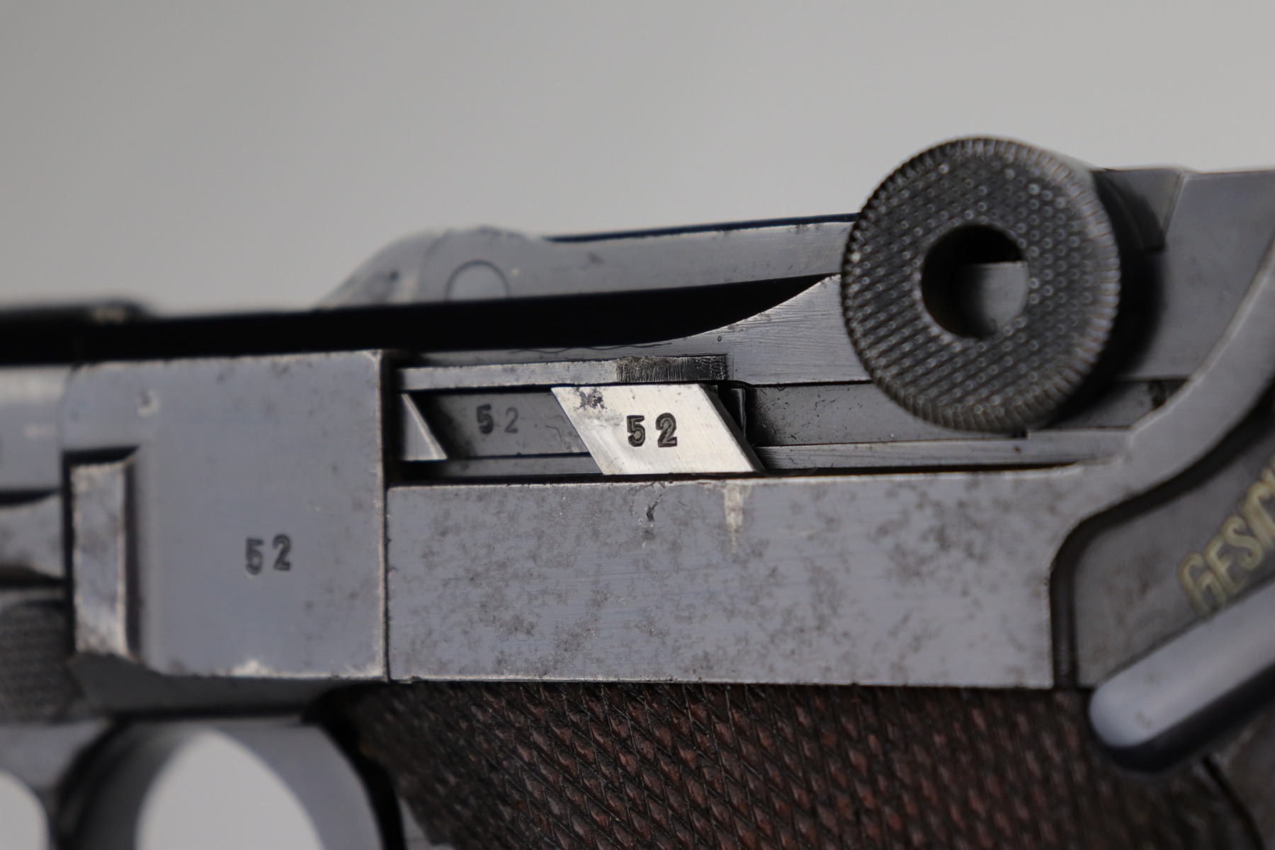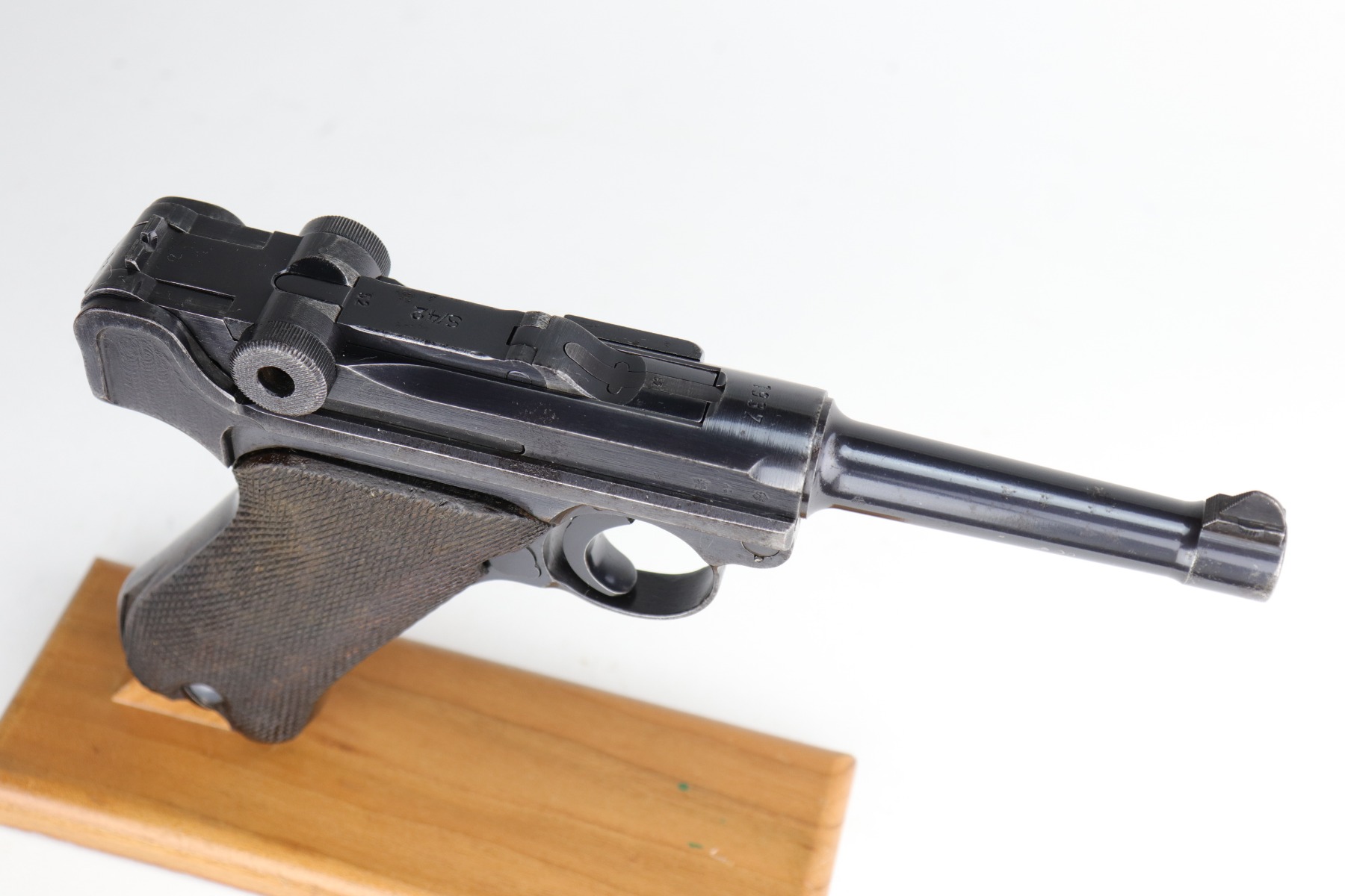 12/15/20 – This is a nice example of a Luger P.08 issued to the Nazi military in 1937. It is all matching and has the proper “Eagle 63” Nazi military acceptance proofs. This one has retained roughly 70% of its original bluing. Most of the wear is on the straps. There is also spotty wear around the muzzle, on the barrel, side plate, and high edges of the slide. There is spotty oxidation throughout but most noticeable on the straps. Comes with excellent original matching grips and a mismatched magazine. The bore is excellent – shiny with strong rifling.
