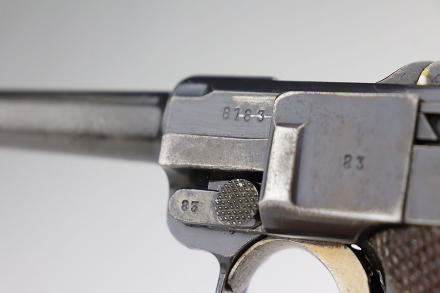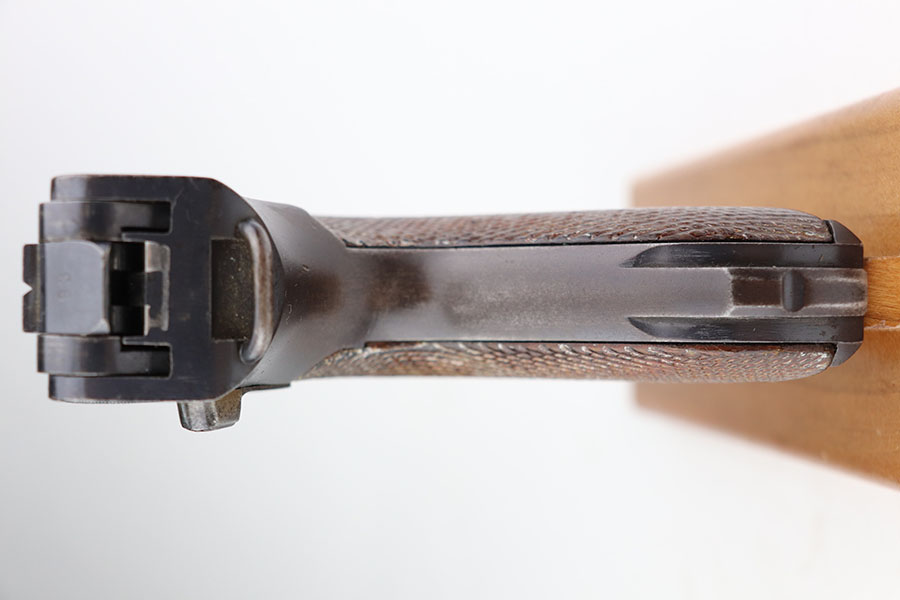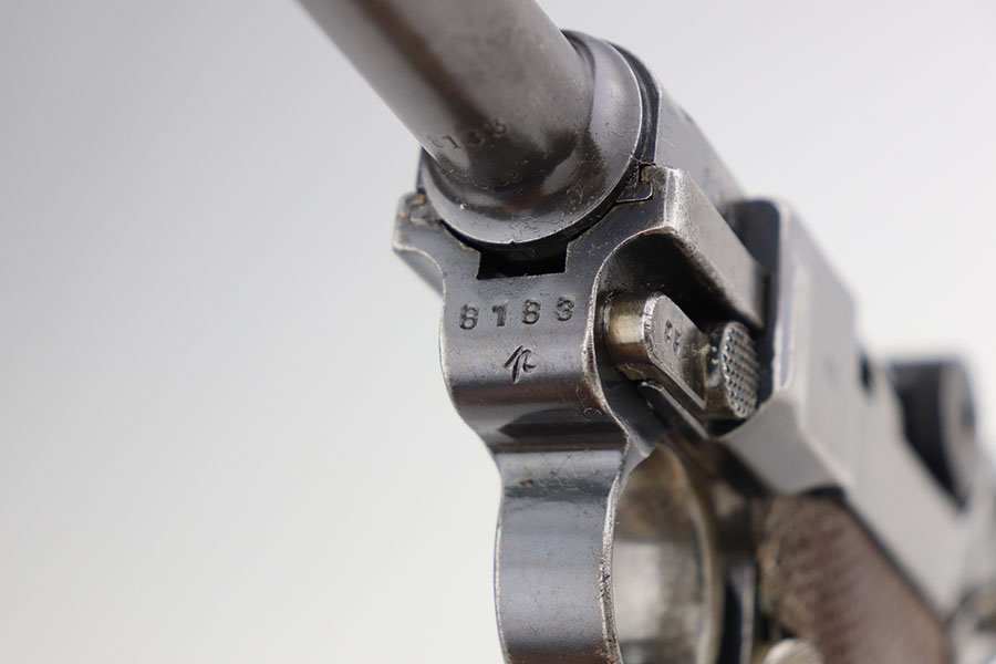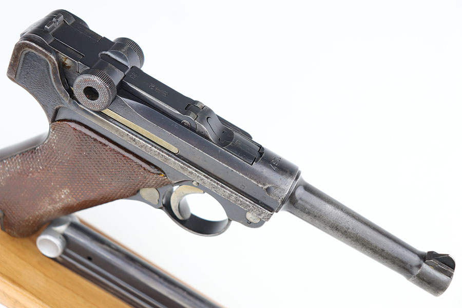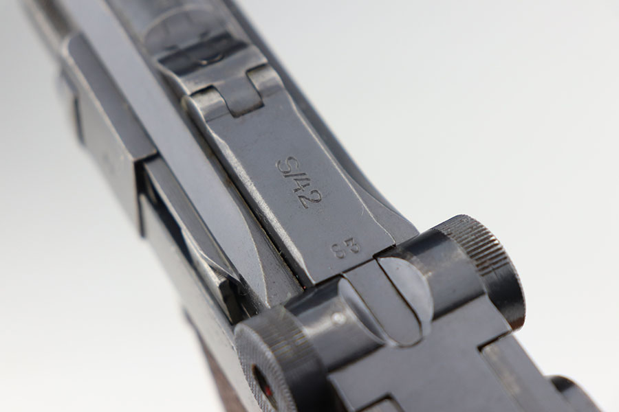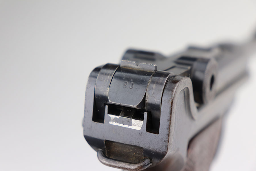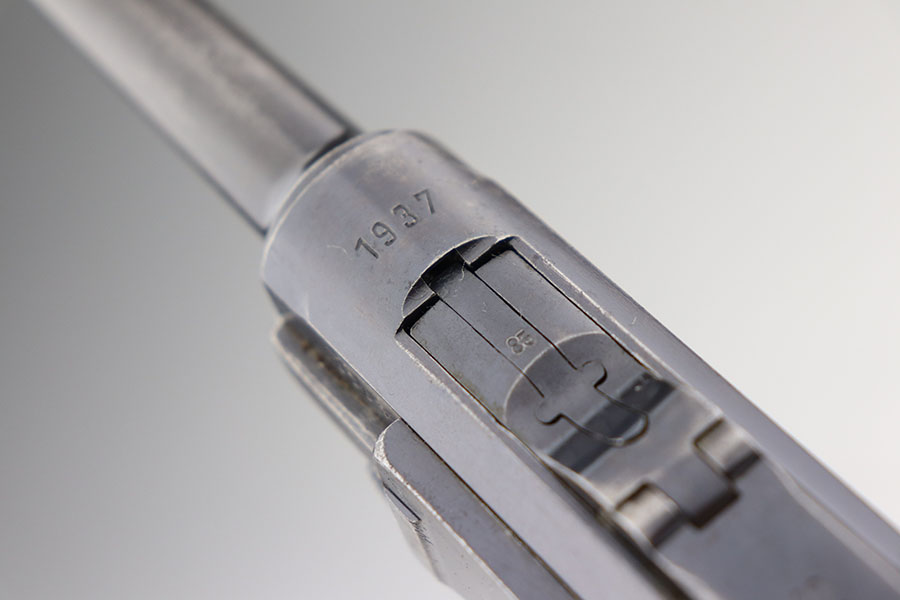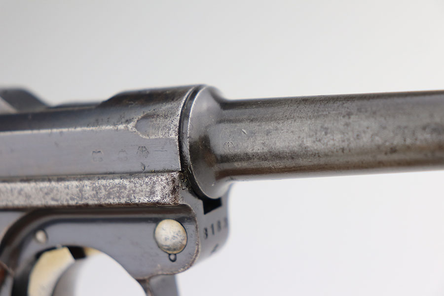 1/26/21 – This is a matching and original Nazi Mauser Luger from 1937. All numbers matching throughout, with unmarked grips and a period original but mismatched magazine. Bluing is original throughout but obviously worn, especially on the straps. The grips fit perfectly but have been lacquered. Bore has some rifling but frost and freckling throughout.