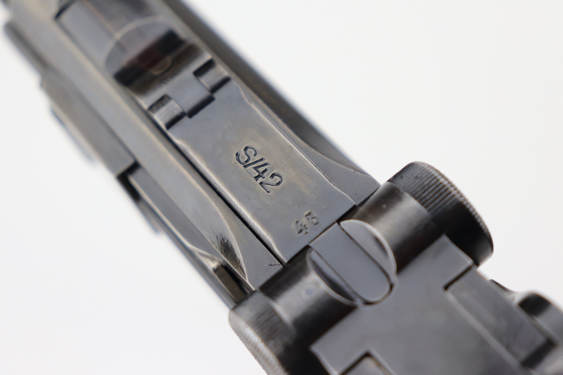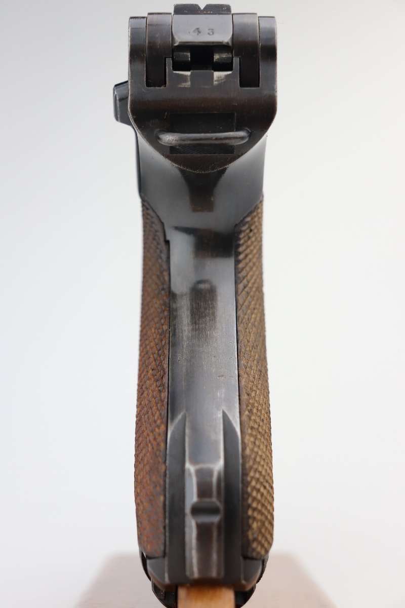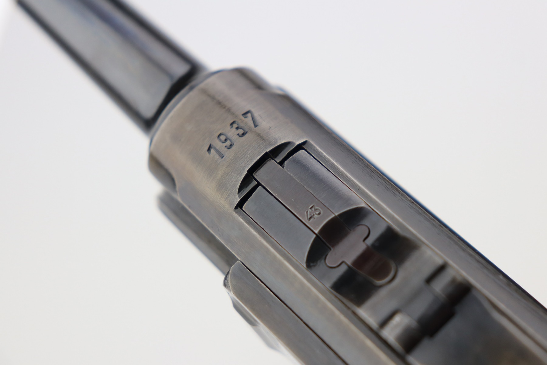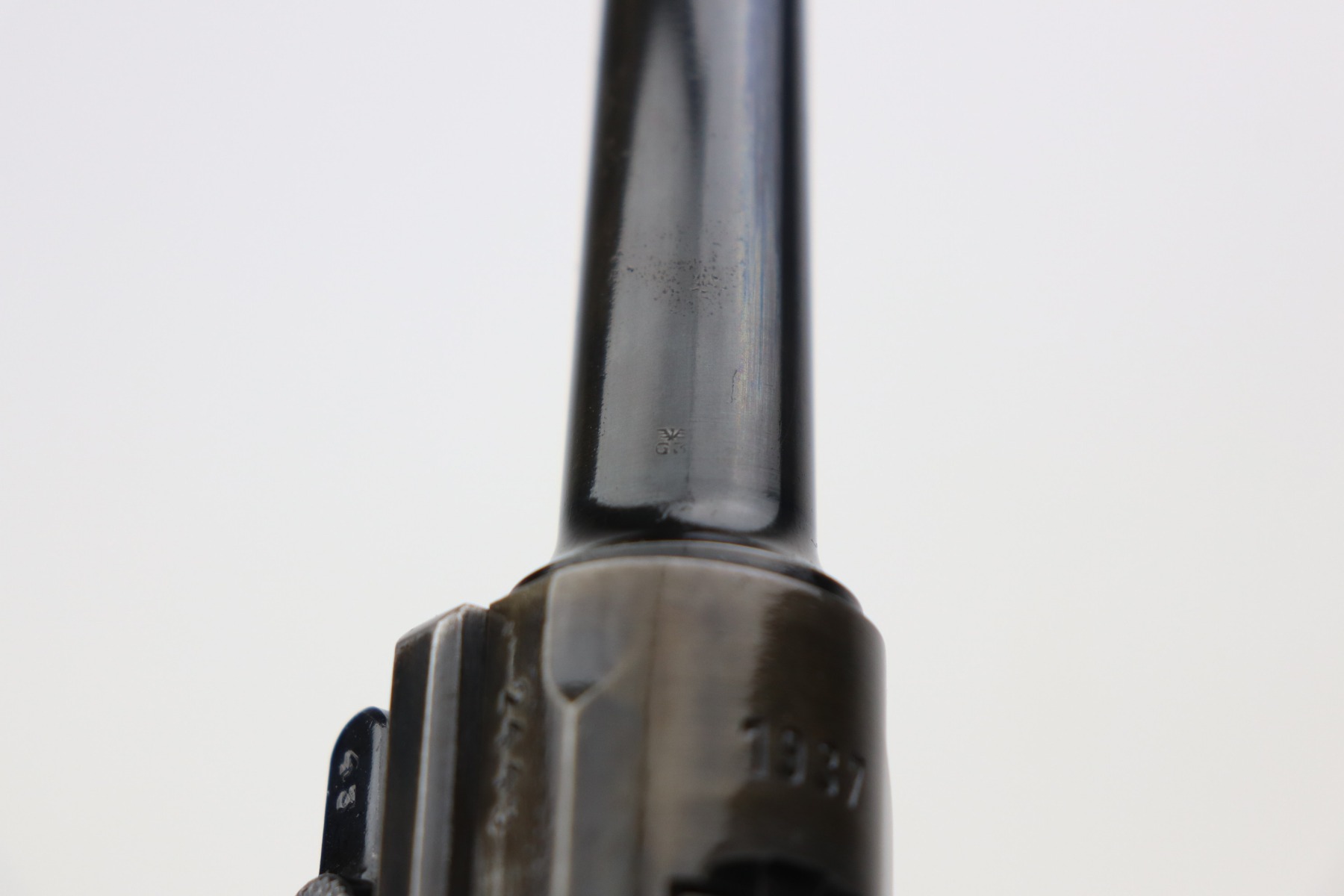 3/8/21 – This is a very nice example of a Mauser Luger issued to the Nazi military in 1937. It is all matching and has the proper “Eagle 63” military proofs. The gun has retained roughly 85% of its bluing. There is thinning on the straps and on the chamber and sides of the slide. Minor wear on the side plate and high edges of the slide. Some spotty discoloration on the side plate. Small areas of very light pitting on the barrel. Comes with excellent matching grips – very small chip in the left panel. Comes with a period-correct magazine that has been re-numbered. Mint bore.