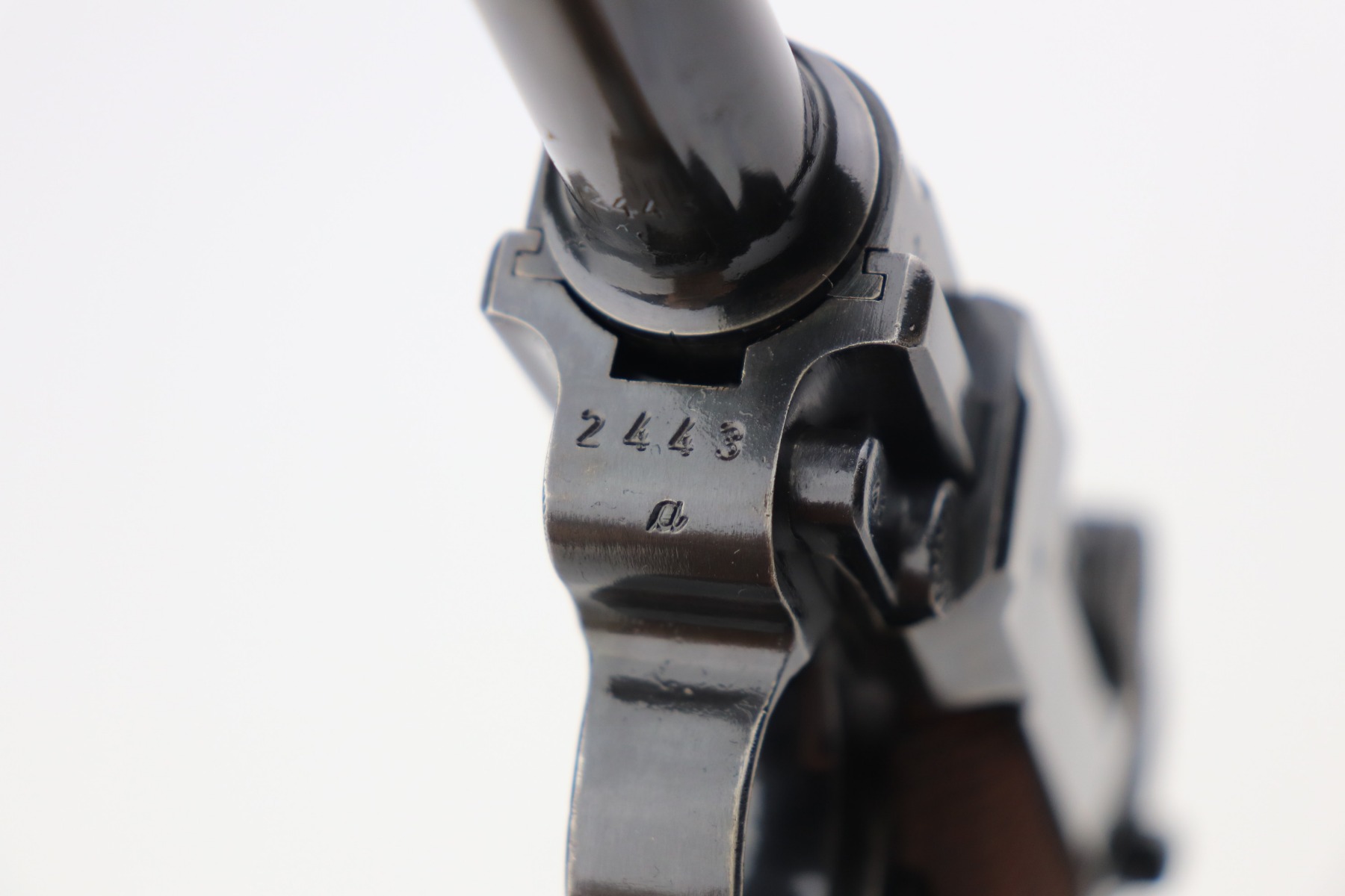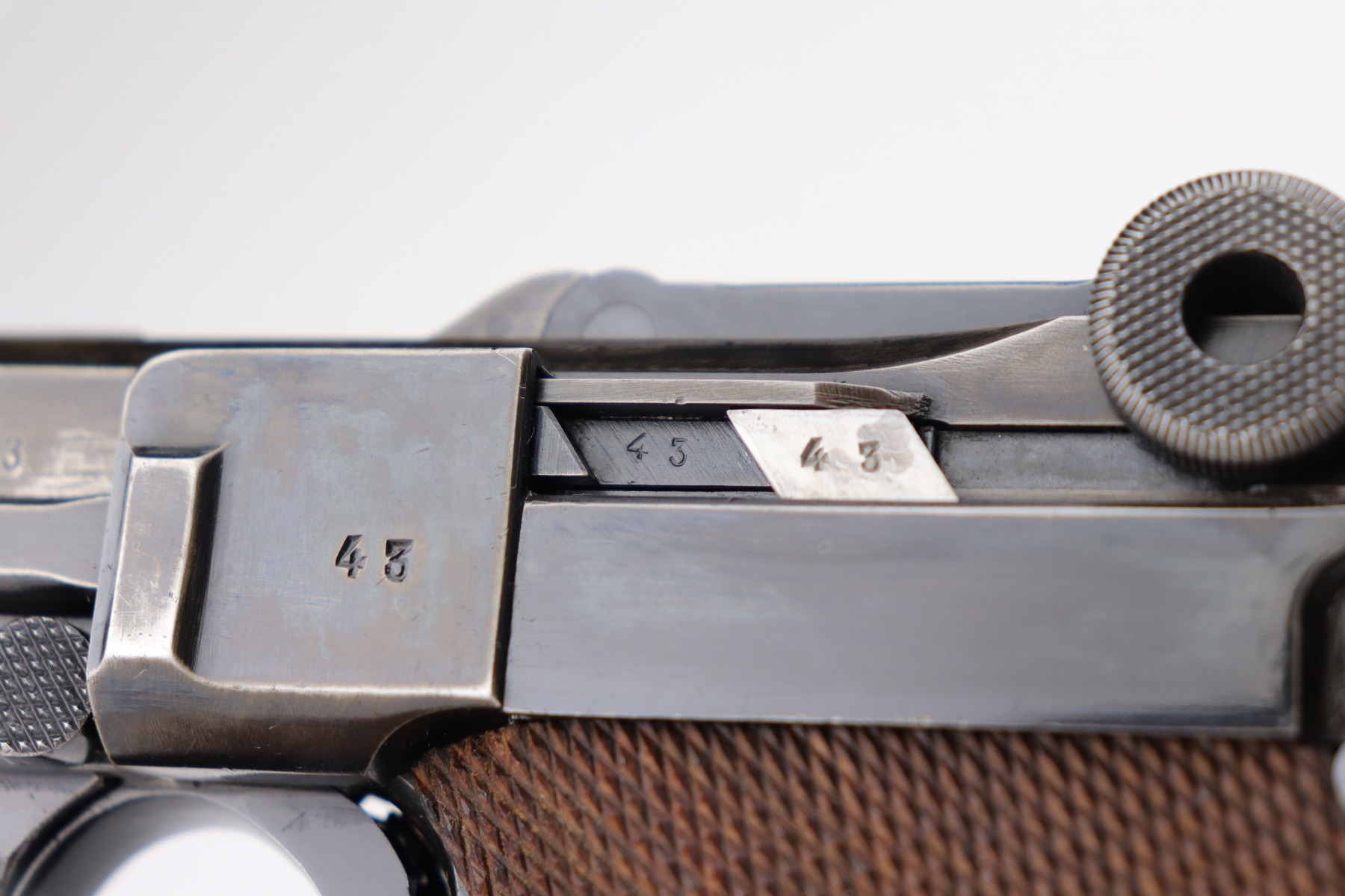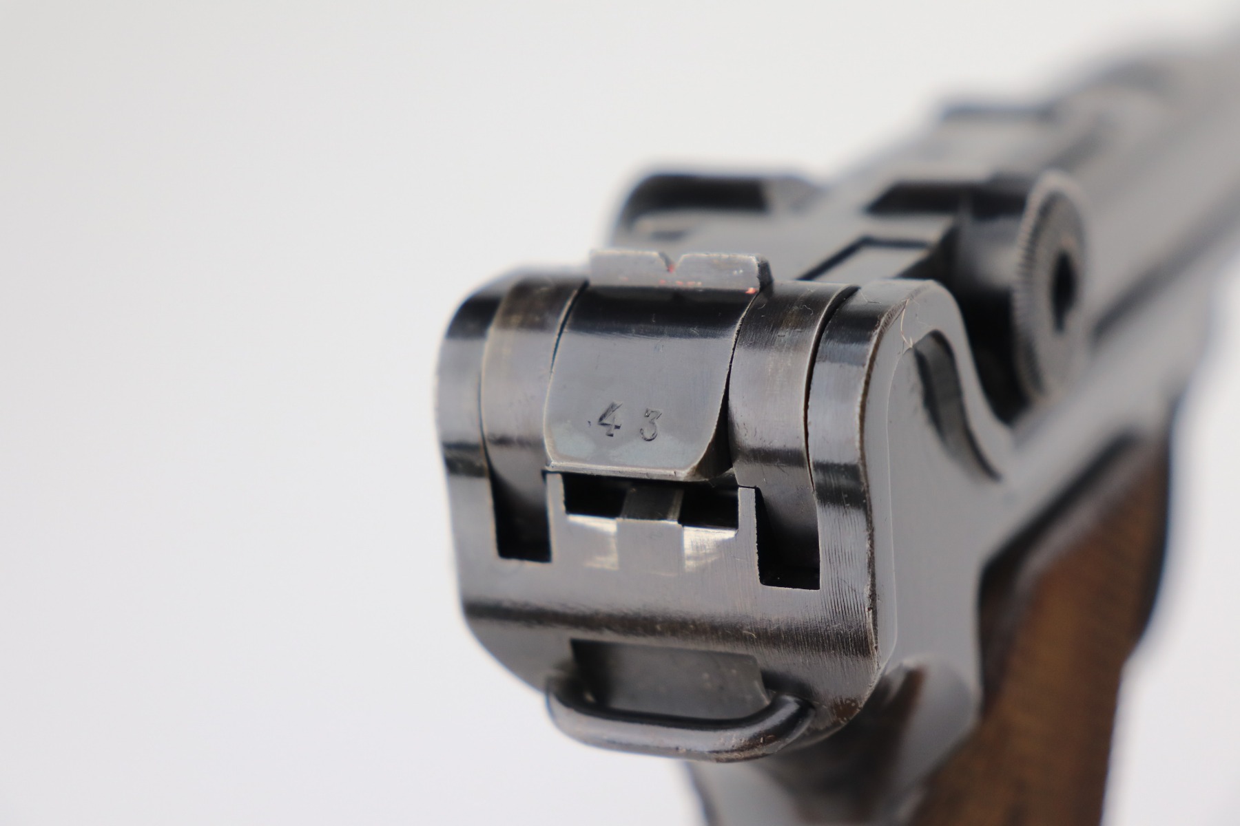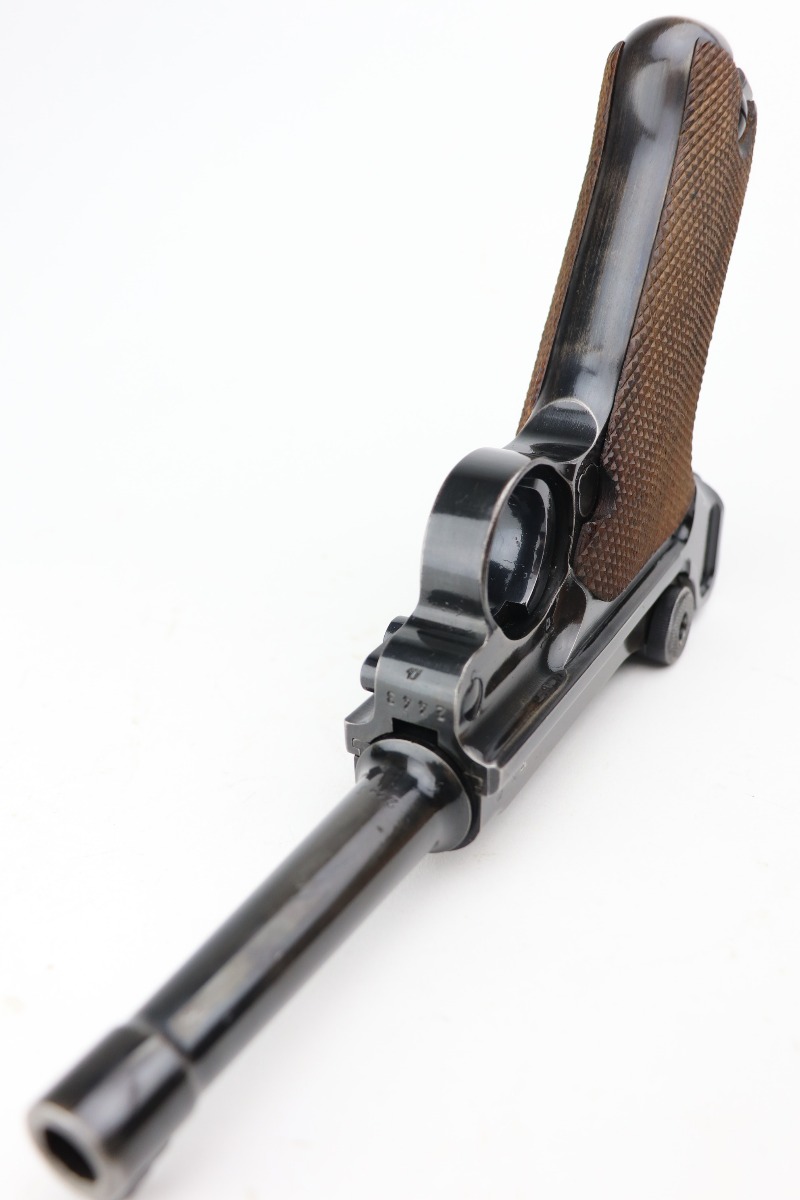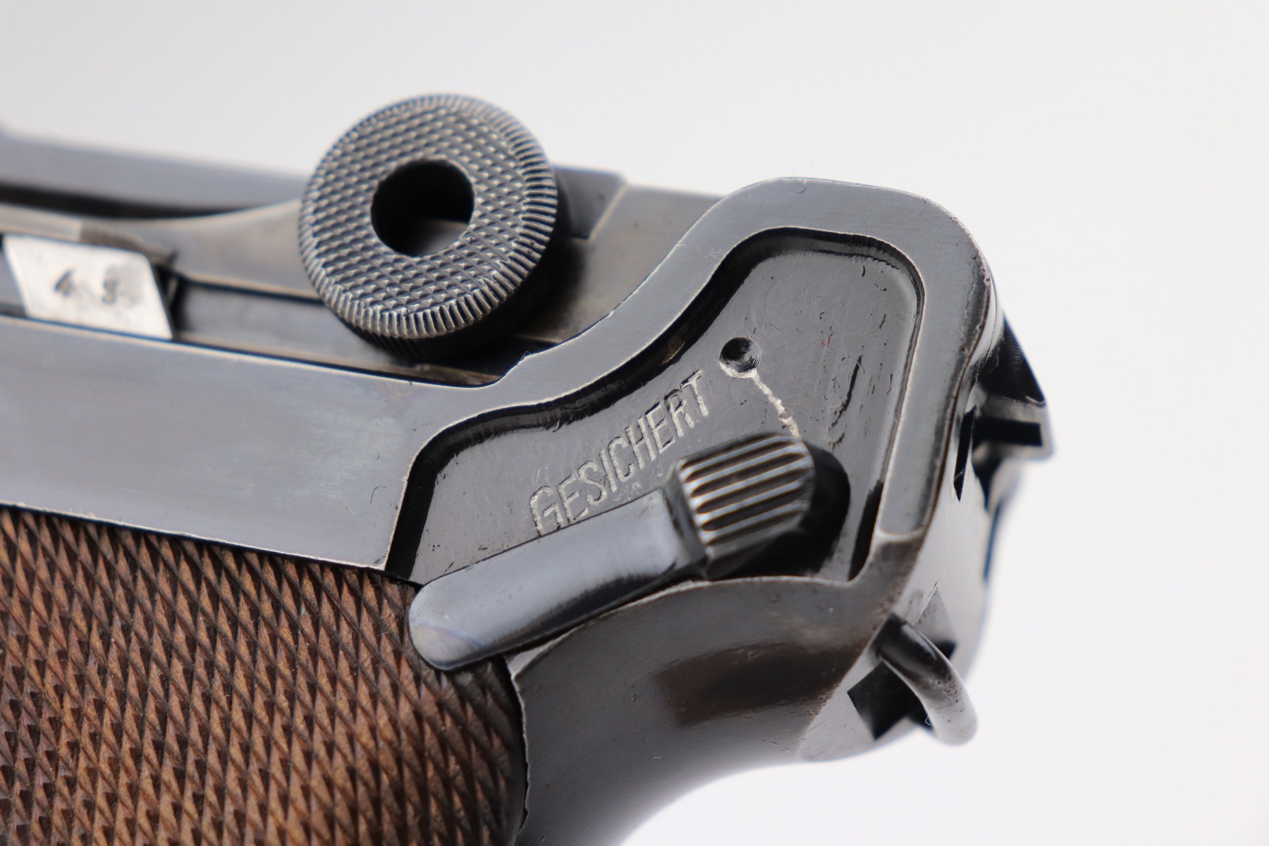 3/8/21 – This is a very nice example of a Mauser Luger issued to the Nazi military in 1937. It is all matching and has the proper “Eagle 63” military proofs. The gun has retained roughly 85% of its bluing. There is thinning on the straps and on the chamber and sides of the slide. Minor wear on the side plate and high edges of the slide. Some spotty discoloration on the side plate. Small areas of very light pitting on the barrel. Comes with excellent matching grips – very small chip in the left panel. Comes with a period-correct magazine that has been re-numbered. Mint bore.
