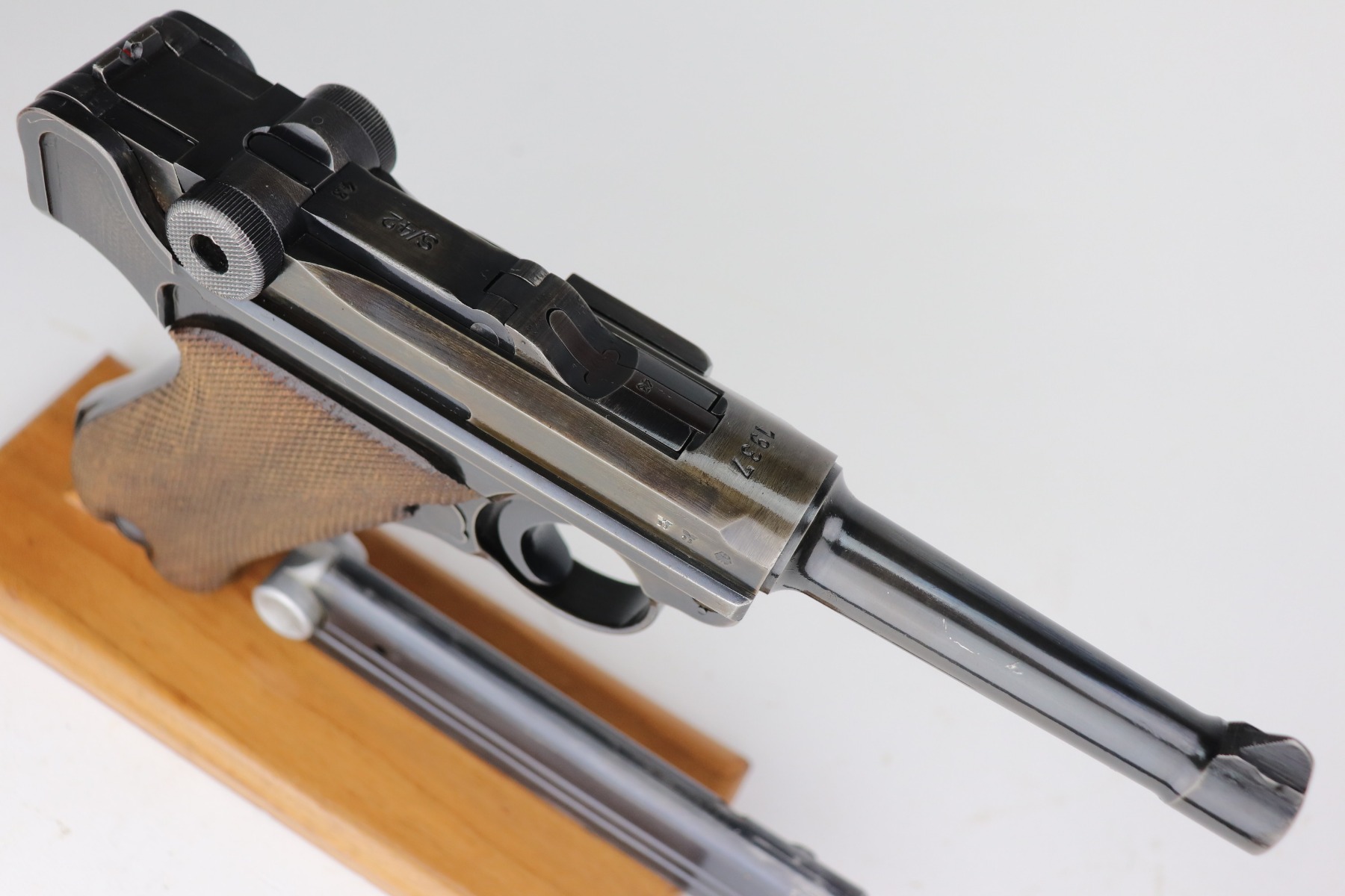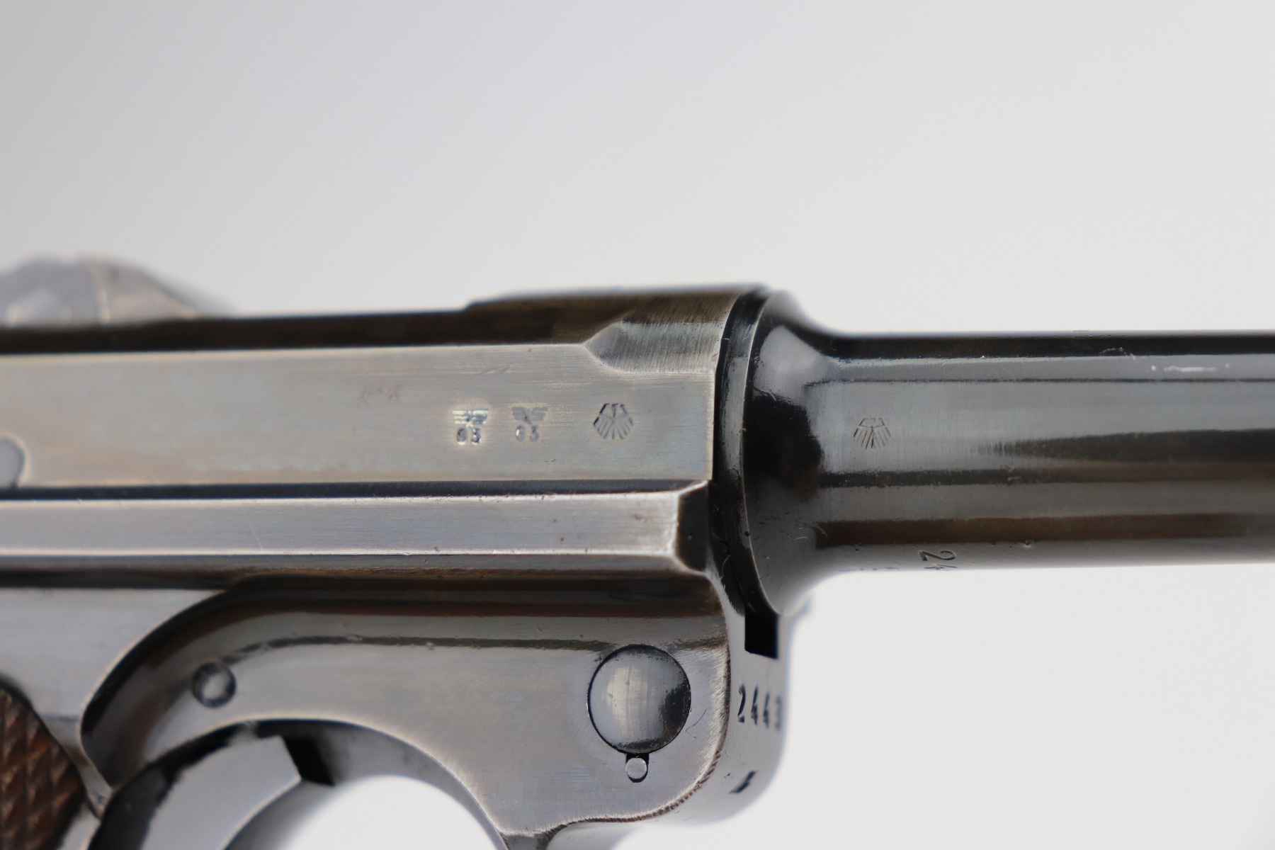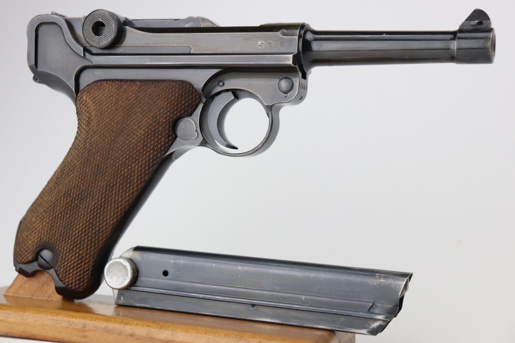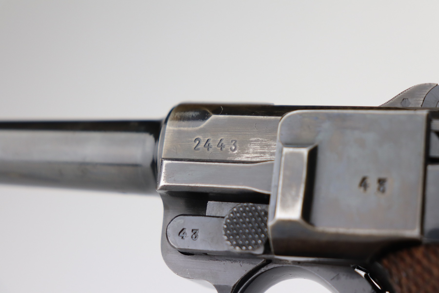 3/8/21 – This is a very nice example of a Mauser Luger issued to the Nazi military in 1937. It is all matching and has the proper “Eagle 63” military proofs. The gun has retained roughly 85% of its bluing. There is thinning on the straps and on the chamber and sides of the slide. Minor wear on the side plate and high edges of the slide. Some spotty discoloration on the side plate. Small areas of very light pitting on the barrel. Comes with excellent matching grips – very small chip in the left panel. Comes with a period-correct magazine that has been re-numbered. Mint bore.