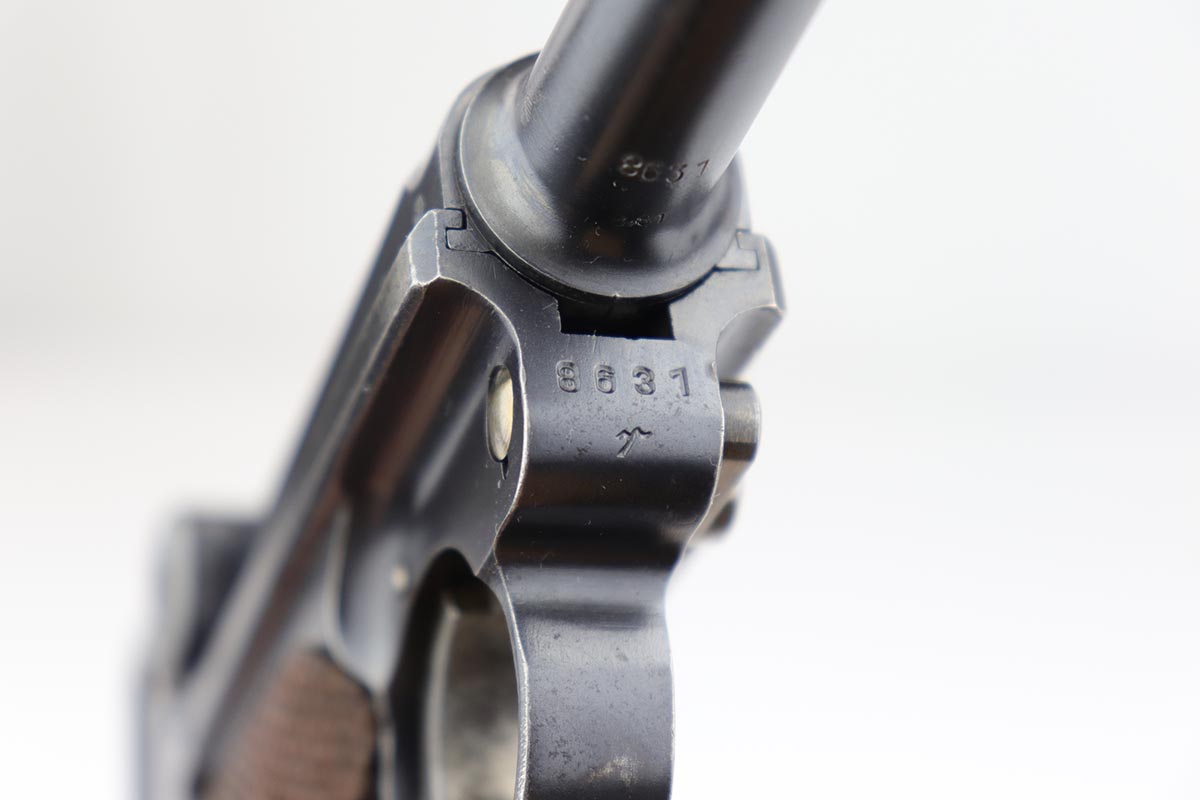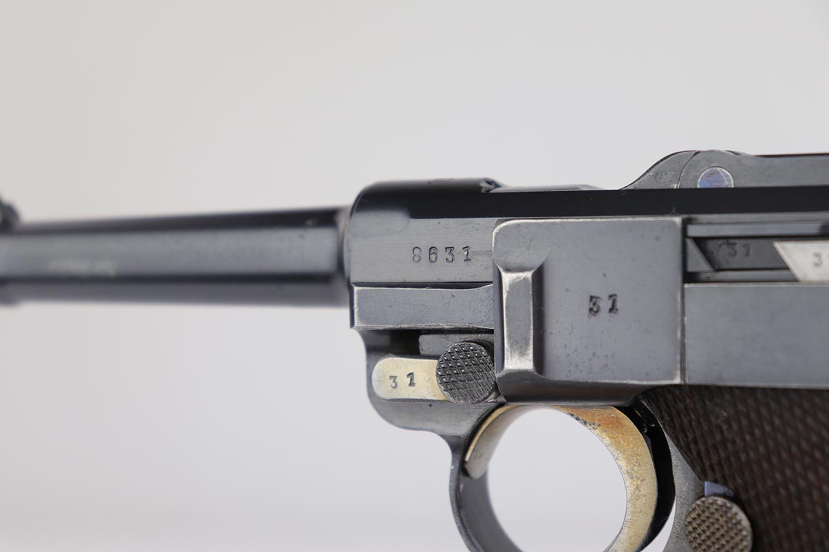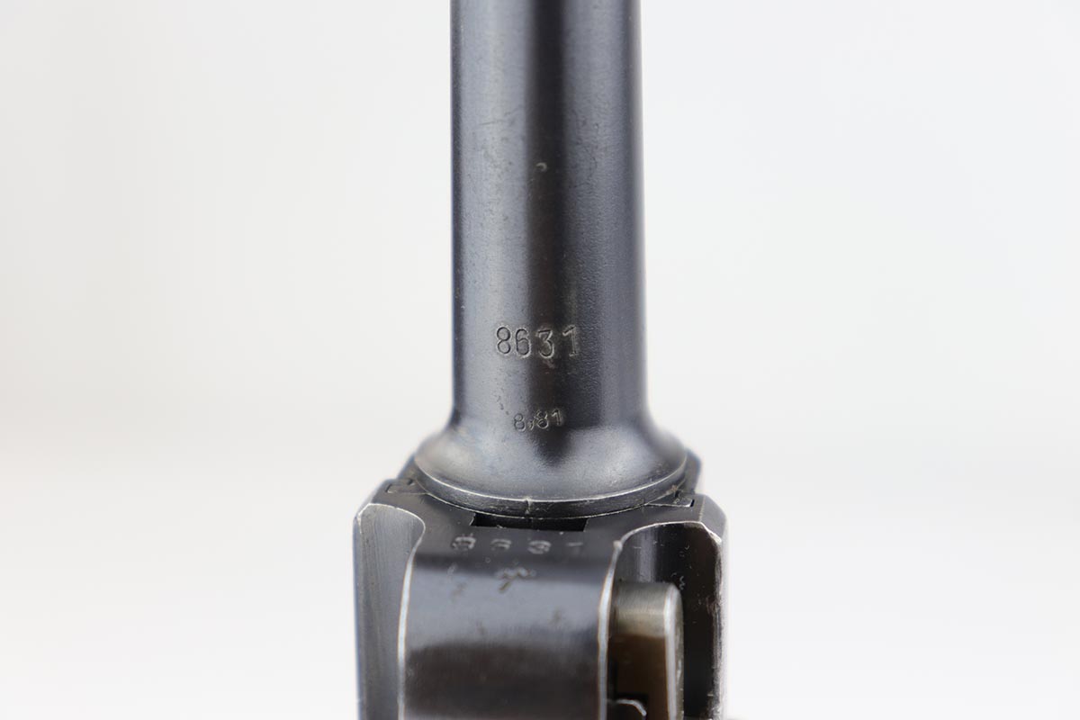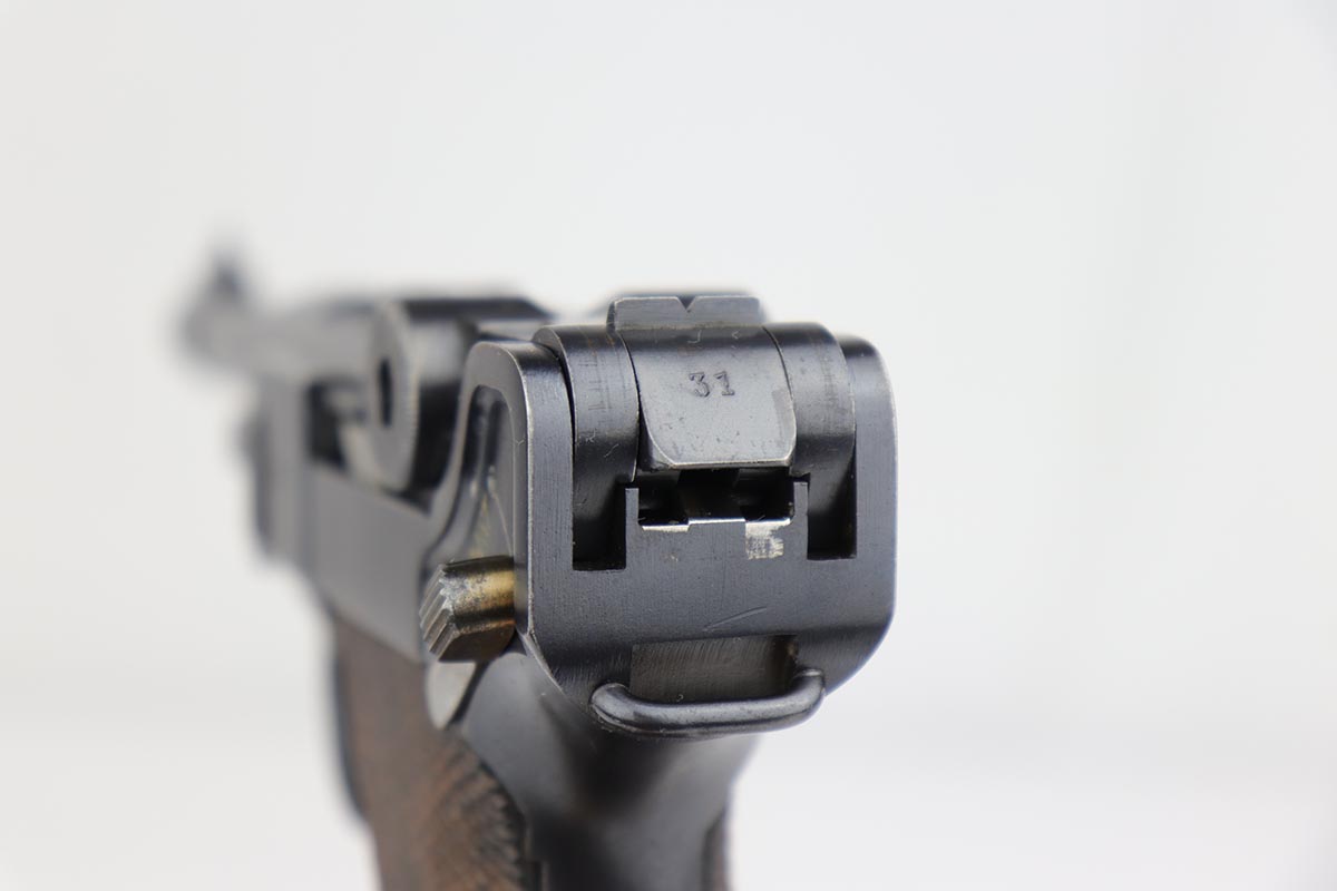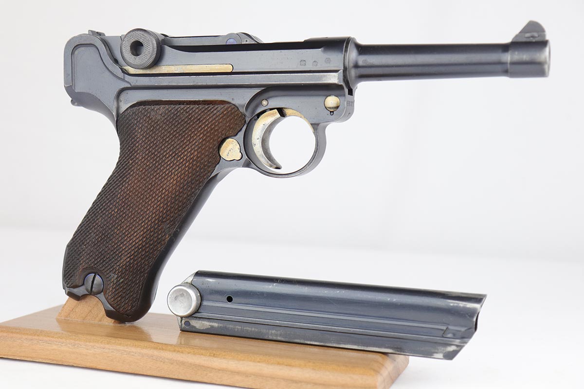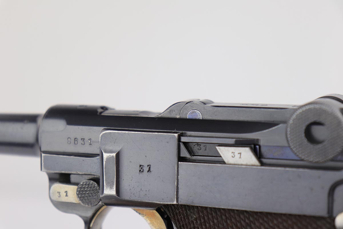 10/17/19 – This is a Nazi Mauser Luger from 1937, first variation, with strawed small parts and all matching numbers. The grips are numbered to the pistol but the magazine is a period mismatch. The original blue rates at 93-95% with standard high edge wear, and some minor thinning of the straps. Excellent bore and grips. No notable flaws.