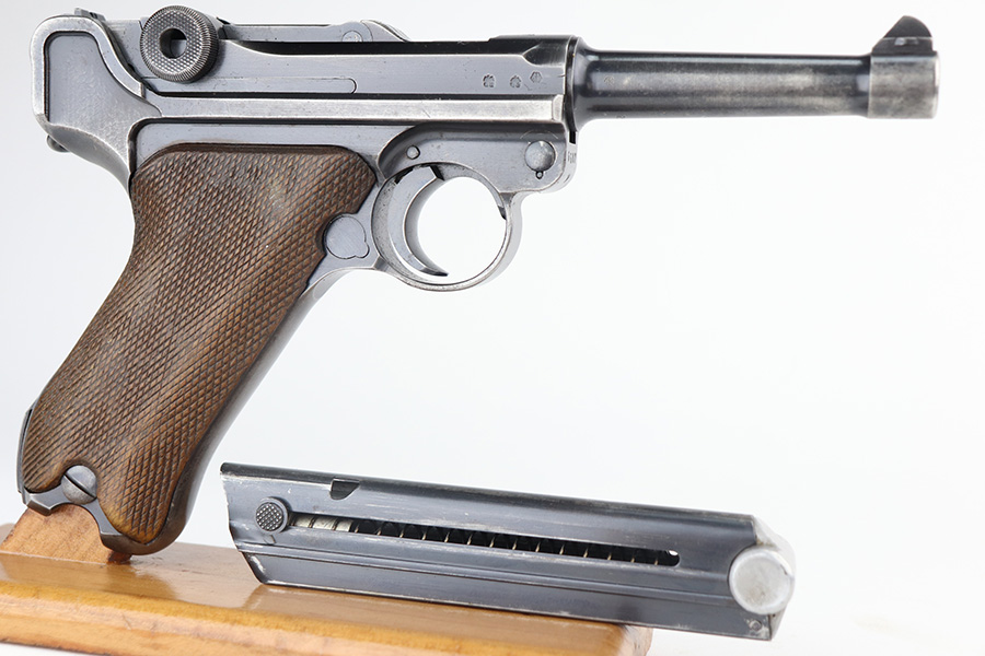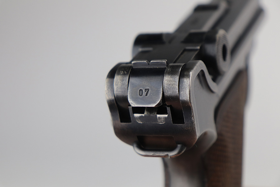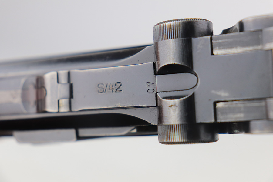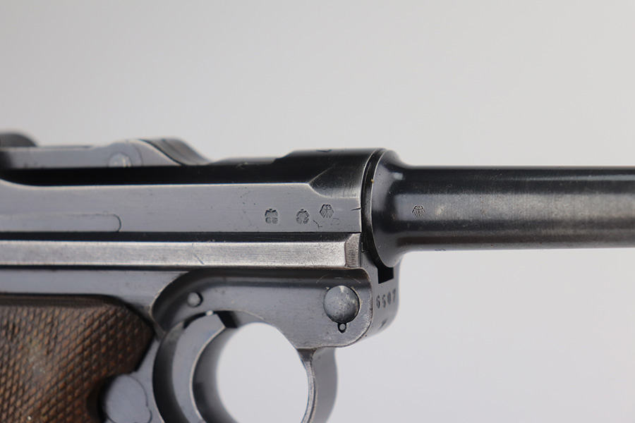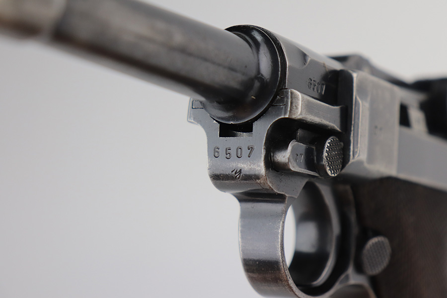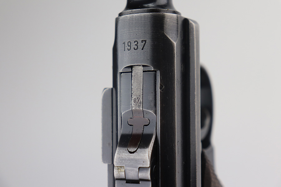 6/21/21 – This is a nice example of a Mauser Luger issued to the Nazi military in 1937. It is all matching and has the proper “Eagle 63” military proofs. It has retained roughly 55% of its original finish. Most of the finish loss is on the straps, but there is spotty wear and thinning throughout, concentrated on the side plate, side rails, and barrel. Areas of minor pin-pricking here and there. Slightly worn original matching grips – small chip in the top corner of the left panel. Comes with a period-correct mismatched magazine. The bore has good rifling with pin-pricking throughout.