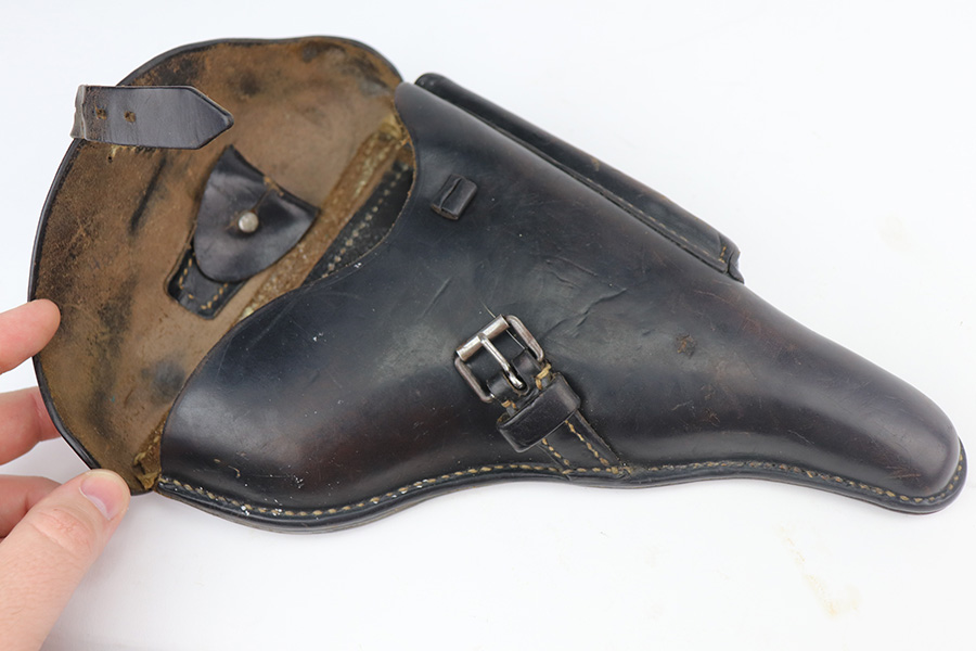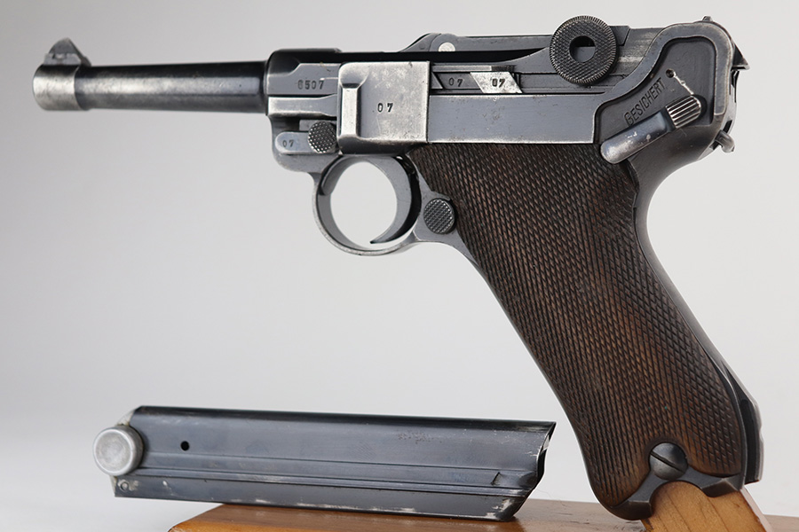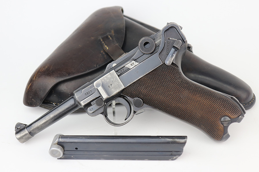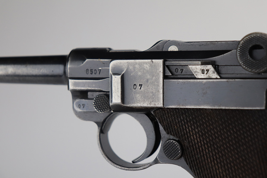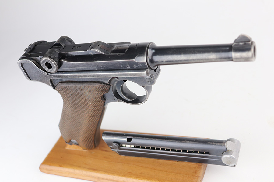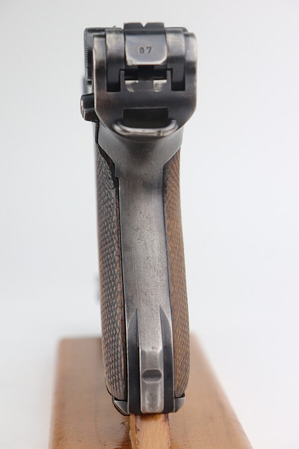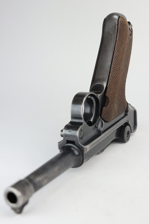 6/21/21 – This is a nice example of a Mauser Luger issued to the Nazi military in 1937. It is all matching and has the proper “Eagle 63” military proofs. It has retained roughly 55% of its original finish. Most of the finish loss is on the straps, but there is spotty wear and thinning throughout, concentrated on the side plate, side rails, and barrel. Areas of minor pin-pricking here and there. Slightly worn original matching grips – small chip in the top corner of the left panel. Comes with a period-correct mismatched magazine. The bore has good rifling with pin-pricking throughout.