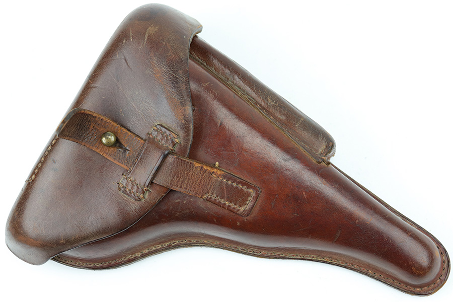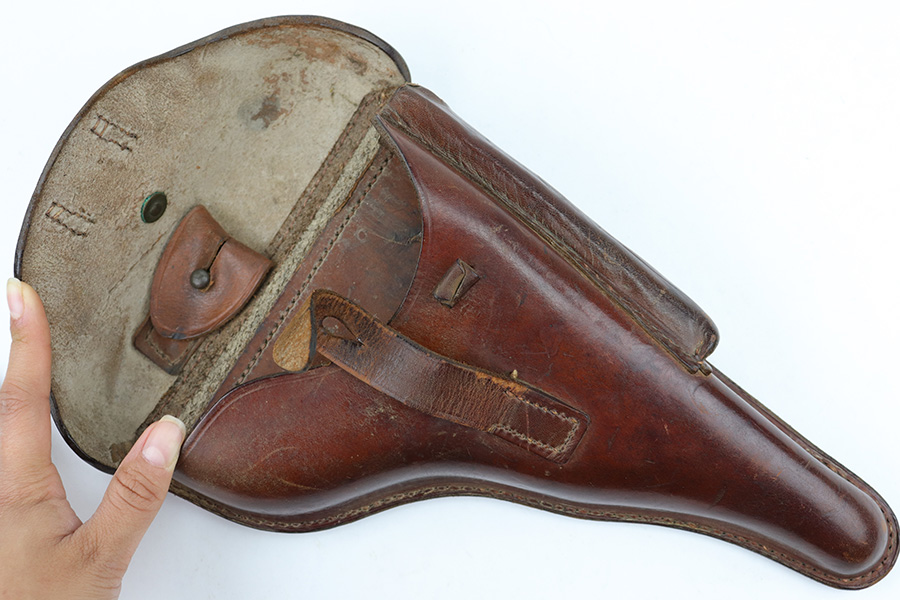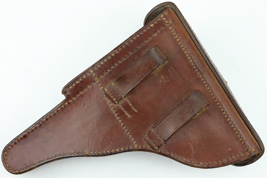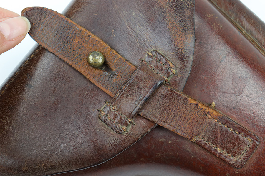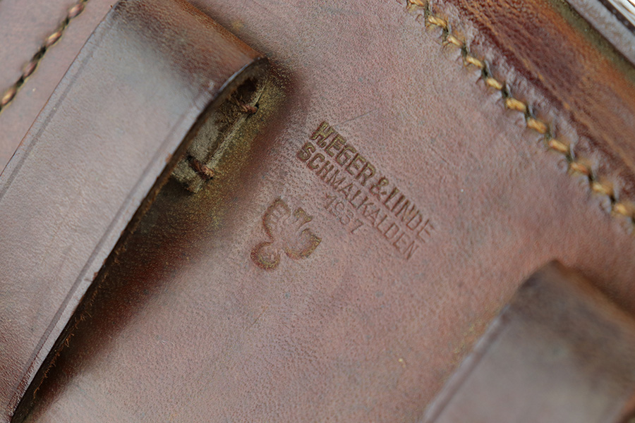 6/22/23 – This is an excellent example of a WW2 original Police Luger holster. The holster has strong brown leather with minimal pliability and excellent shape. The holster features a brass closure stud, and is maker stamped, date stamped, and police eagle proof stamped on the back leather. The markings are crisp and legible with a fairly uncommon maker. The interior leather is fairly clean with some mild signs of use and natural aging. There’s mild surface wrinkling on the closure strap, top lid, and magazine pouch of leather. The stitching is all tight and original.
