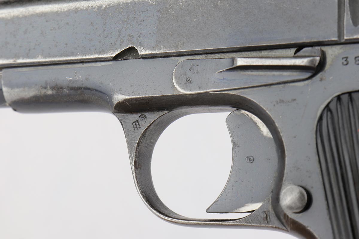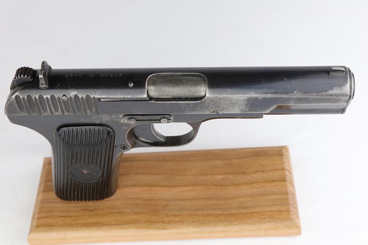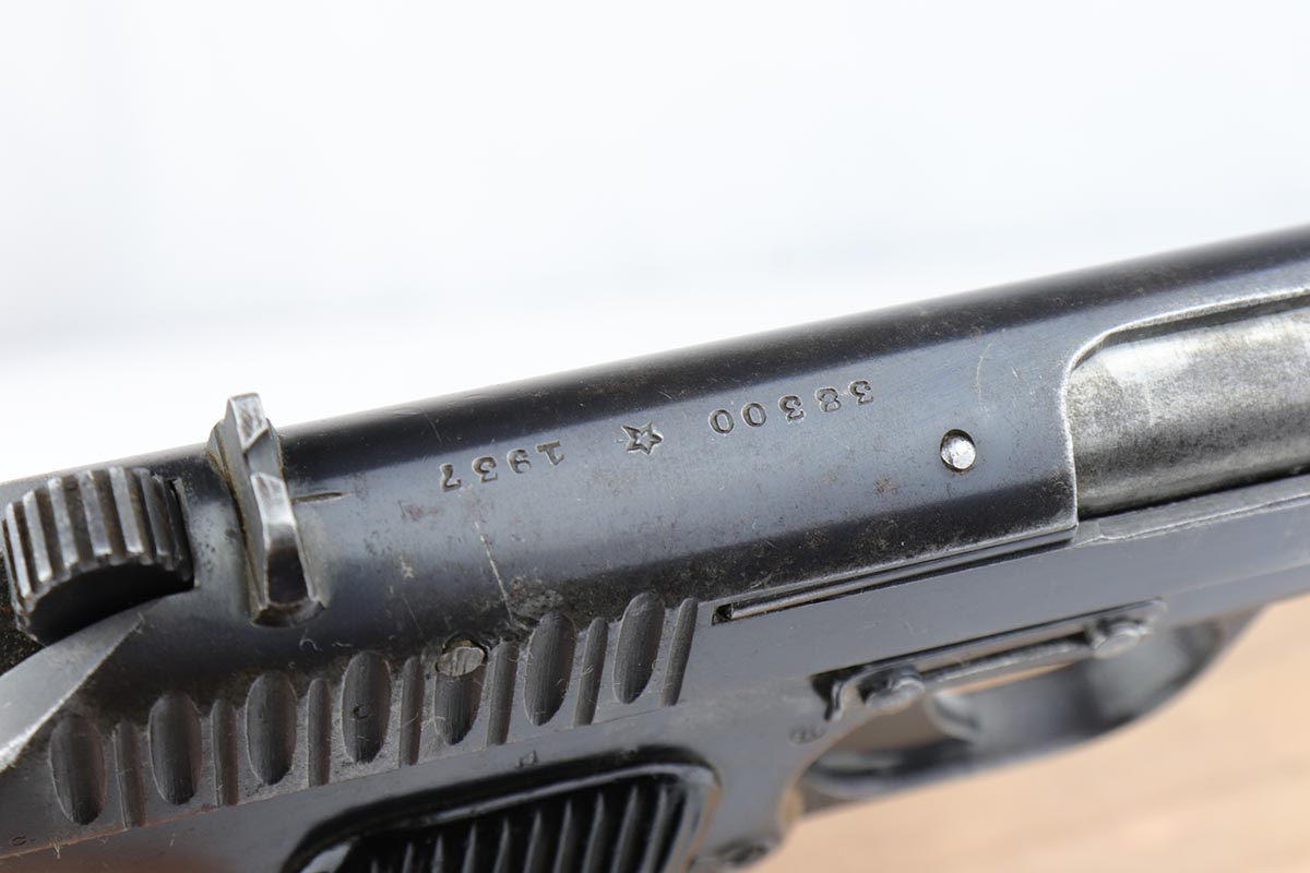 3/28/19 – This is an all matching and original Russian Tokarev TT-33 pistol, manufactured in 1937. The original bluing rates at about 80% with thin straps and wear along various parts of the slide. No major areas of pitting and no rust. Excellent grips. Original but mismatched magazine. Bore has good rifling but frost and freckling in the grooves.