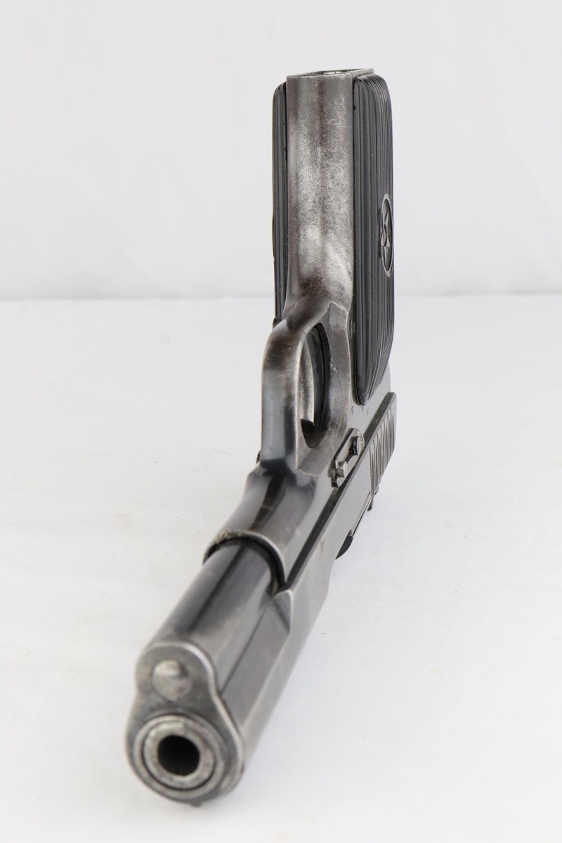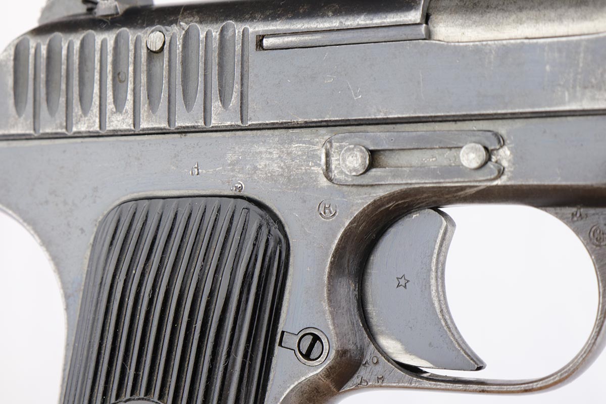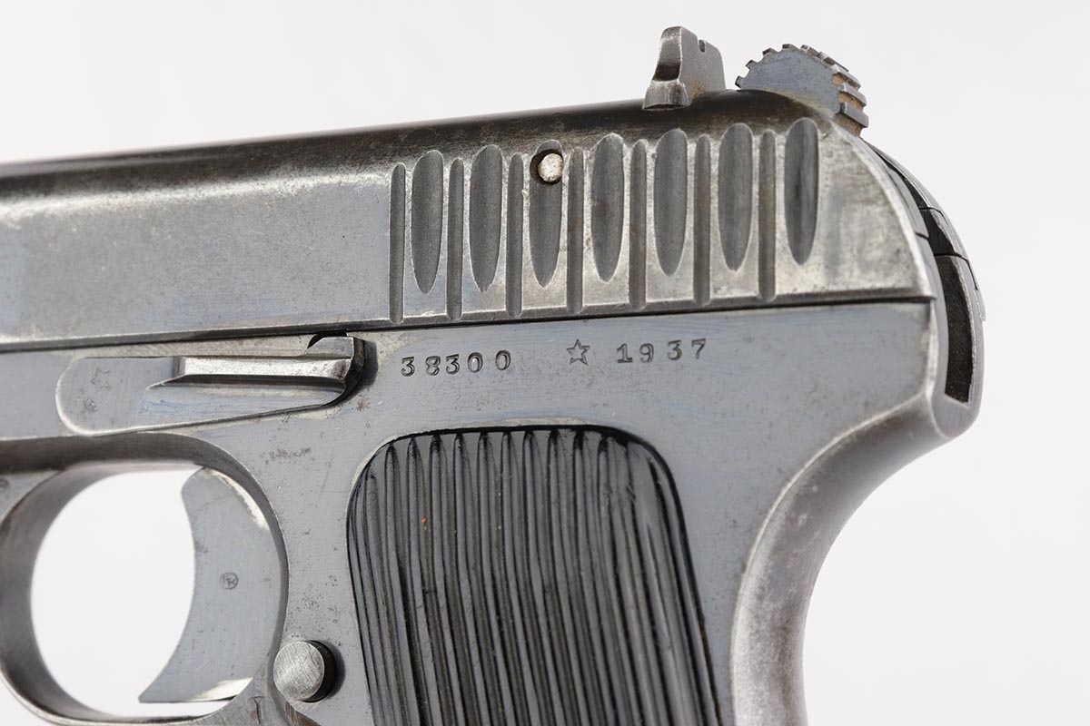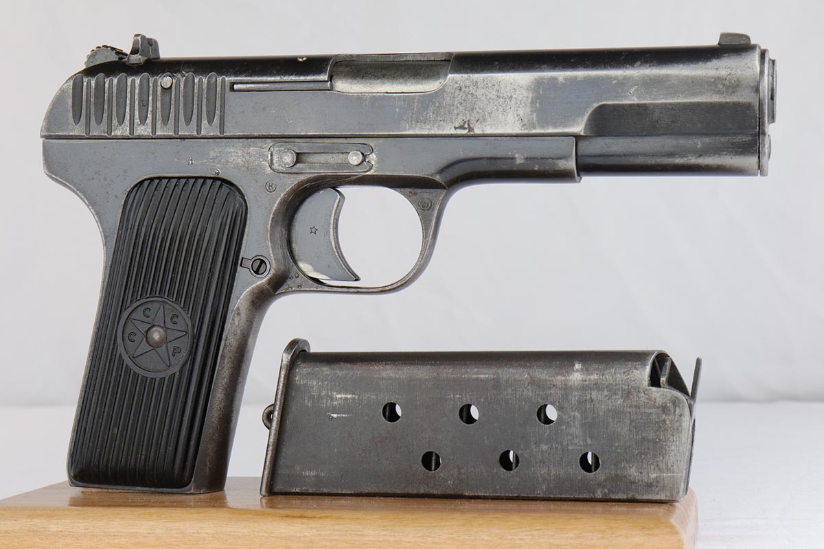 3/28/19 – This is an all matching and original Russian Tokarev TT-33 pistol, manufactured in 1937. The original bluing rates at about 80% with thin straps and wear along various parts of the slide. No major areas of pitting and no rust. Excellent grips. Original but mismatched magazine. Bore has good rifling but frost and freckling in the grooves.