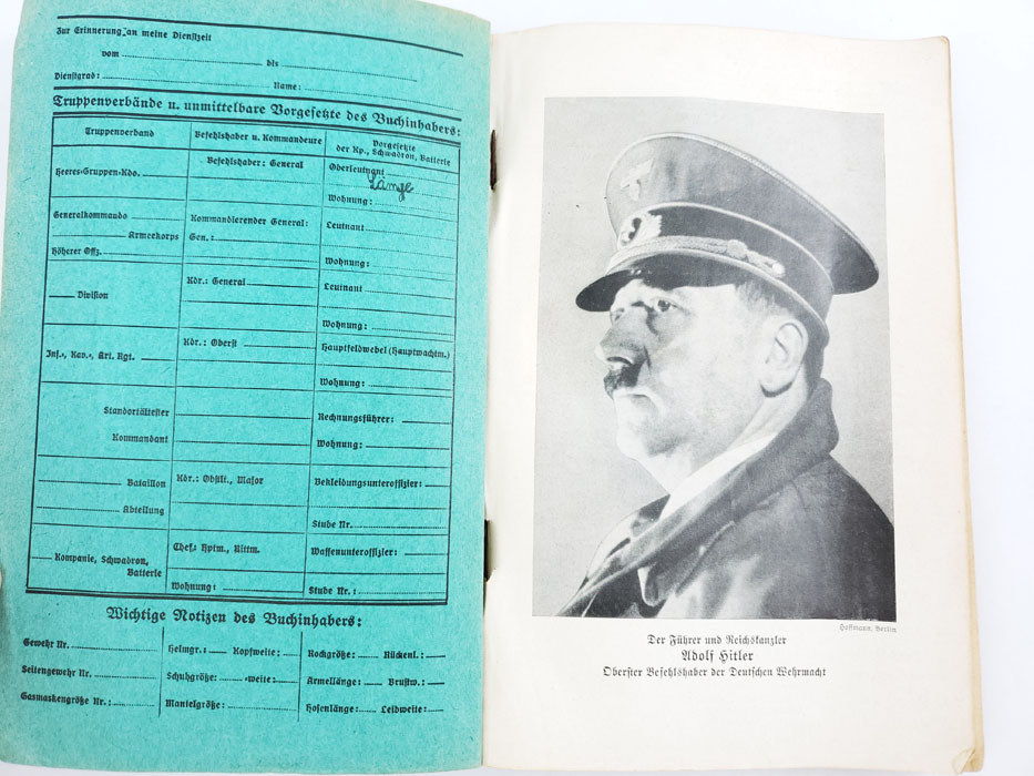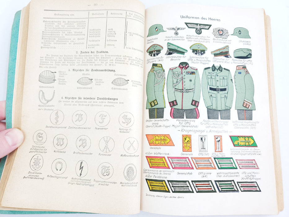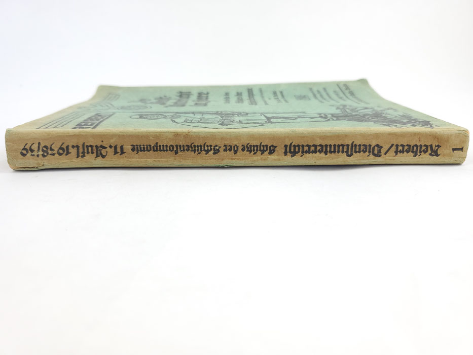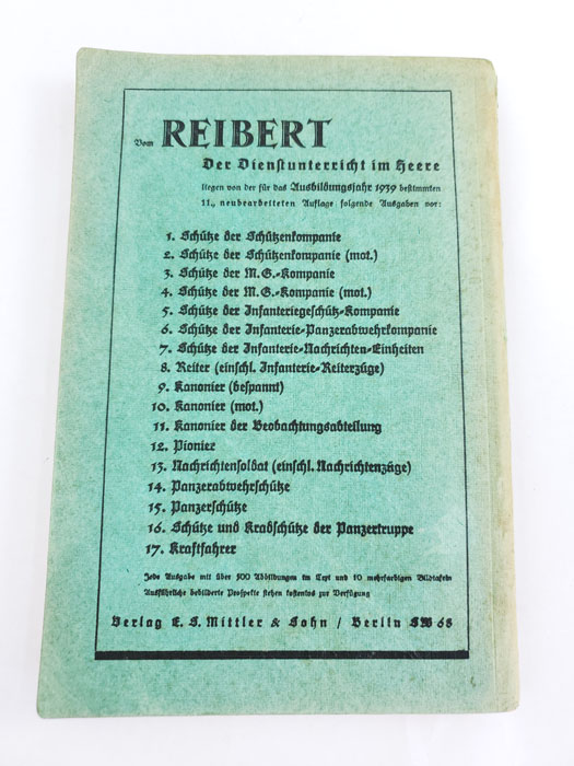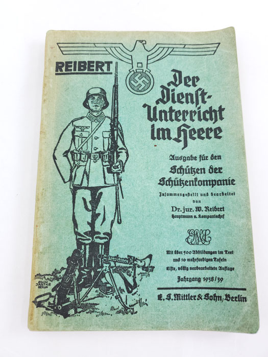 5/13/20 – This is an original copy of Der Dienst-Unterricht im Heere. Translates to the instructions for the Army (roughly). Dated 1938/39 and an original copy! All pages are in tact although there are signs of aging and yellowing. This book contains details of German state and military history, and shows every recruit what to do and how to behave as a member of the army.From bed-making to rifle drill, from camouflage to tactical movements, from boot polishing to horse handling. 325+ pages.