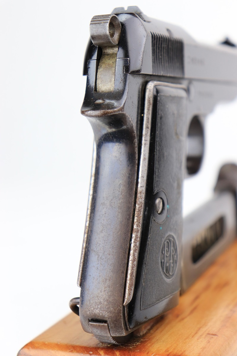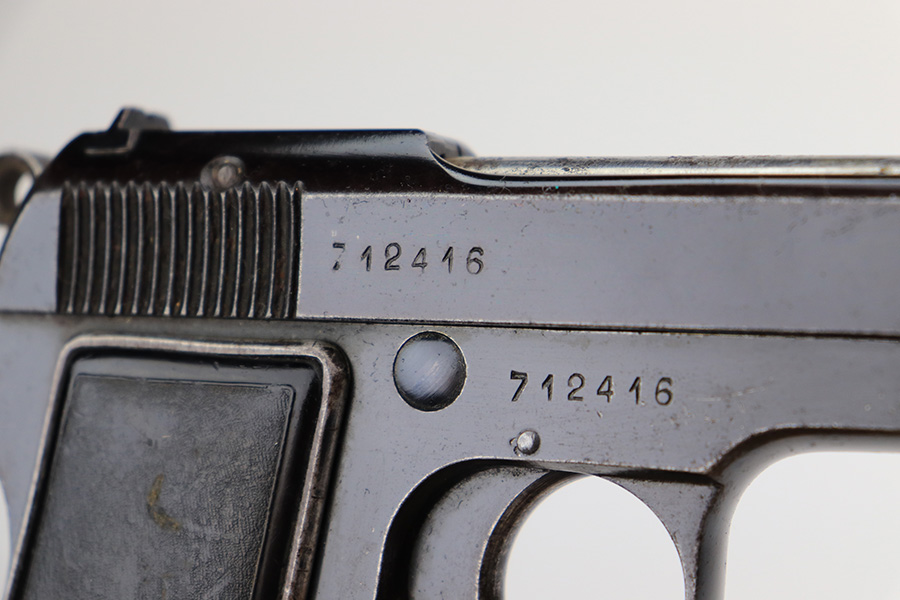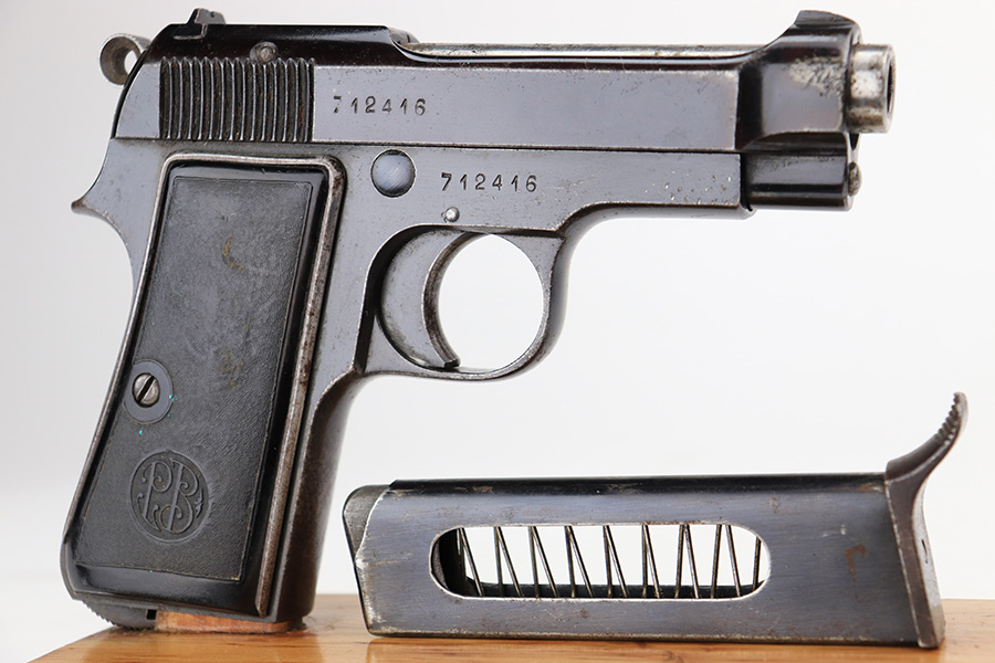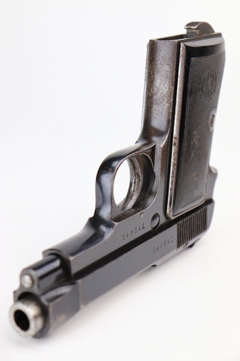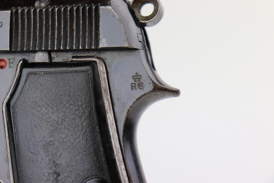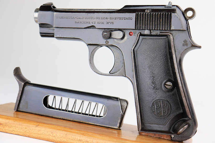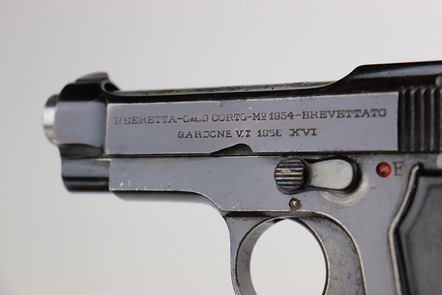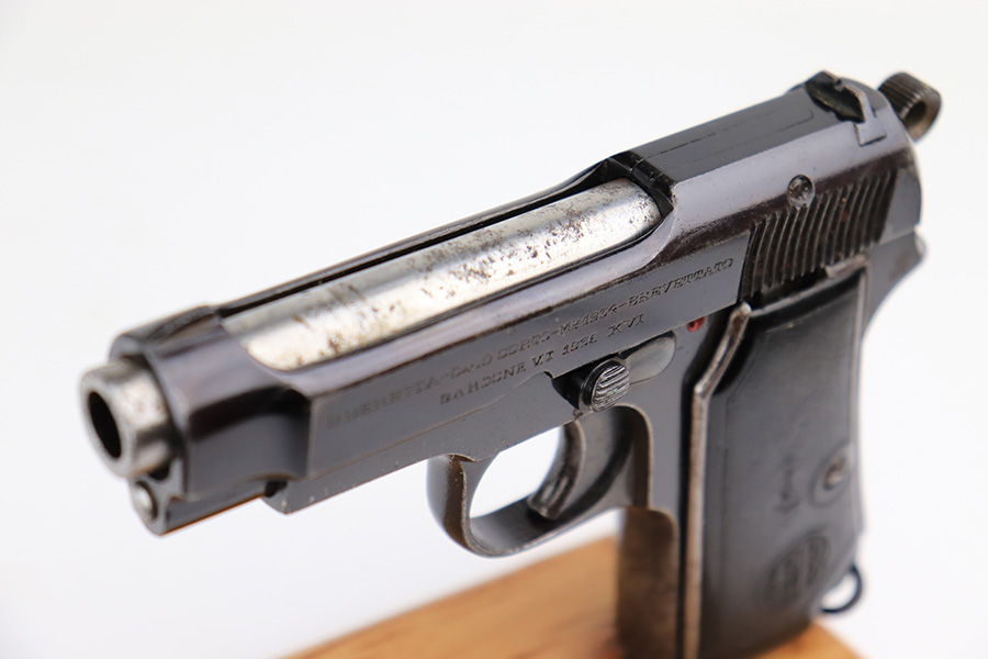3/25/22 – This is a nice example of a Beretta Model 1934 issued to the Italian military in 1938. The gun is all matching and has the proper “Crown RE” Italian military proof on the left side of the trigger guard. The gun has retained about 90% of its original high polish finish. There is wear on the high edges of the slide and around the muzzle. While there isn’t much actual finish loss, there are areas of freckling on both sides of the slide and on the grip straps. Areas with tiny handling marks on both sides of the frame. Noticeable spotty oxidation on the barrel. Thinning and noticeable spotty oxidation on the front strap. There is somewhat scratchy wear, light patina, and freckling on the back strap. A small area of pitting on the right side of the slide around the muzzle. Comes with nice period-correct grips and a proper magazine. The bore has good rifling with minor pin-pricking throughout.