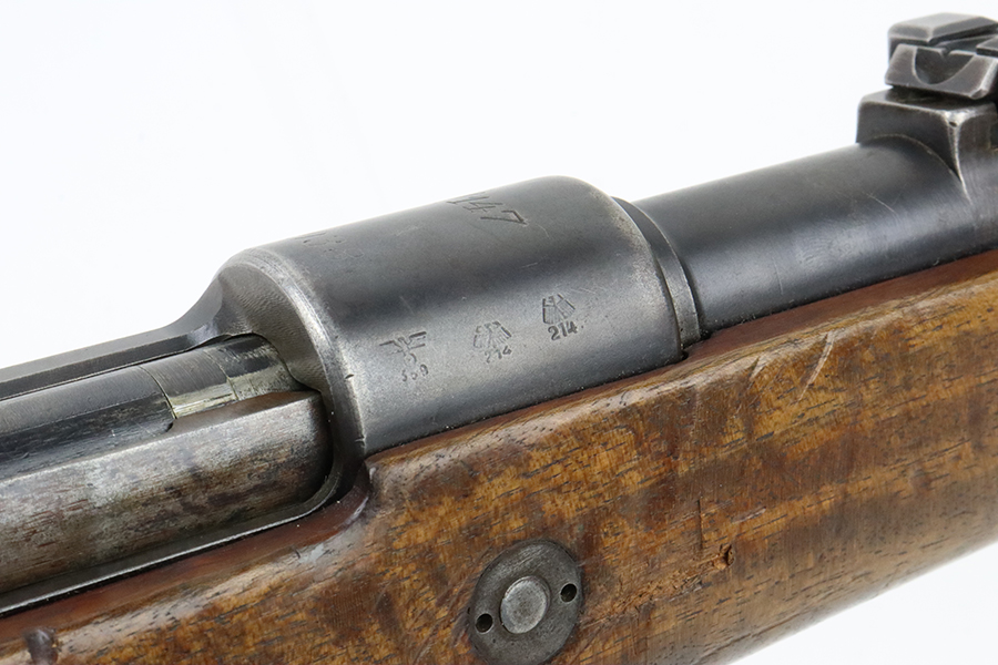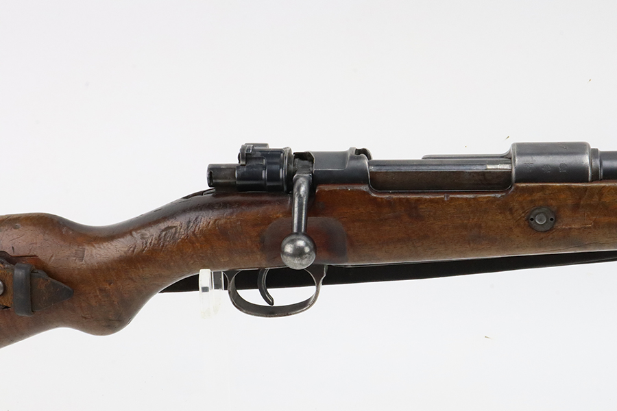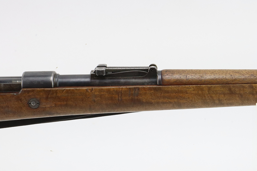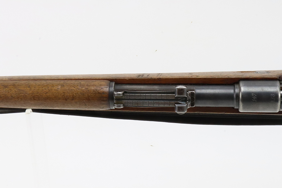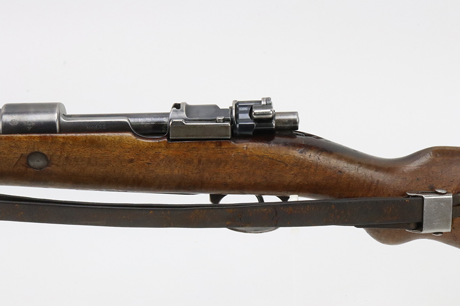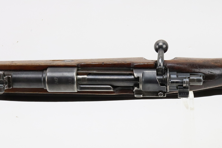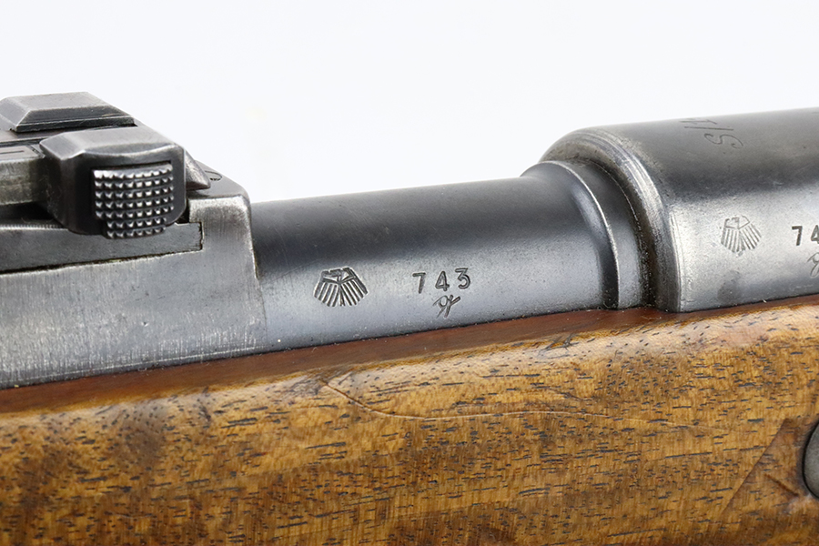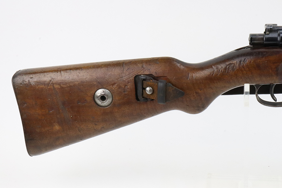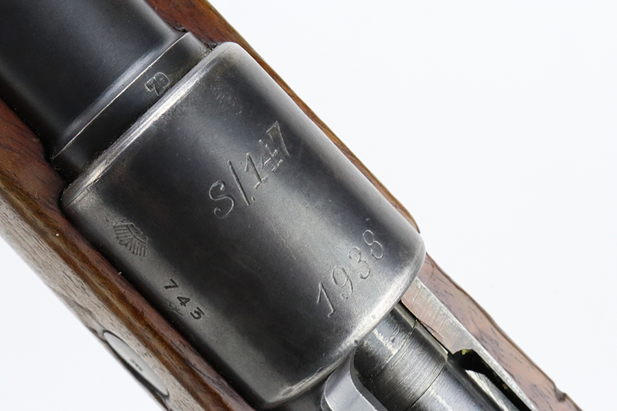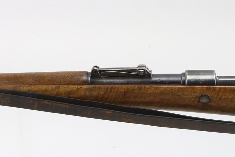 2/5/24 – This is a nice example of an “S/147” Code JP Sauer K98 rifle issued to the Nazi military in 1938. The gun is completely matching, including the wood stock. The metal parts have retained roughly half of their original finish with obvious thinning throughout and noticeable spotty oxidation along the barrel. The wood has no major damage but shows bruising and scratching throughout. The butt stock has visible waffen proofs, but there are some scratches on the right side that obscure some of the proofs. The bore has good rifling with light pin-pricking throughout. Comes with an original leather sling and muzzle cap.