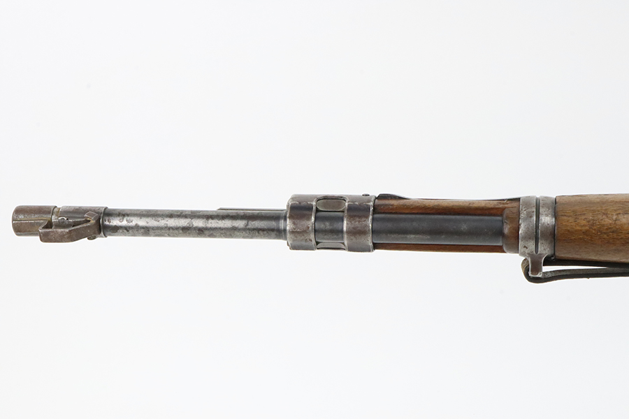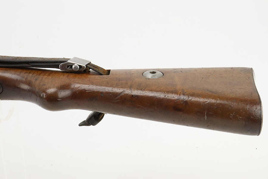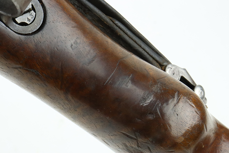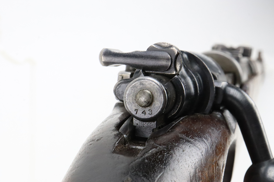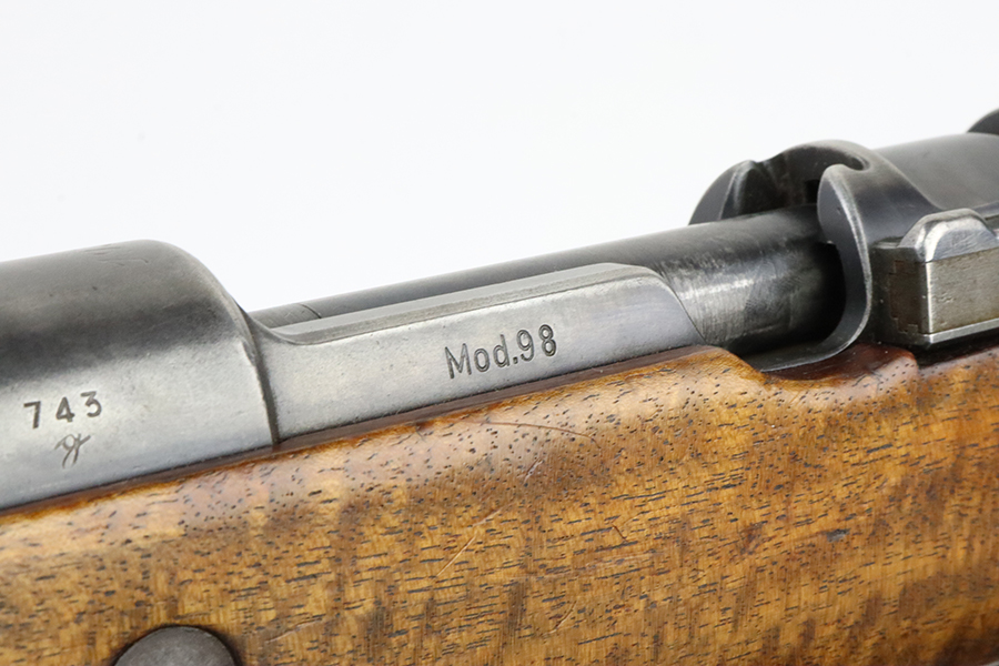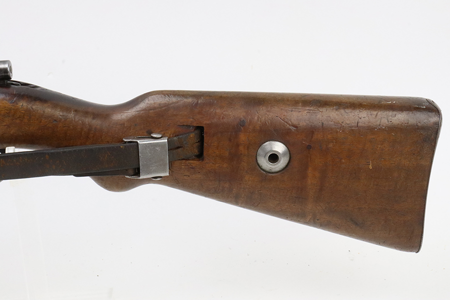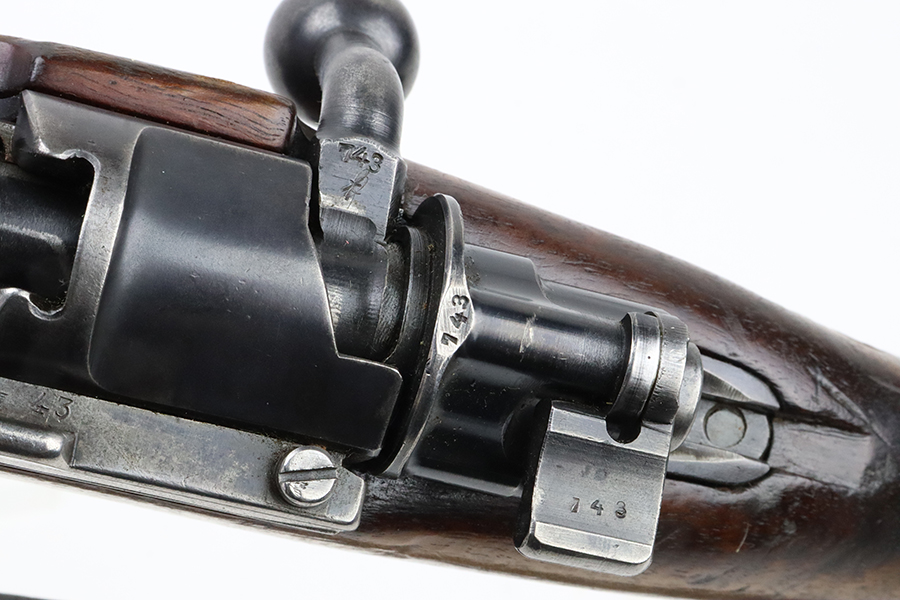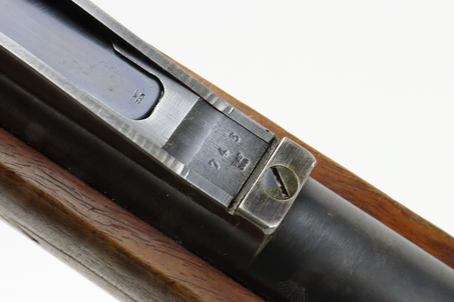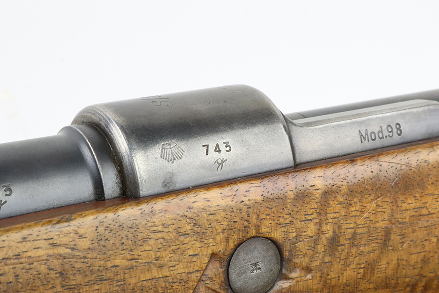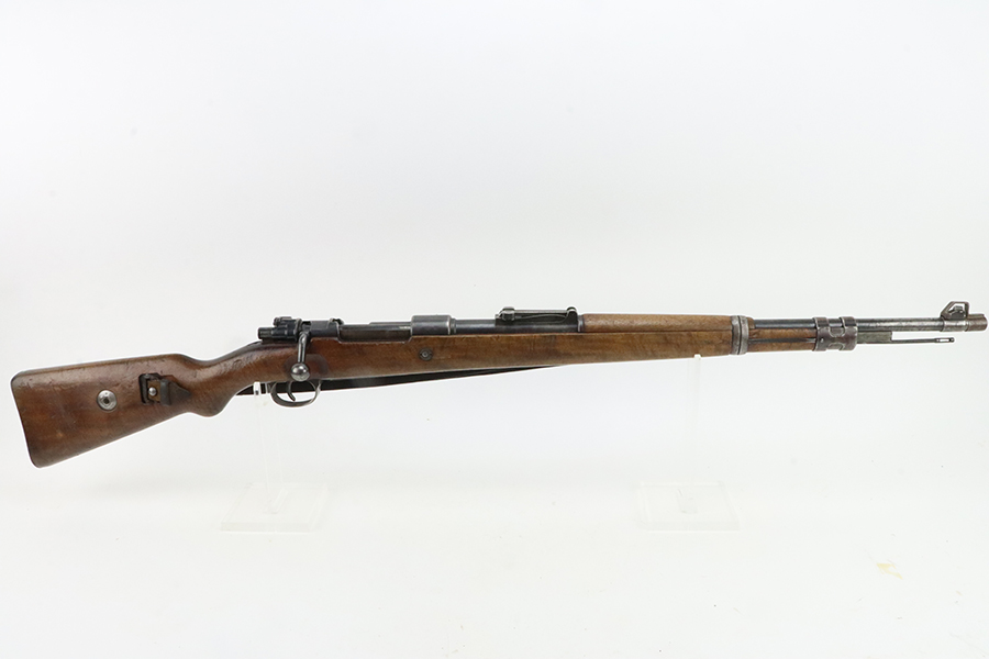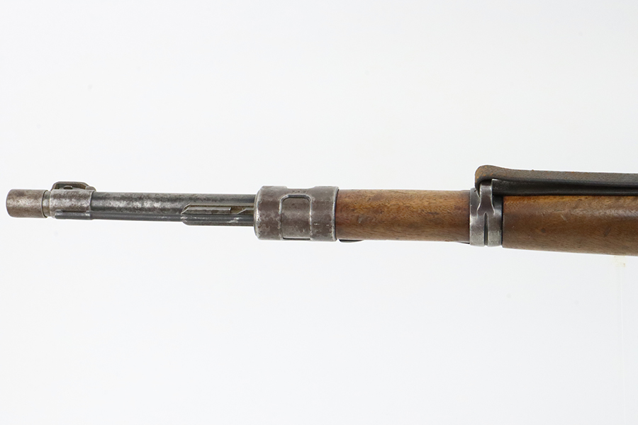 2/5/24 – This is a nice example of an “S/147” Code JP Sauer K98 rifle issued to the Nazi military in 1938. The gun is completely matching, including the wood stock. The metal parts have retained roughly half of their original finish with obvious thinning throughout and noticeable spotty oxidation along the barrel. The wood has no major damage but shows bruising and scratching throughout. The butt stock has visible waffen proofs, but there are some scratches on the right side that obscure some of the proofs. The bore has good rifling with light pin-pricking throughout. Comes with an original leather sling and muzzle cap.