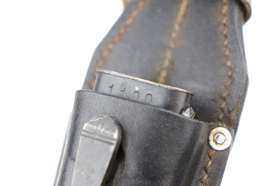 10/20/21 – This is an excellent condition, matching k98 bayonet that was issued to the Luftwaffe. The bayonet and scabbard are matching serial numbered 1100j. The blade is maker stamped on the reverse and in excellent condition with minimal finish loss. Mild patina on the metal parts of the handle, but no excessive wear. The scabbard has most of the original finish in tact. Excellent leather frog that’s maker stamped, dated, and LBA Luftwaffe stamped. Comes with a Luftwaffe portepee as well.