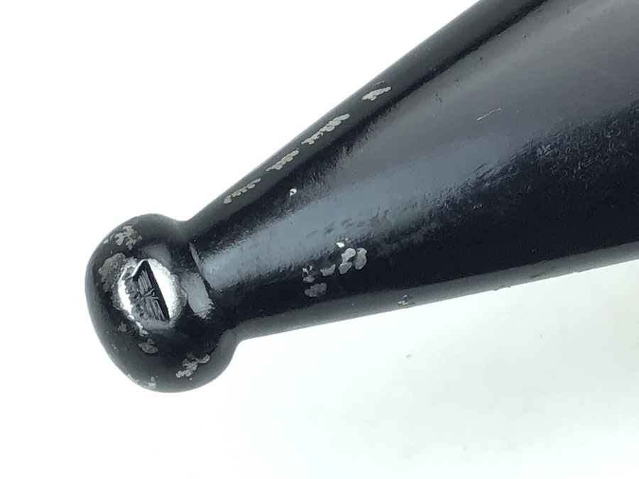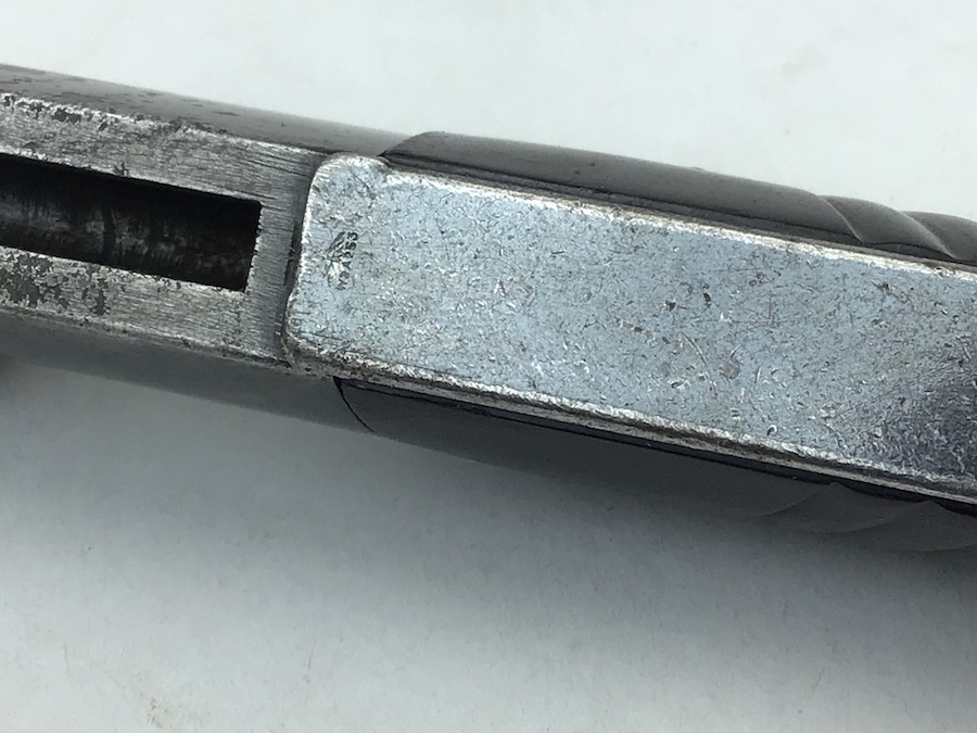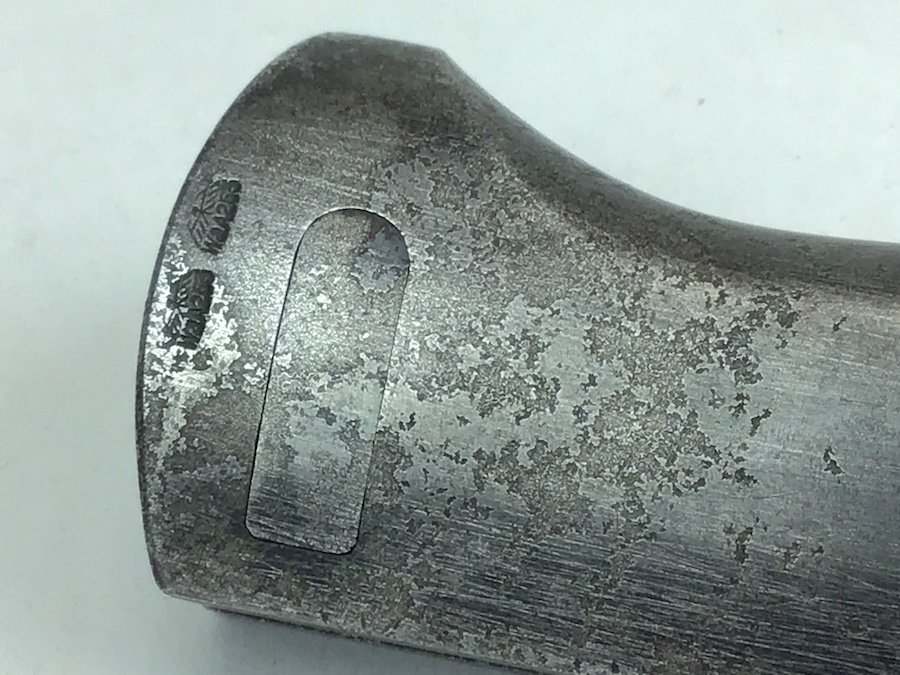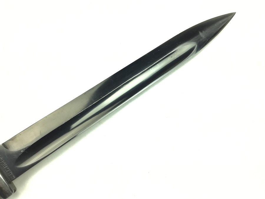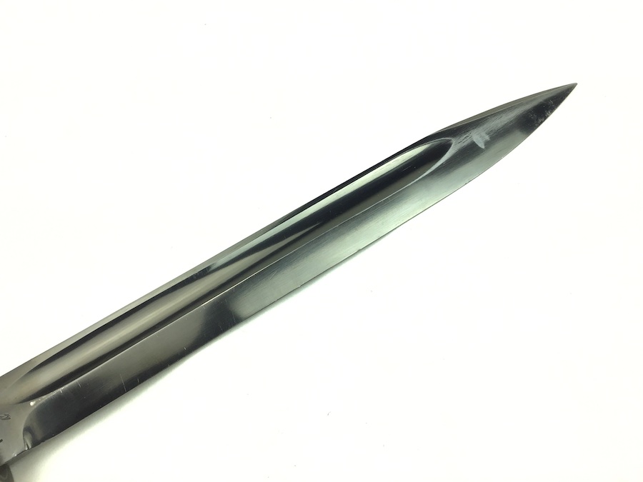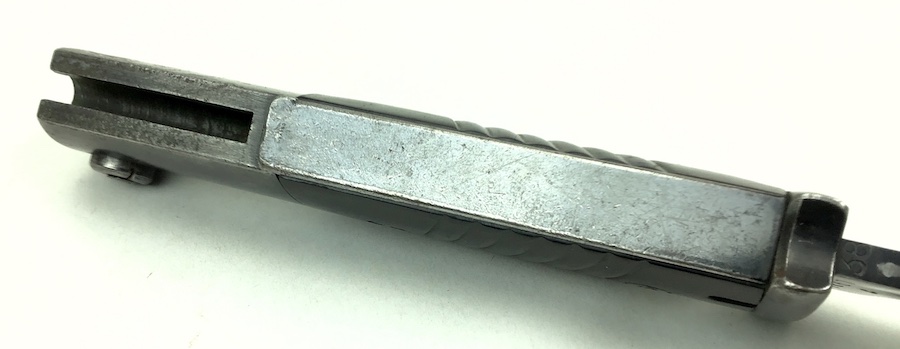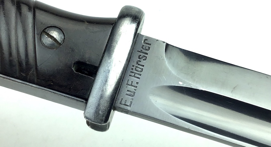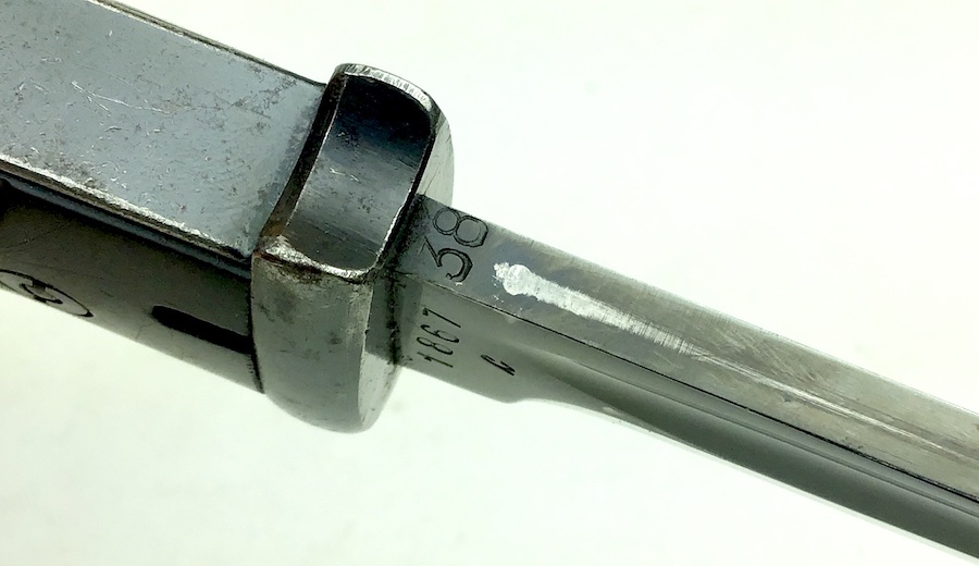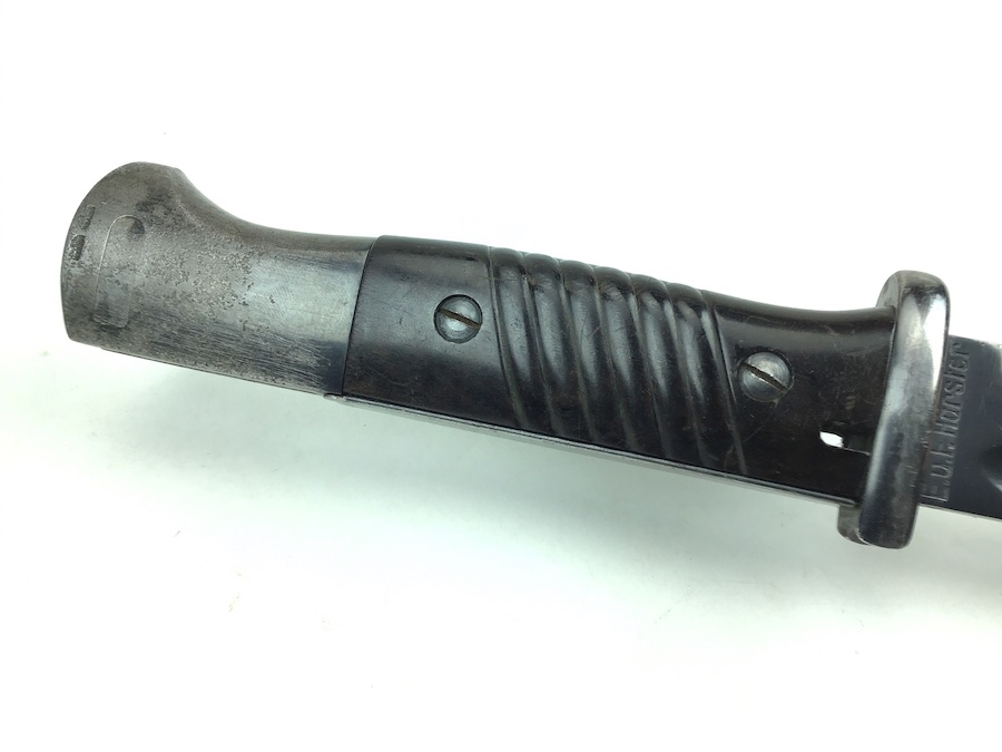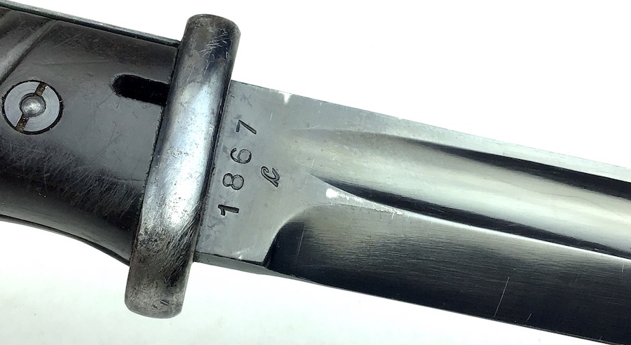 3/17/20 – Original and very good condition 1938 dated K98 bayonet. Ricasso stamped “1867” on one side and maker stamped on the other. Spine is date stamped “38”. Waffen stamped on the pommel, release button, grip spine and scabbard finial. Blade has 90%+ original bluing with minor scabbard wear. Bakelite grip is tight with no cracks or chips. Frog is maker stamped but is not readable. Scabbard is matching to the bayonet, but the frog makes it difficult to get a picture of the number. Minor wear on the pommel as shown in photos.