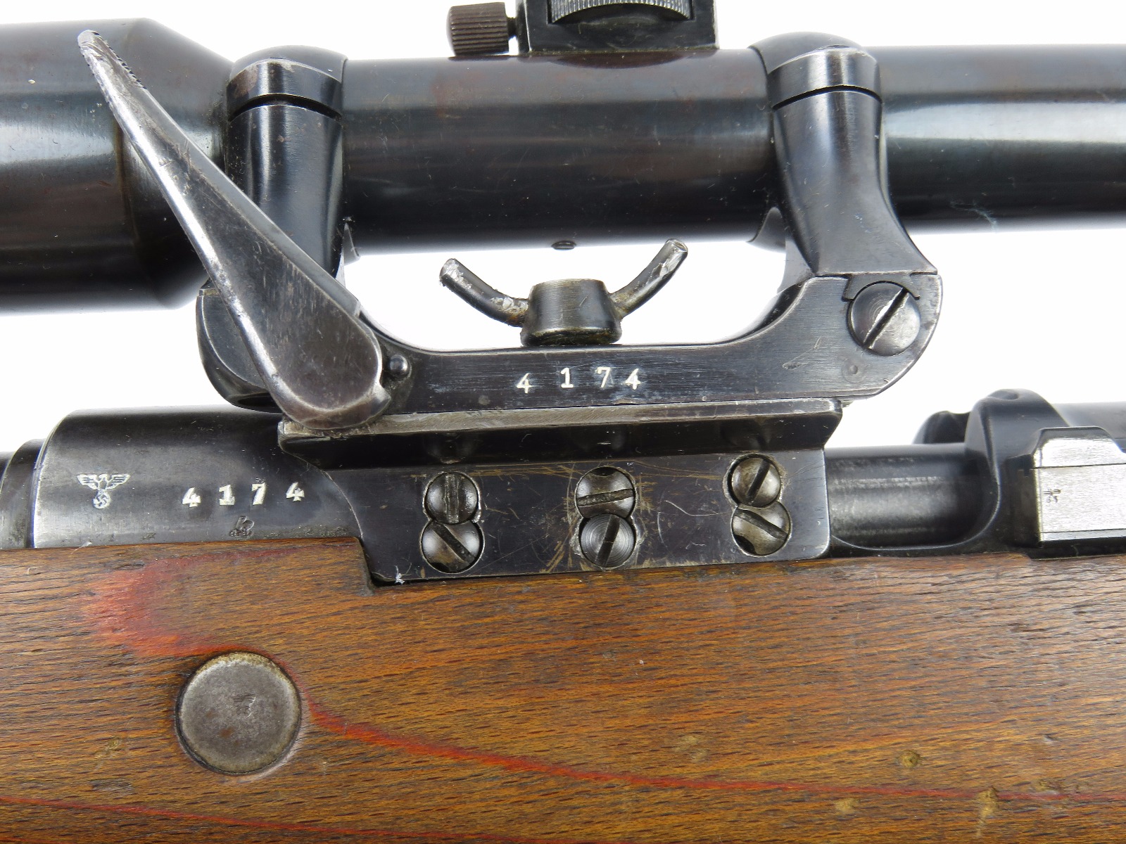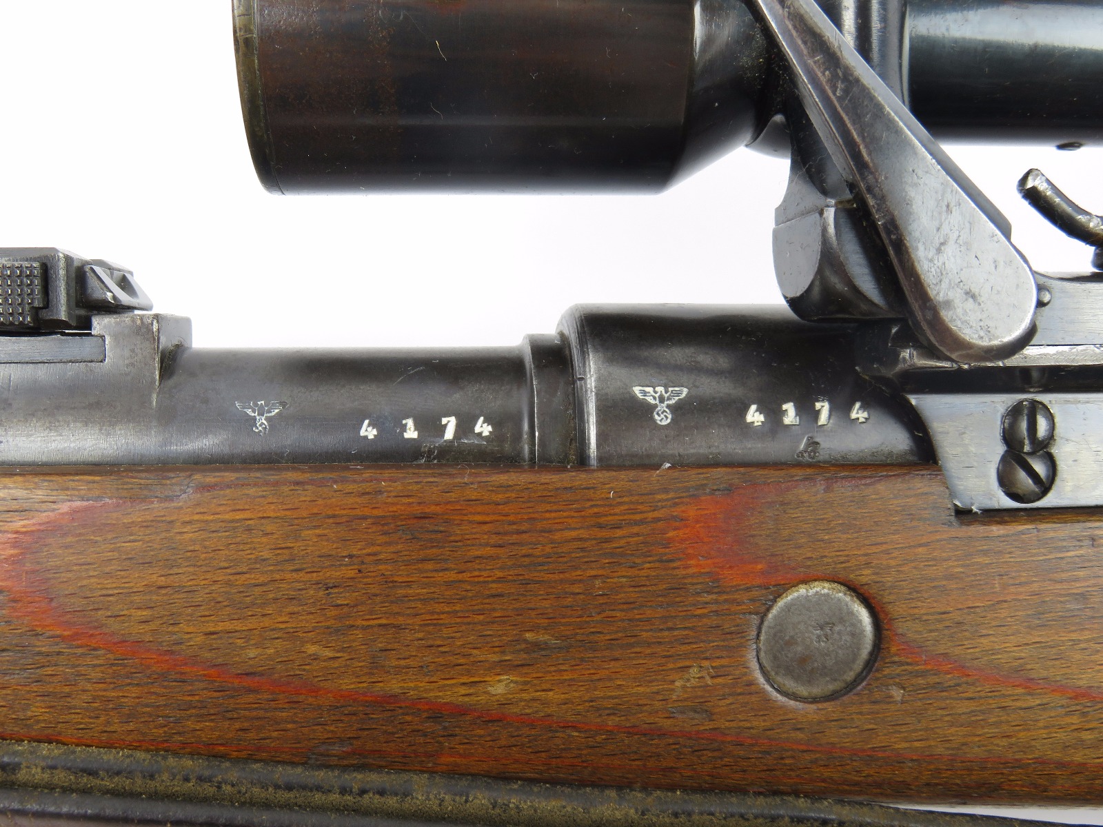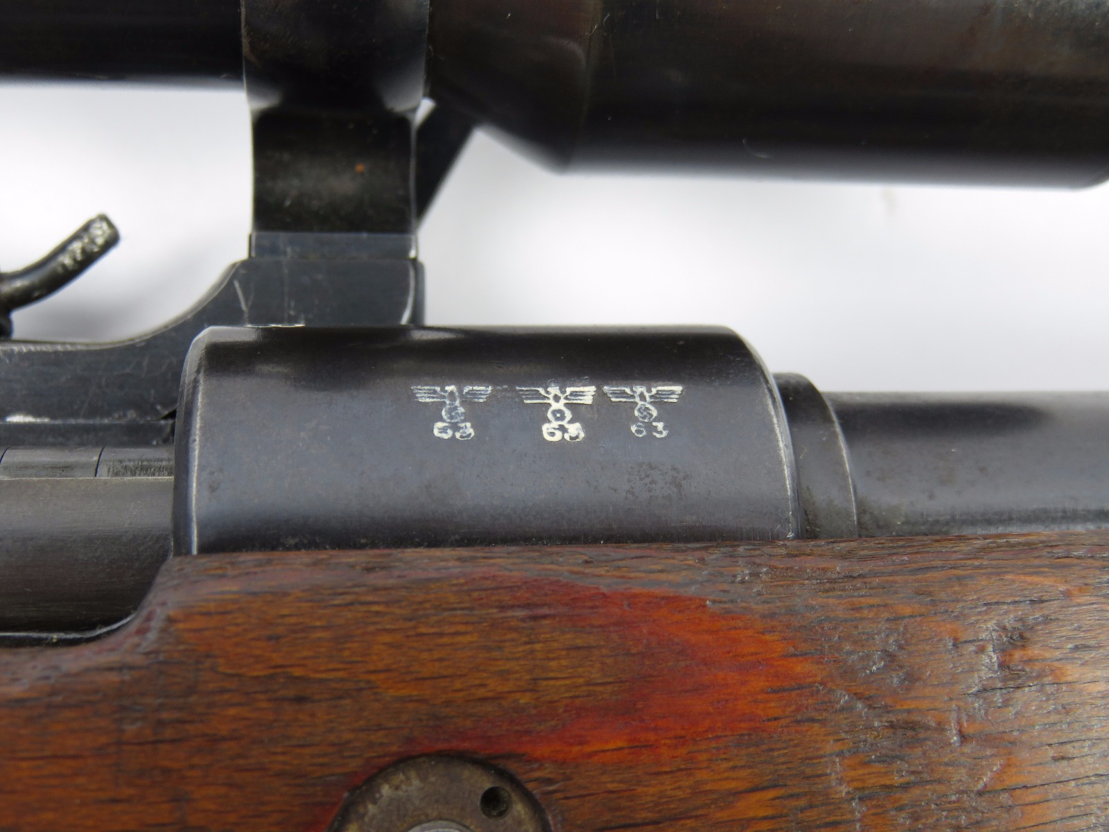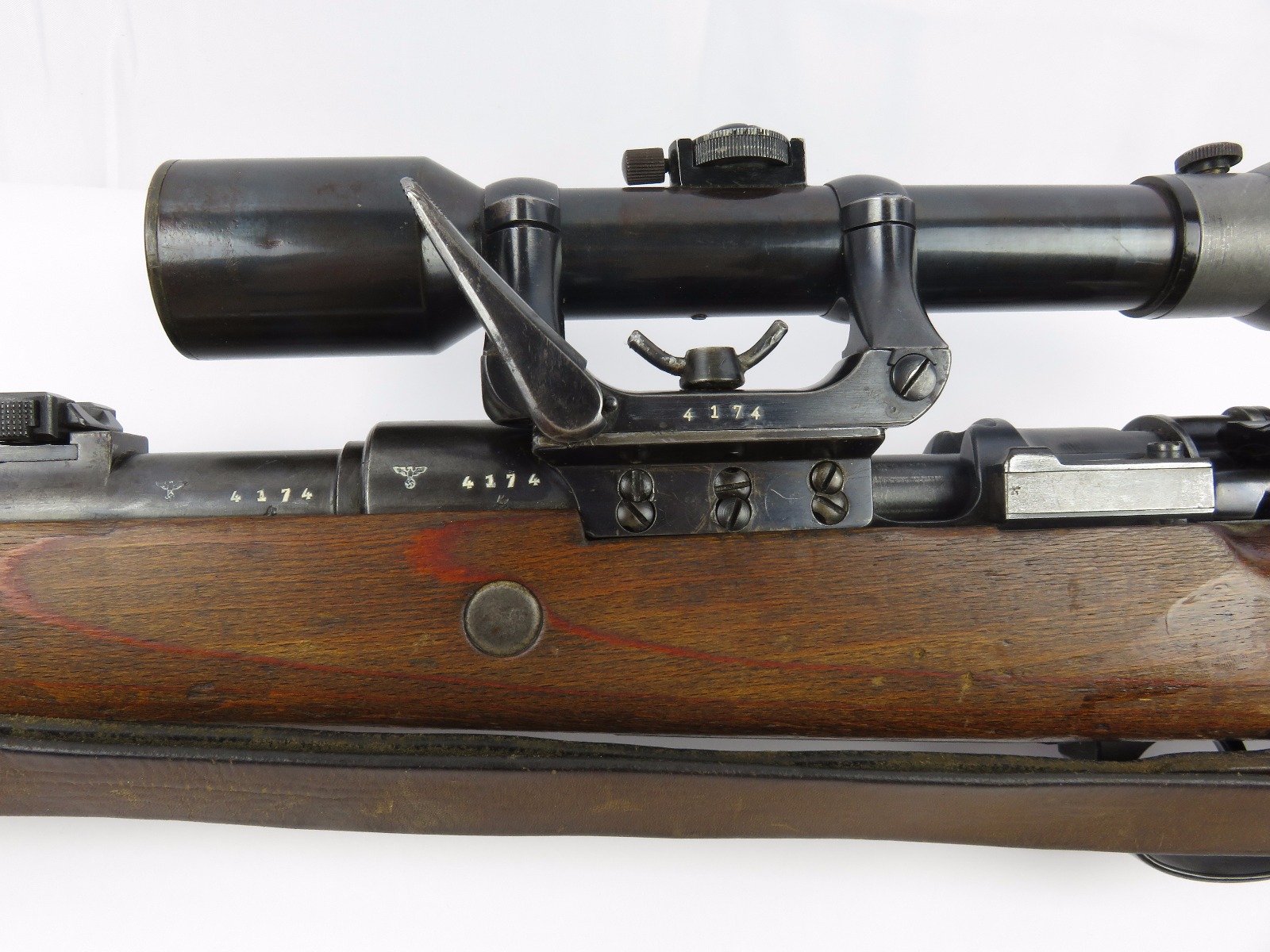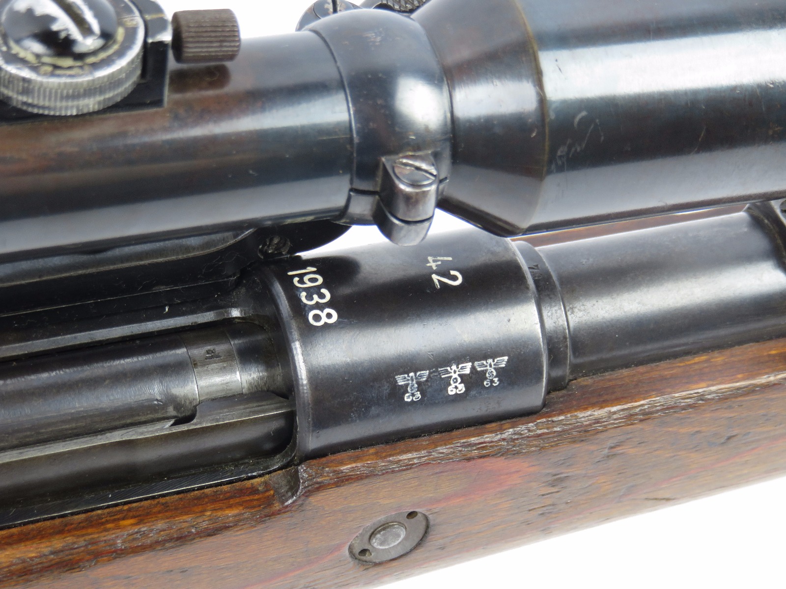 9/28/17 – This is an original WW2 production K98 sniper rifle. The rifle was produced in 1938 and is dated along with a “42” code on the receiver, which is a Mauser production code. The receiver and bolt of this rifle is all matching and correct with minimal wear. There is some surface patina but no notable flaws. The barrel has a little more discoloration as the metal gets closer to the muzzle, where there is a high-end fight sight and barrel cover. This is most likely original to the gun because of how the wear on the cover matches the wear on the muzzle area. It also makes sense that a sniper would want this type of cover for their front sight and barrel. The scope itself is in excellent condition with some browning wear throughout the high polish blued finish. The rear lens has a phosphated finish which is unique. Appears all original and correct. The optics are crystal clear and the reticle is crisp. The scope mount is serial numbered to the gun, and we speculate that this isn’t correct, as the scopes were made in different factories than the guns. However, the font is very close, if not exact to the WW2 German style. Also, the mount fits the wood stock perfectly and there are no signs of tampering. This could very well be the original scope that was issued with this sniper rifle. The stock is lightly sanded, and there is some minor wood chewing at the lower end of the butt plate. Overall the stock is in great shape with no major issues though. There are multiple eagle/63 eagle proof stamps on the side and underside of the wood. (Two underside and Two on the side of the stock, with one additional eagle-only stamp on the side of the stock.) The parts are all matching, correct, and original guaranteed.