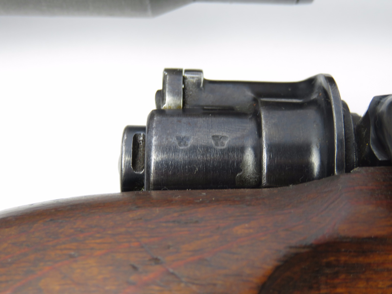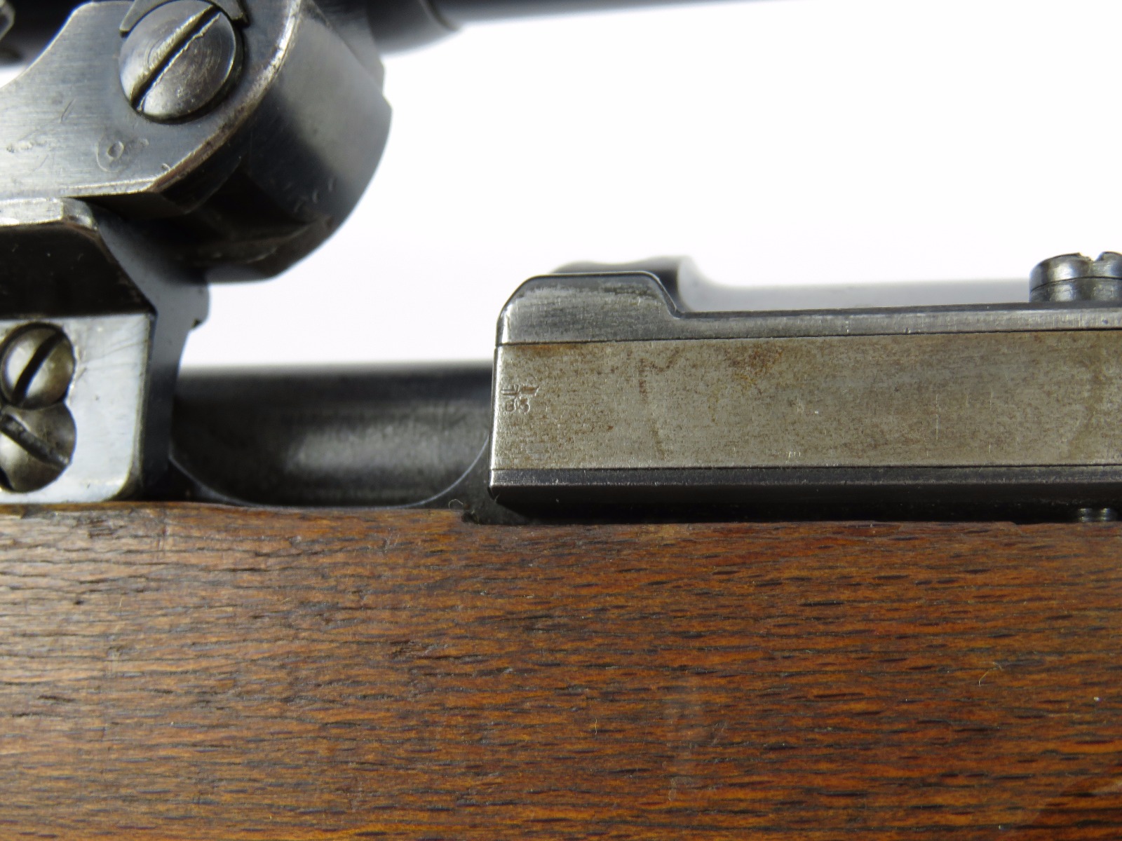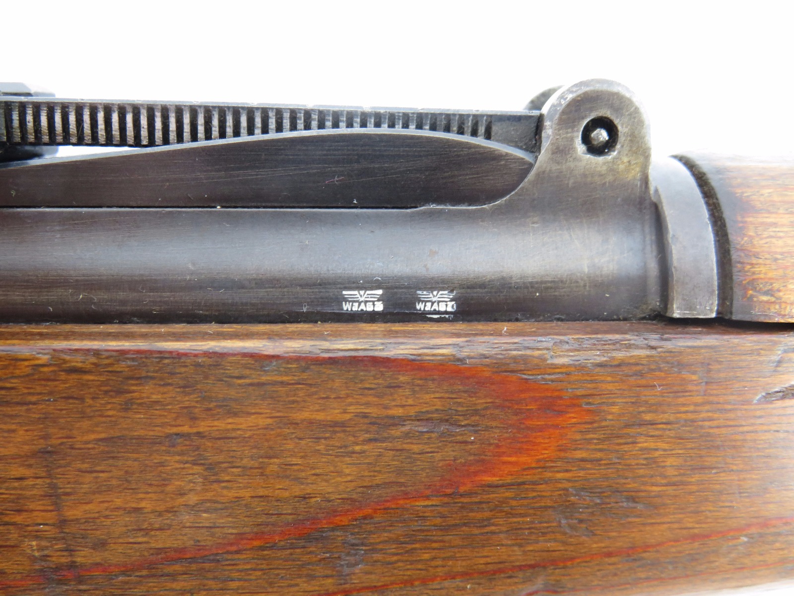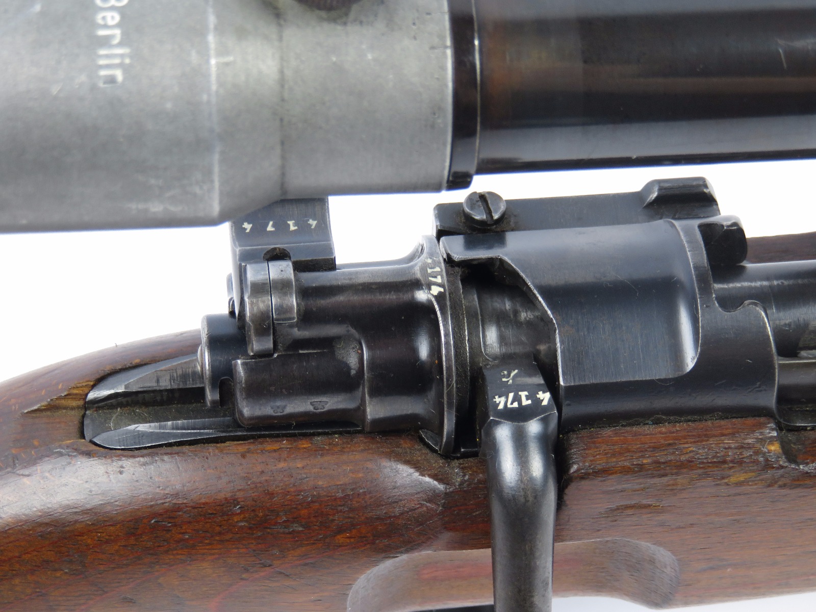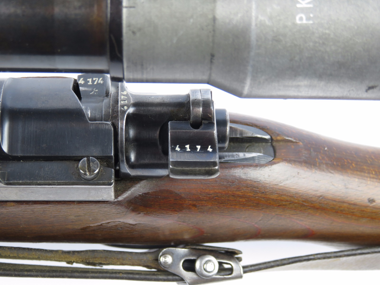 9/28/17 – This is an original WW2 production K98 sniper rifle. The rifle was produced in 1938 and is dated along with a “42” code on the receiver, which is a Mauser production code. The receiver and bolt of this rifle is all matching and correct with minimal wear. There is some surface patina but no notable flaws. The barrel has a little more discoloration as the metal gets closer to the muzzle, where there is a high-end fight sight and barrel cover. This is most likely original to the gun because of how the wear on the cover matches the wear on the muzzle area. It also makes sense that a sniper would want this type of cover for their front sight and barrel. The scope itself is in excellent condition with some browning wear throughout the high polish blued finish. The rear lens has a phosphated finish which is unique. Appears all original and correct. The optics are crystal clear and the reticle is crisp. The scope mount is serial numbered to the gun, and we speculate that this isn’t correct, as the scopes were made in different factories than the guns. However, the font is very close, if not exact to the WW2 German style. Also, the mount fits the wood stock perfectly and there are no signs of tampering. This could very well be the original scope that was issued with this sniper rifle. The stock is lightly sanded, and there is some minor wood chewing at the lower end of the butt plate. Overall the stock is in great shape with no major issues though. There are multiple eagle/63 eagle proof stamps on the side and underside of the wood. (Two underside and Two on the side of the stock, with one additional eagle-only stamp on the side of the stock.) The parts are all matching, correct, and original guaranteed.