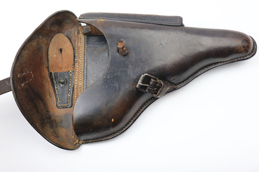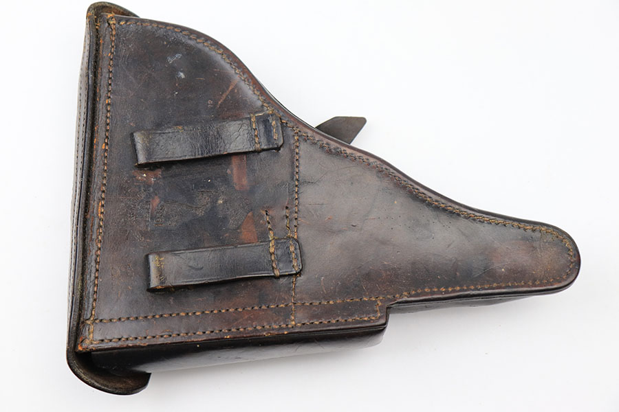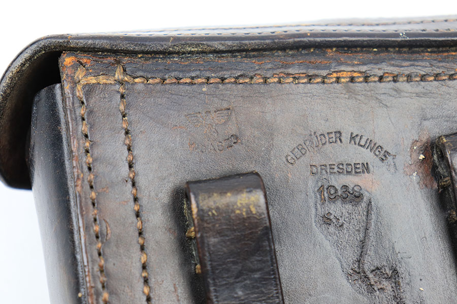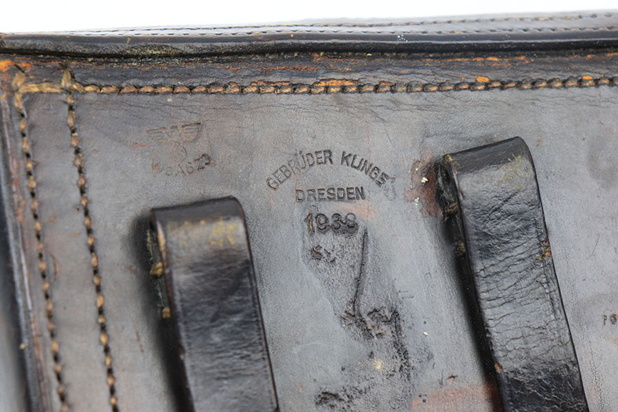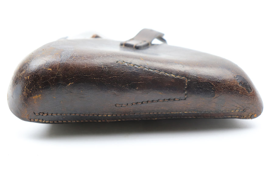 5/6/21 – This is an original 1938 Luger holster with some mild issues. First the closure strap has been repaired with some stitching about halfway down into the holster. Second, the closure strap appears to be replaced, and there is a small chunk of leather missing towards the end of the strap. The rest of the leather and stitching is original and in good condition. The leather has some surface wrinkling and mild scuffing. The back leather has a maker stamp, waffen proof, and date stamp.