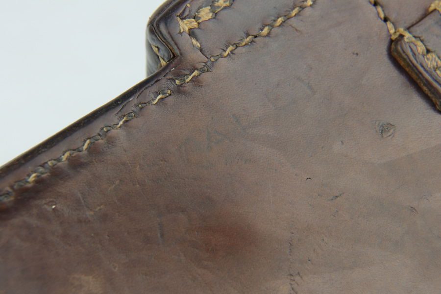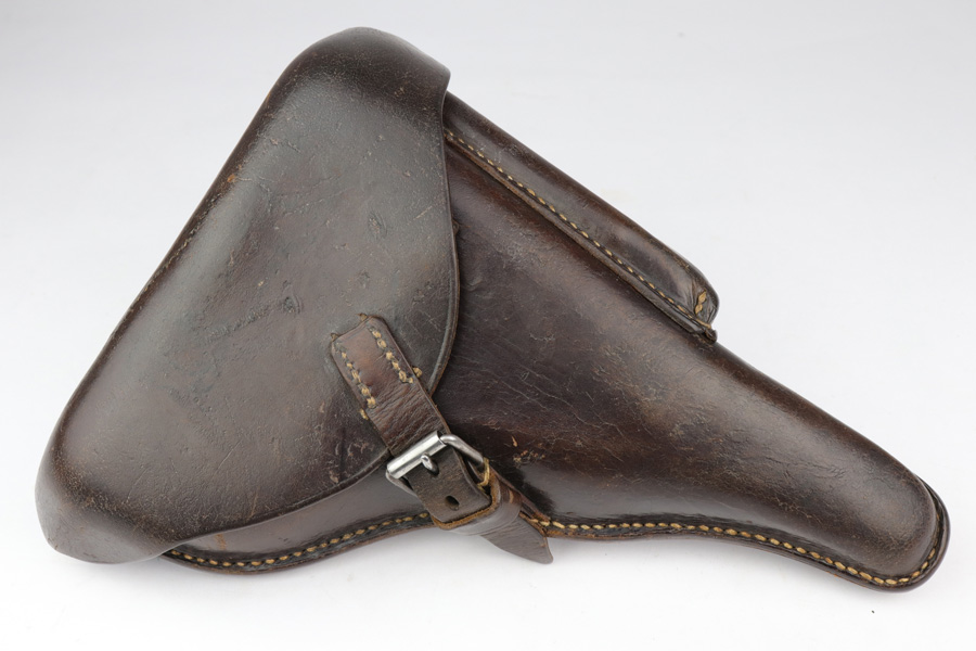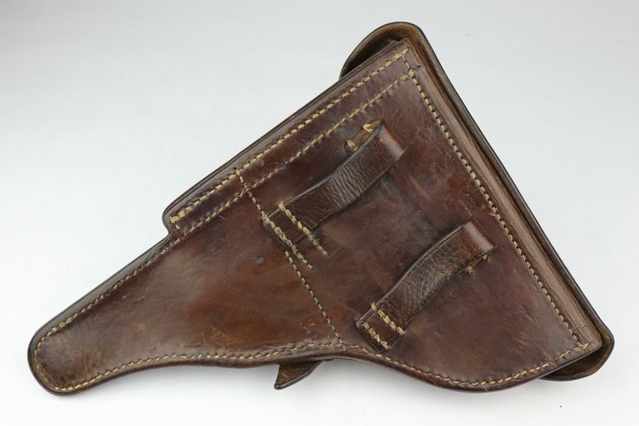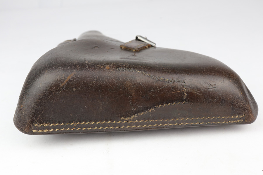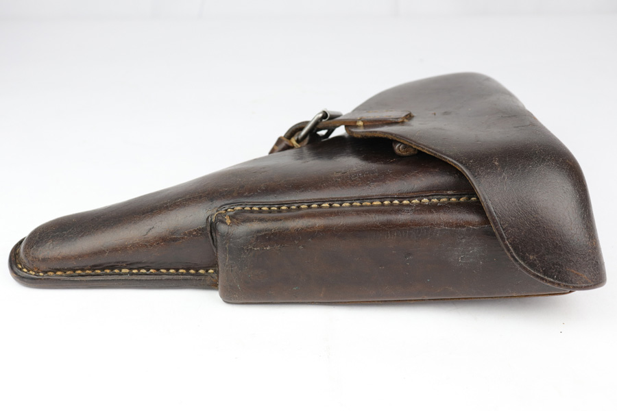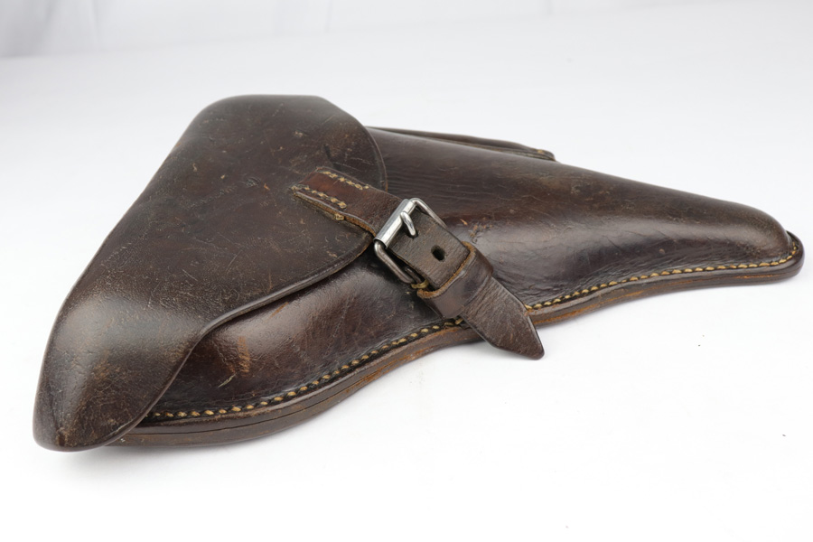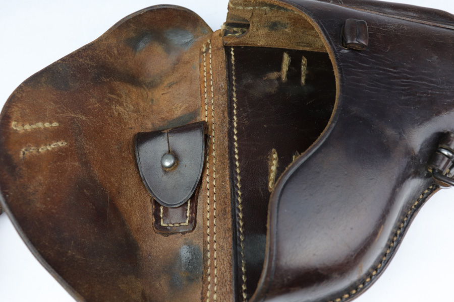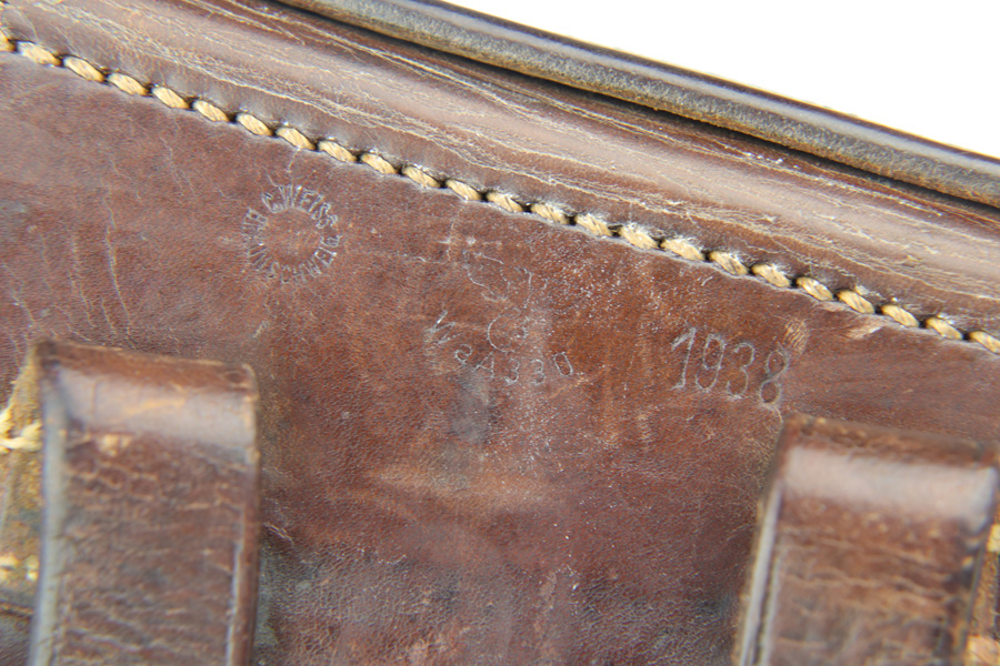 12/10/18 – This is an original 1938 dated Luger holster from WW2. The back of this holster is “C.Weiss” maker stamped with a 1938 date stamp, and WaA330 military proof. The exterior leather has some surface wrinkling and wear, mostly on the front of the holster. The leather has normal pliability. There’s a VERY faint “LT. Staley” imprinted into the back leather – see photos. Guaranteed original and authentic.