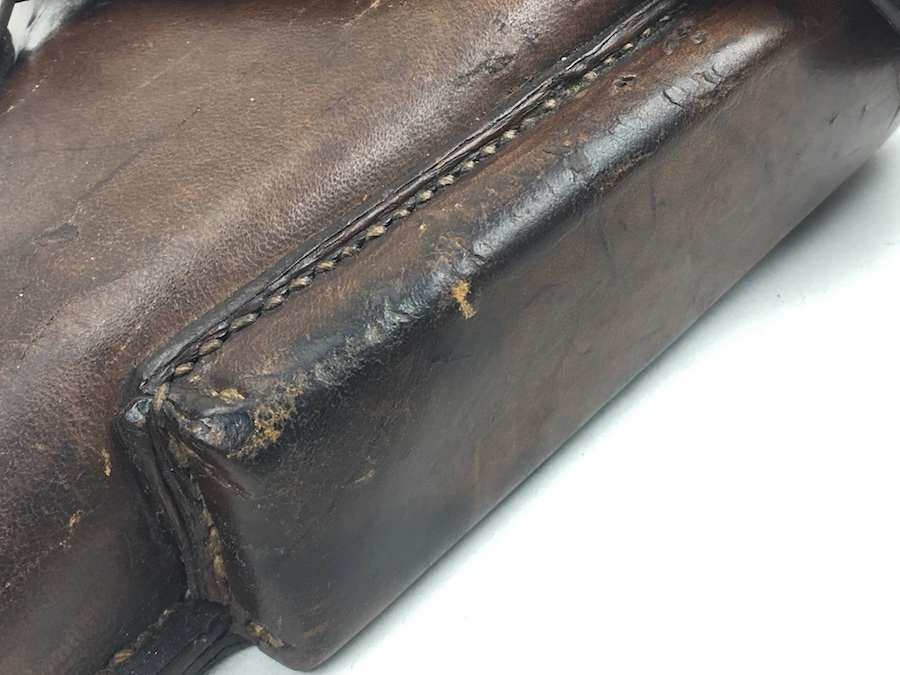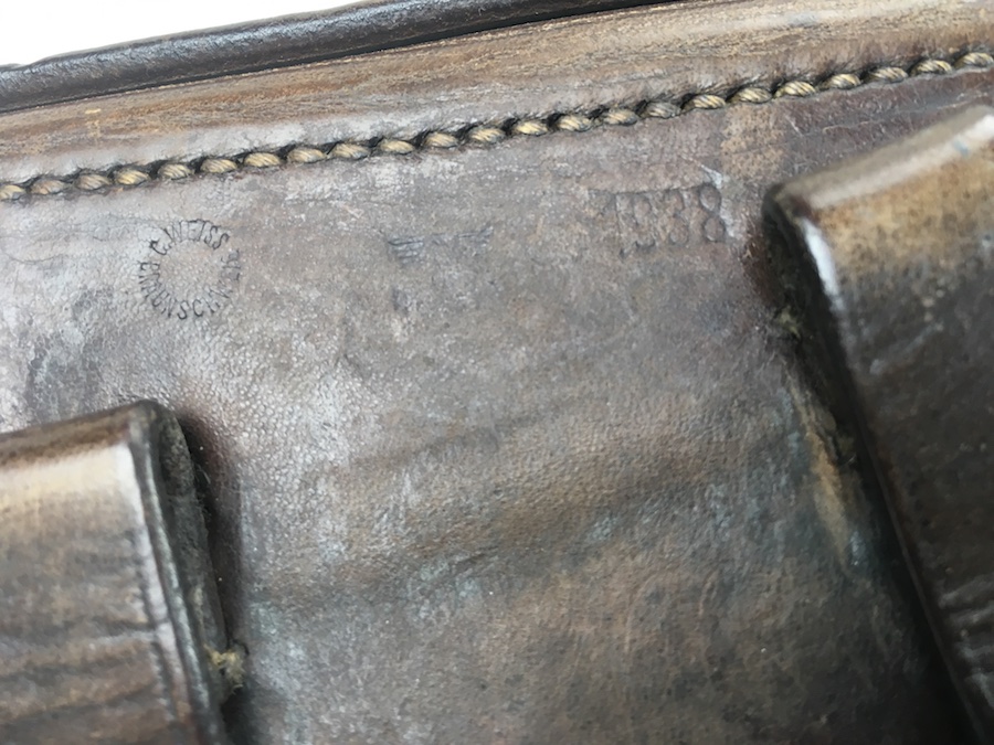 7/12/19 – This is an original 1938 dated Luger holster from WW2. The back of this holster is “C.Weiss” maker stamped with a 1938 date stamp, and a faint, but visible, military proof. The exterior leather has minimal surface wear. The leather has normal pliability. Original and intact stitching. Clean interior with secure lift strap. Guaranteed original and authentic.