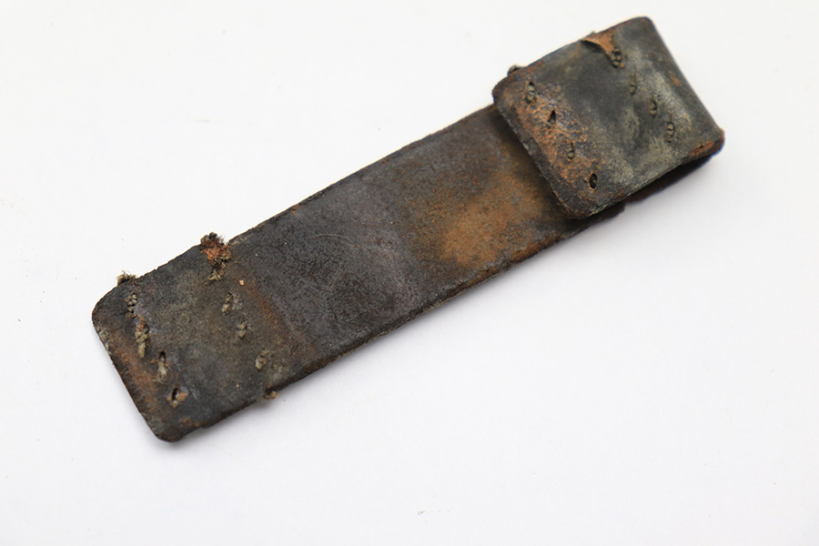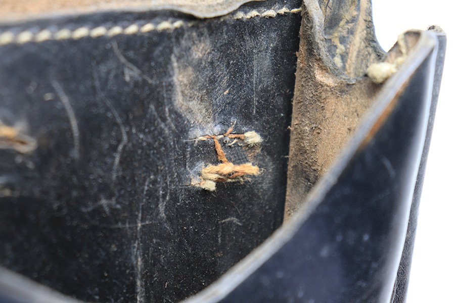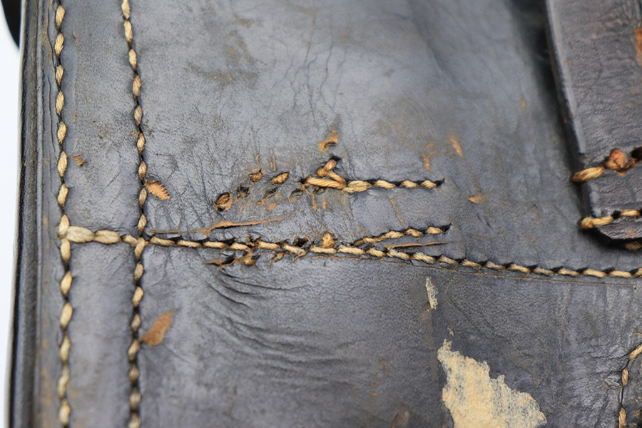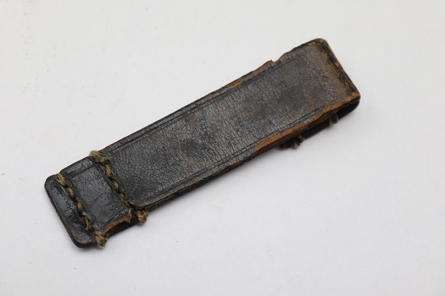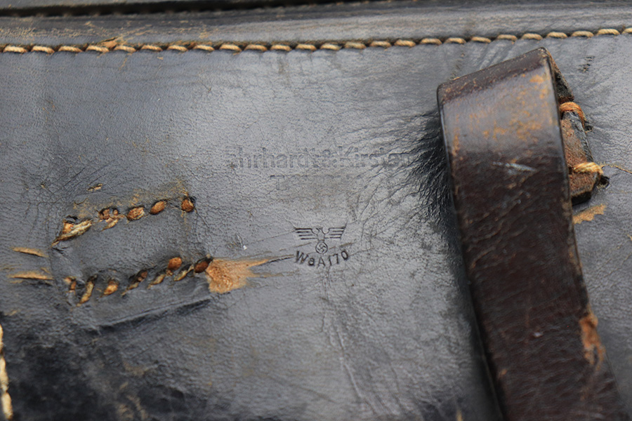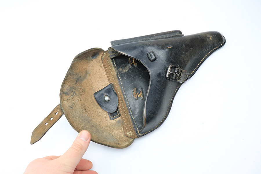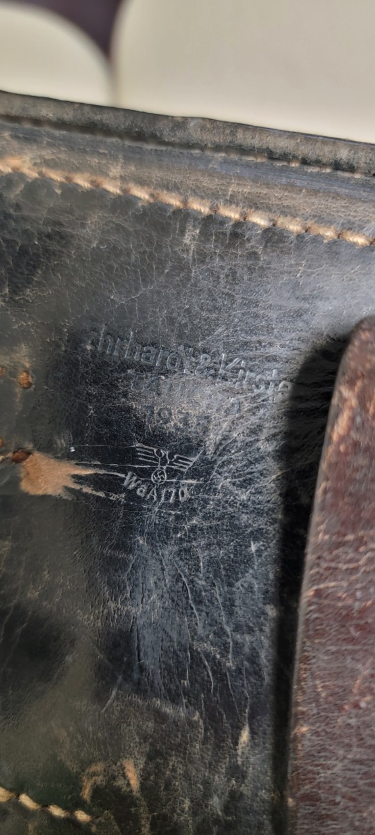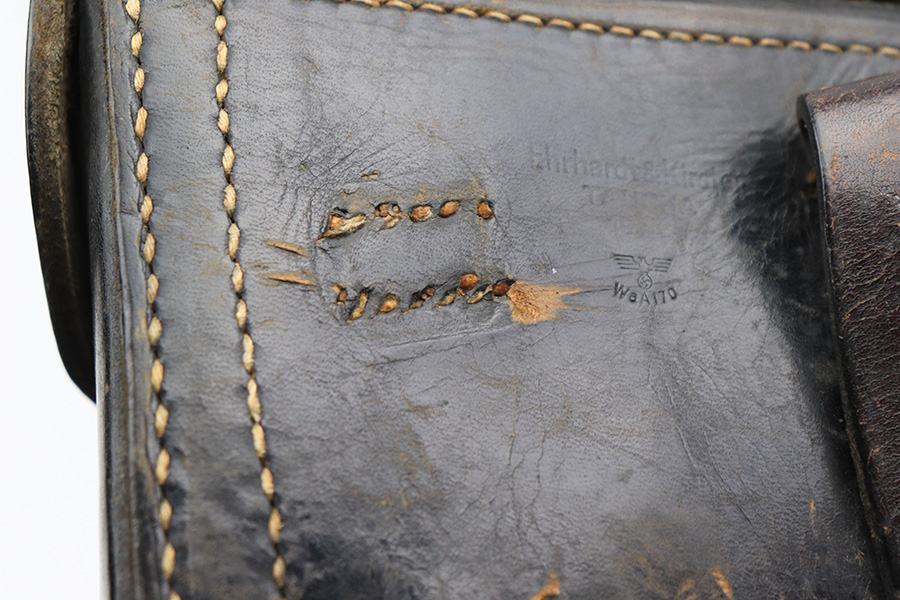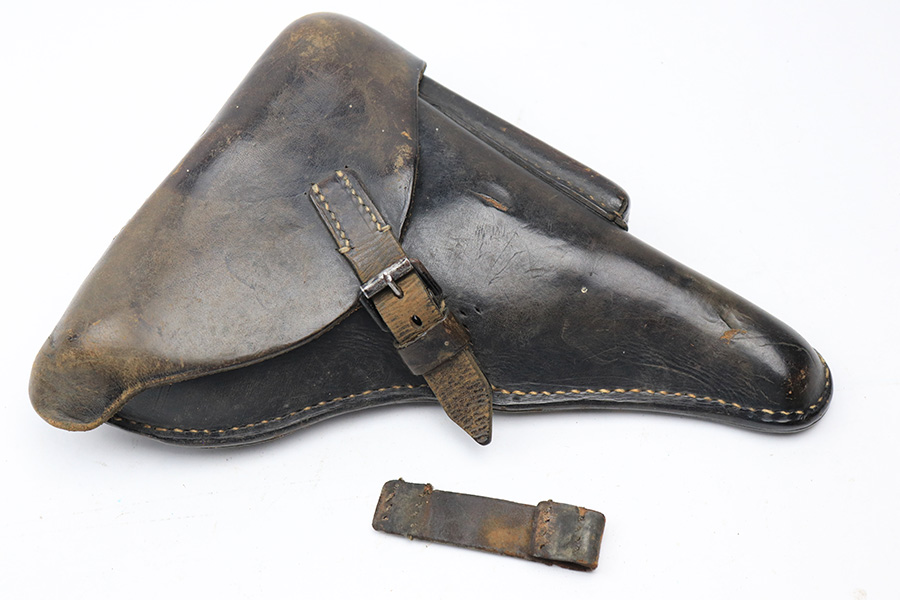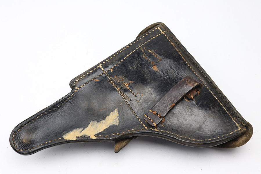 5/11/22 – This is an original 1938 dated Luger holster. The holster is maker stamped, dated, and waffen proofed on the back leather. The date stamp is hard to read, but still visible. One of the back belt loops is missing, but included (separate), and the other belt loop is a replacement. See photos. There some surface residue on the lower portion of the back leather, but this doesn’t affect the structure of the item. The rest of the leather and stitching is in great condition and all original. Price reduced according to condition.