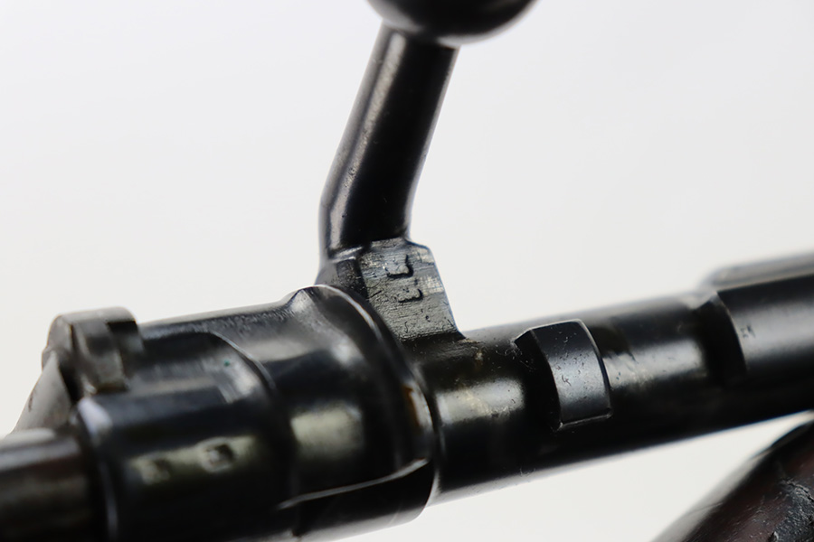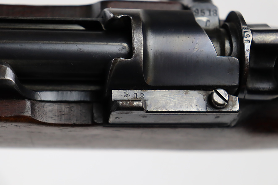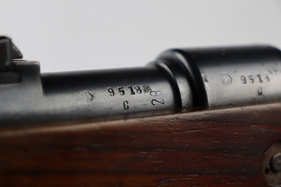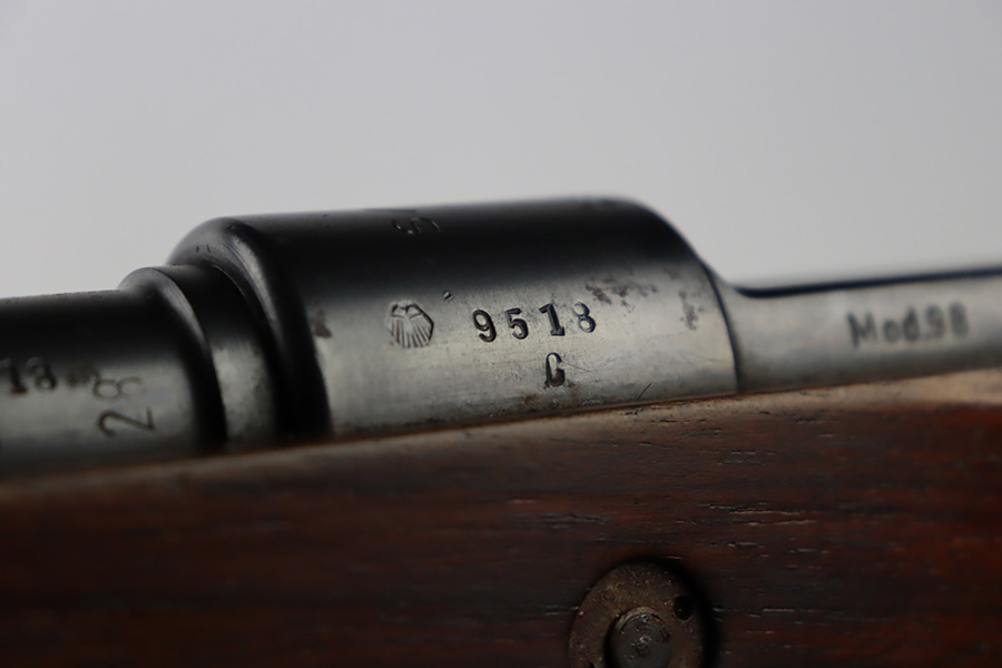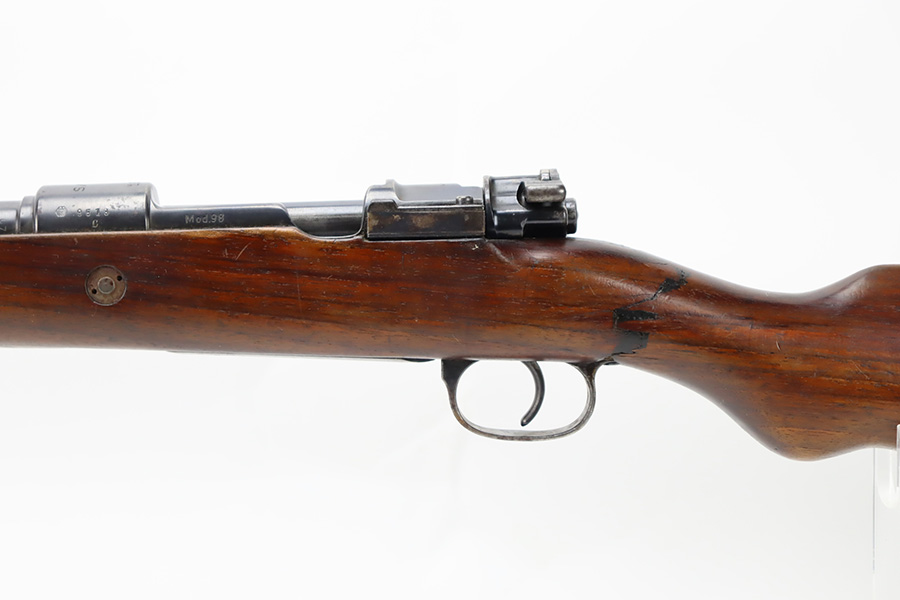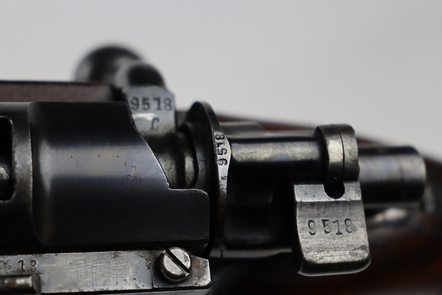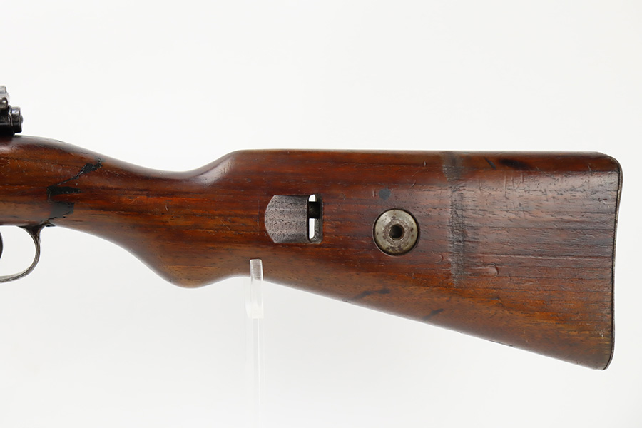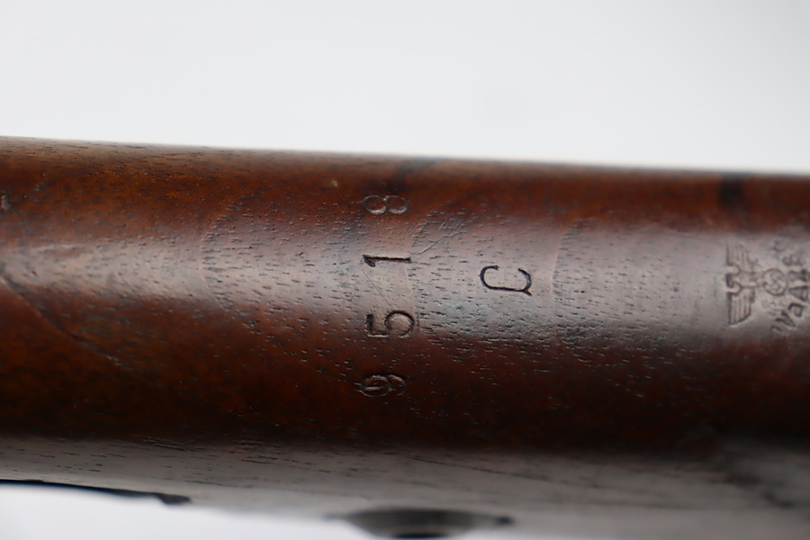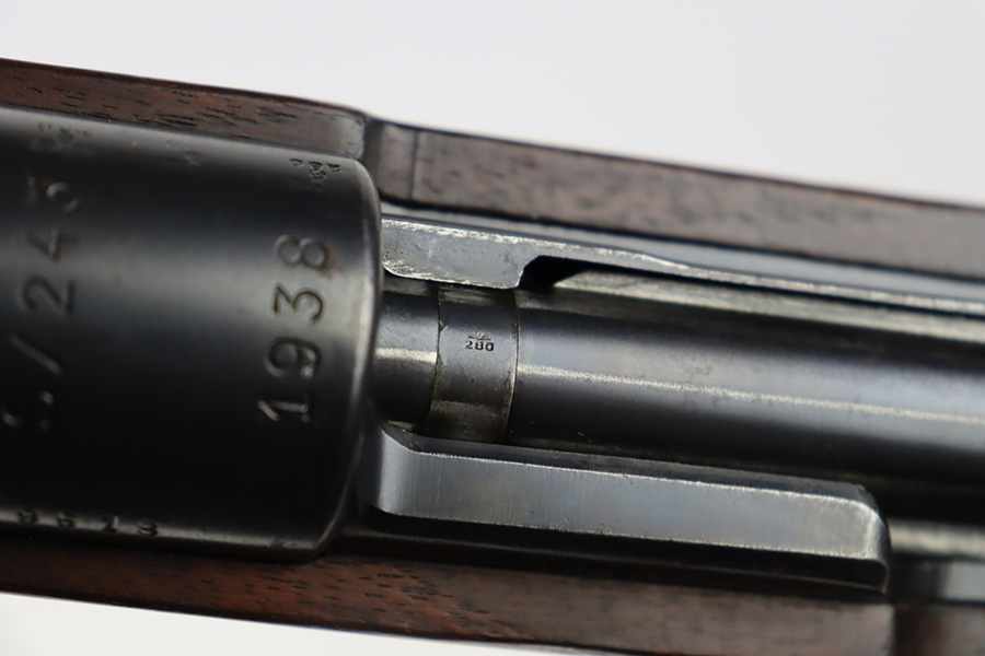 105/23 – This is a very nice example of a Mauser K98 from 1938. This one happens to have a rare “S/243” Mauser maker code. The gun is completely matching with the proper military proofs throughout. The bluing rates about 93%. While there is not much actual finish loss, there are areas of spotty oxidation here and there, most noticeable on the barrel bands, floor plate/trigger group, and on the butt plate. The stock has nice and crisp markings, but there is a significant repaired crack around the wrist. Mint bore.