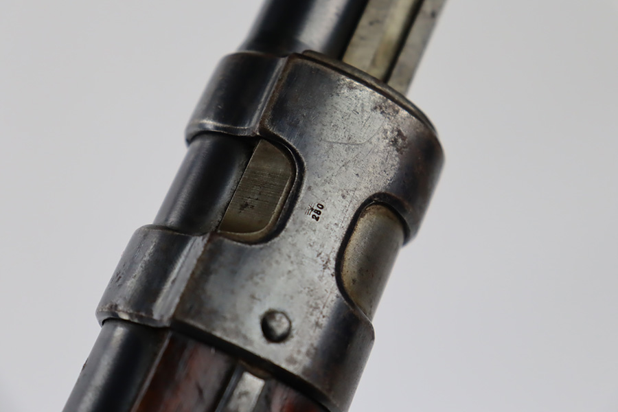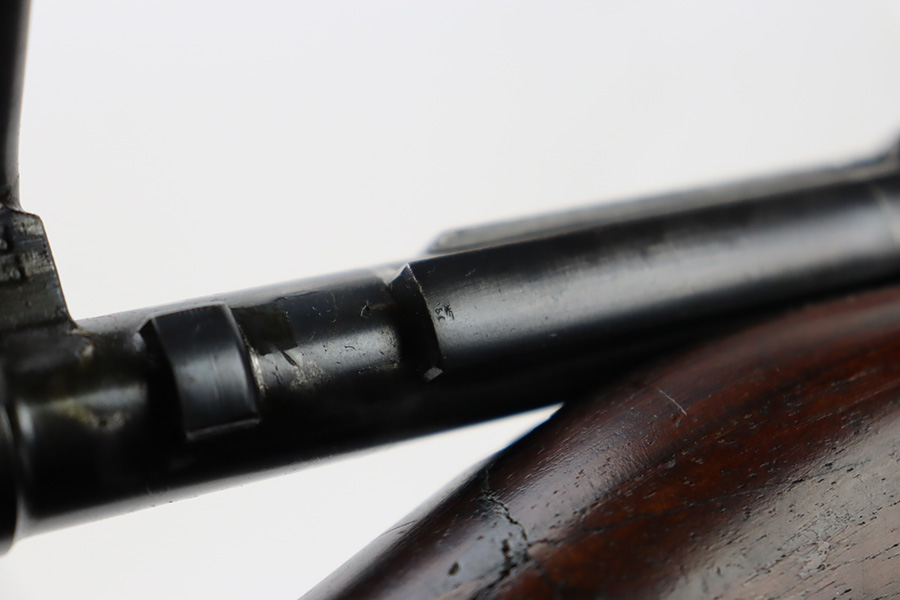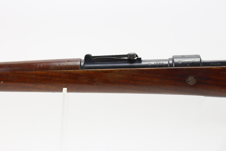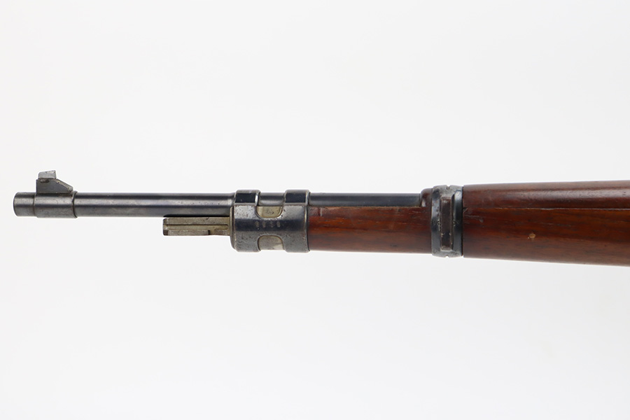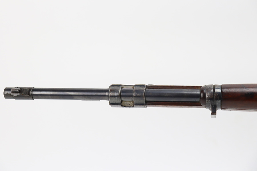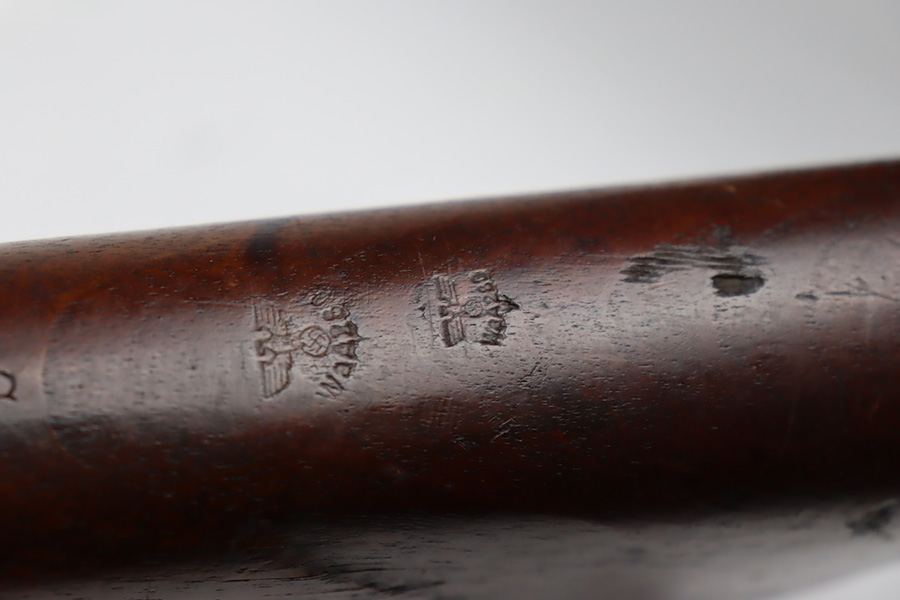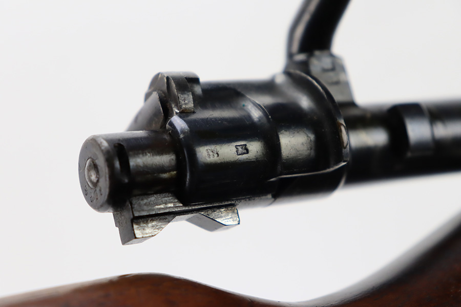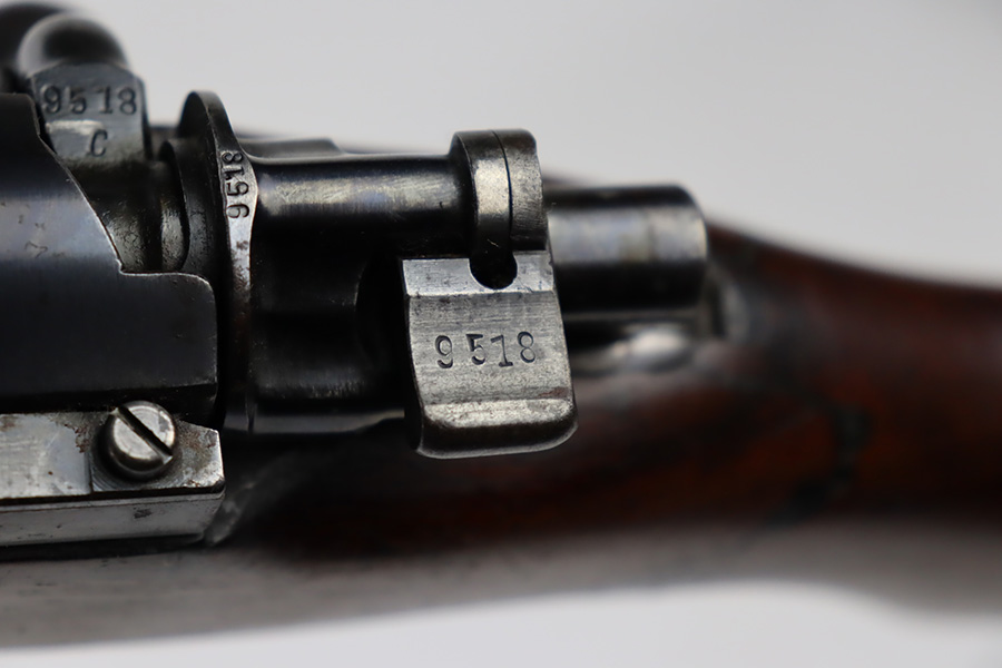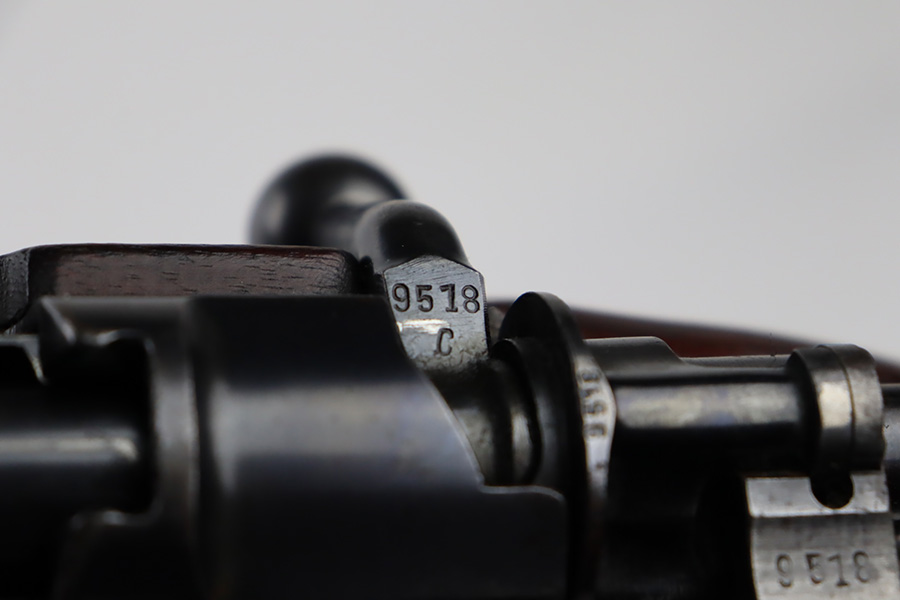 105/23 – This is a very nice example of a Mauser K98 from 1938. This one happens to have a rare “S/243” Mauser maker code. The gun is completely matching with the proper military proofs throughout. The bluing rates about 93%. While there is not much actual finish loss, there are areas of spotty oxidation here and there, most noticeable on the barrel bands, floor plate/trigger group, and on the butt plate. The stock has nice and crisp markings, but there is a significant repaired crack around the wrist. Mint bore.