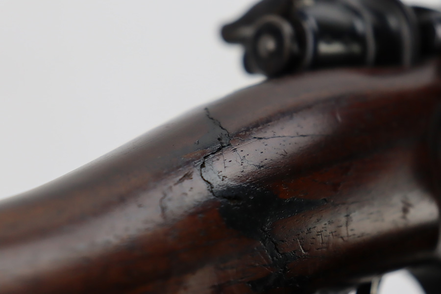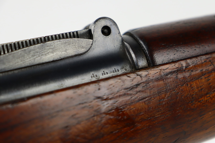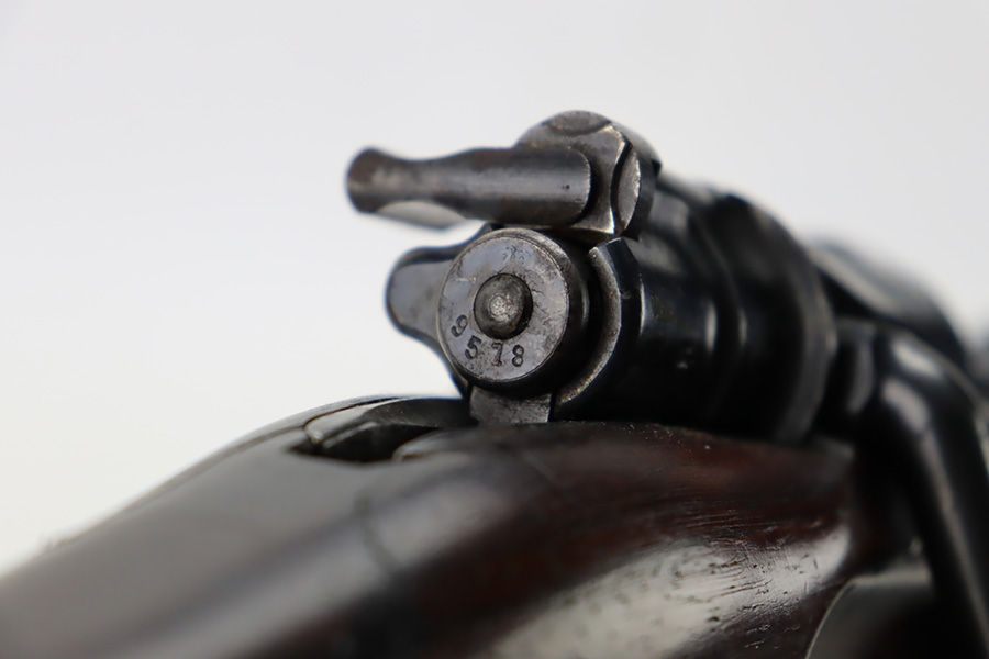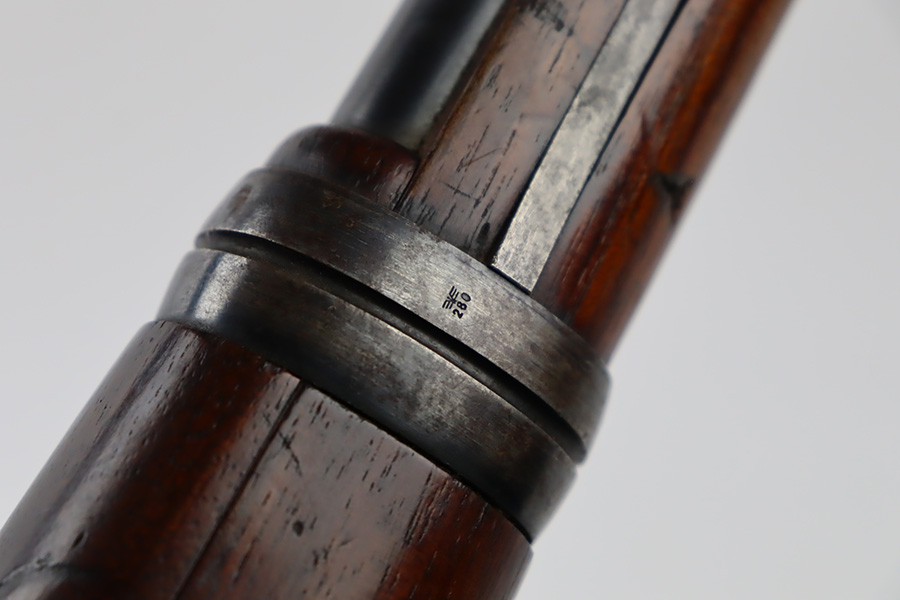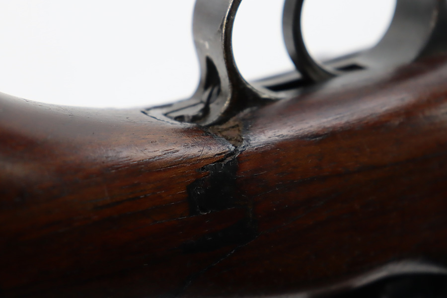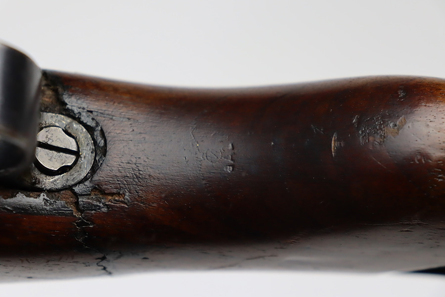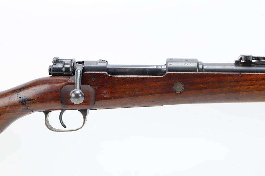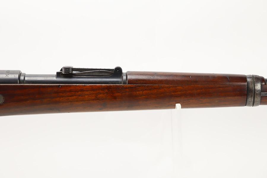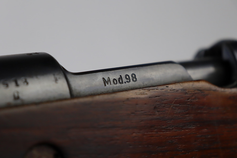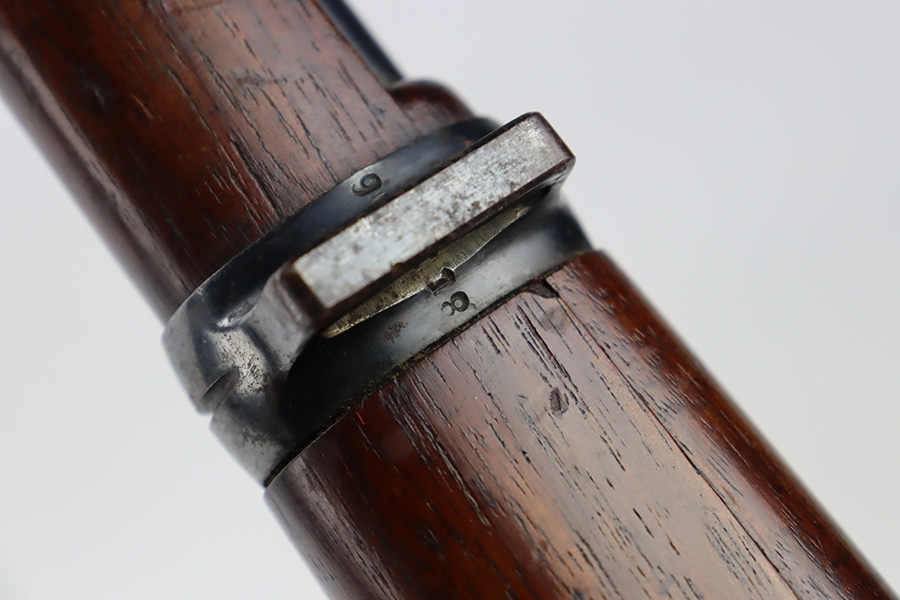 105/23 – This is a very nice example of a Mauser K98 from 1938. This one happens to have a rare “S/243” Mauser maker code. The gun is completely matching with the proper military proofs throughout. The bluing rates about 93%. While there is not much actual finish loss, there are areas of spotty oxidation here and there, most noticeable on the barrel bands, floor plate/trigger group, and on the butt plate. The stock has nice and crisp markings, but there is a significant repaired crack around the wrist. Mint bore.