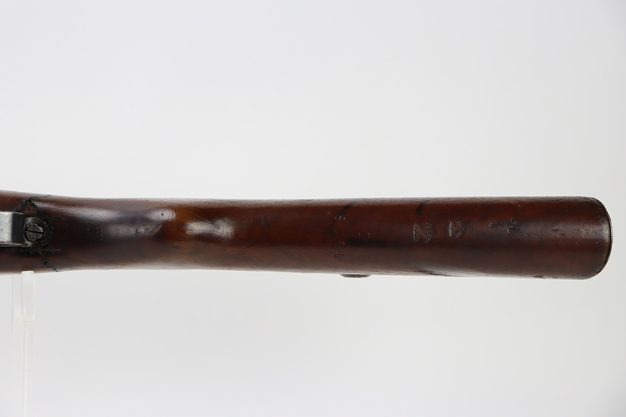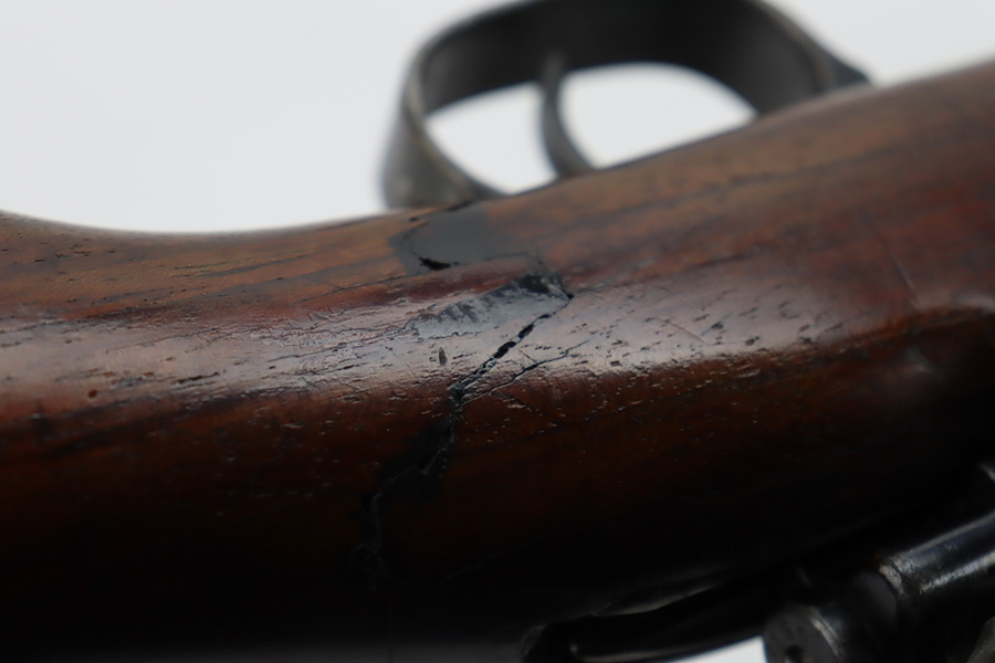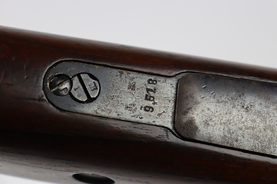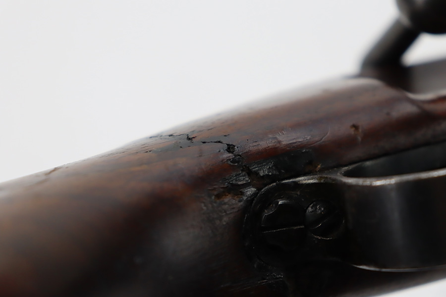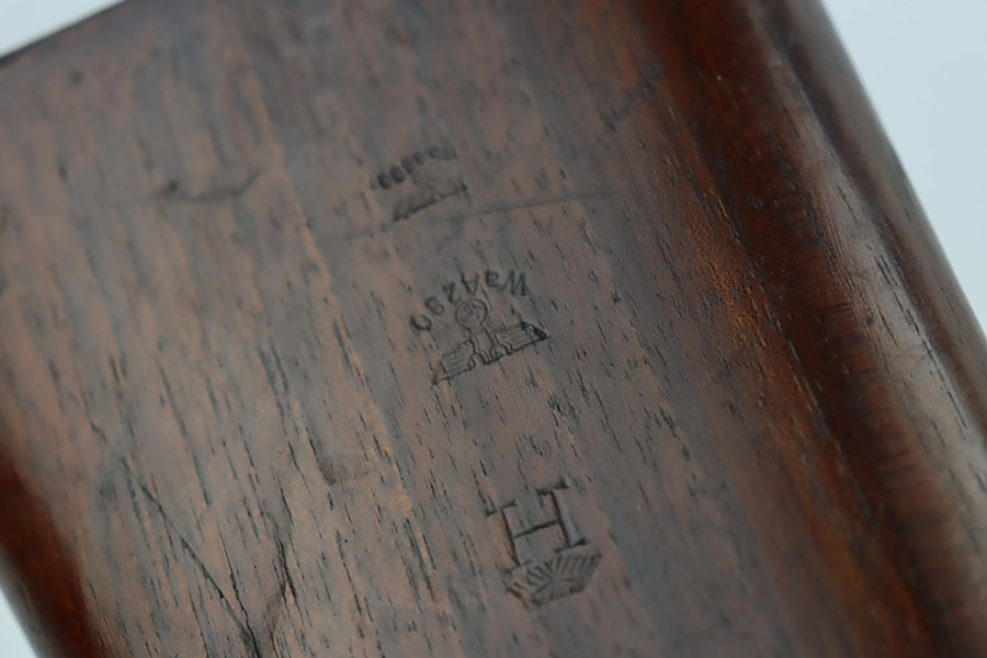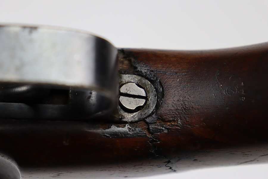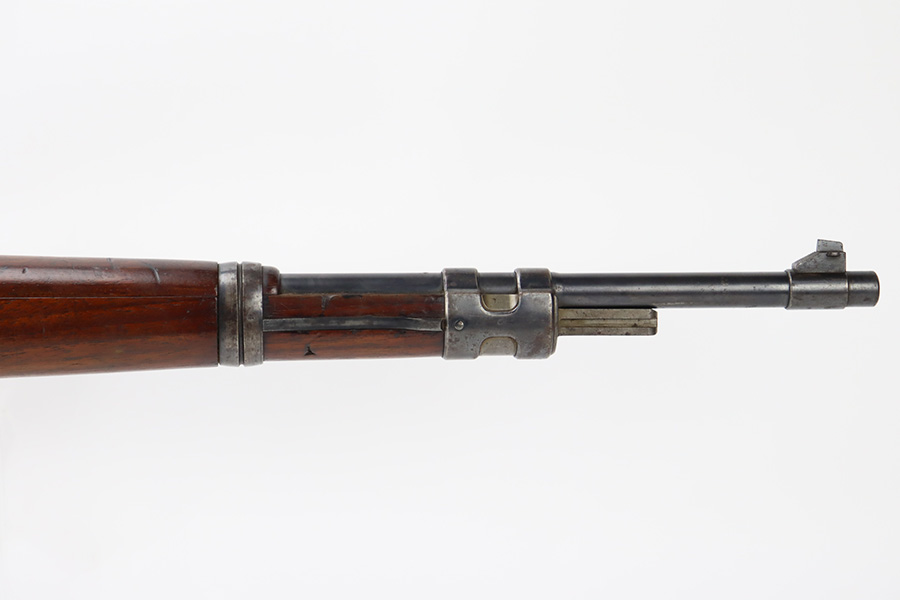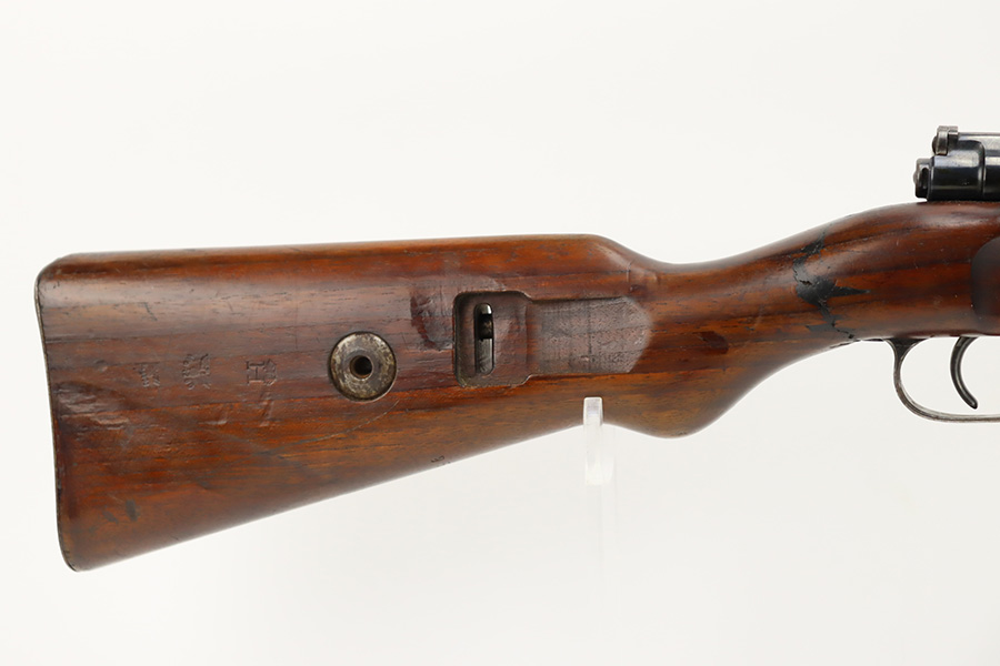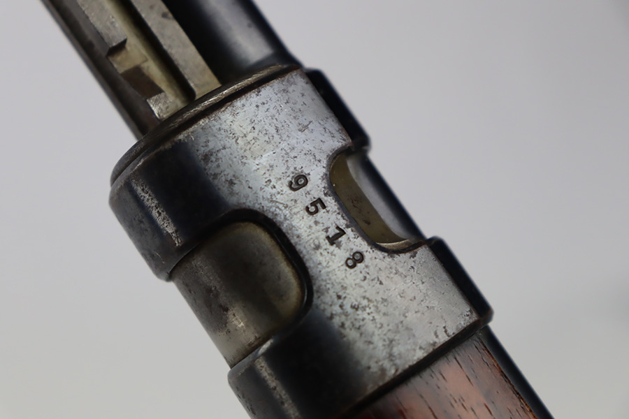 105/23 – This is a very nice example of a Mauser K98 from 1938. This one happens to have a rare “S/243” Mauser maker code. The gun is completely matching with the proper military proofs throughout. The bluing rates about 93%. While there is not much actual finish loss, there are areas of spotty oxidation here and there, most noticeable on the barrel bands, floor plate/trigger group, and on the butt plate. The stock has nice and crisp markings, but there is a significant repaired crack around the wrist. Mint bore.