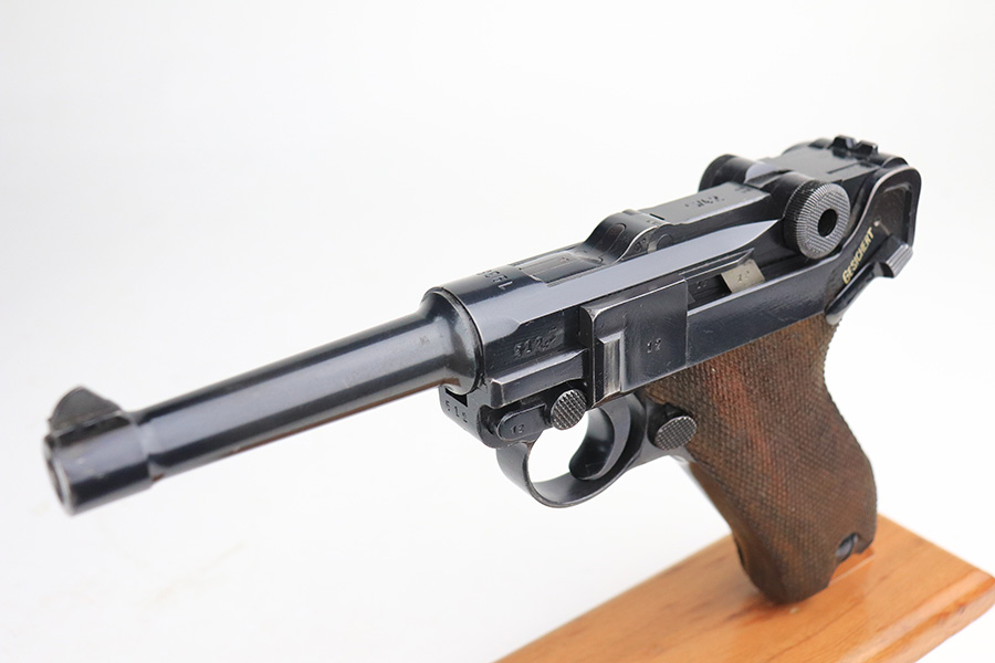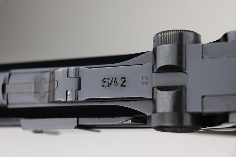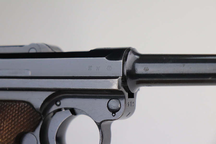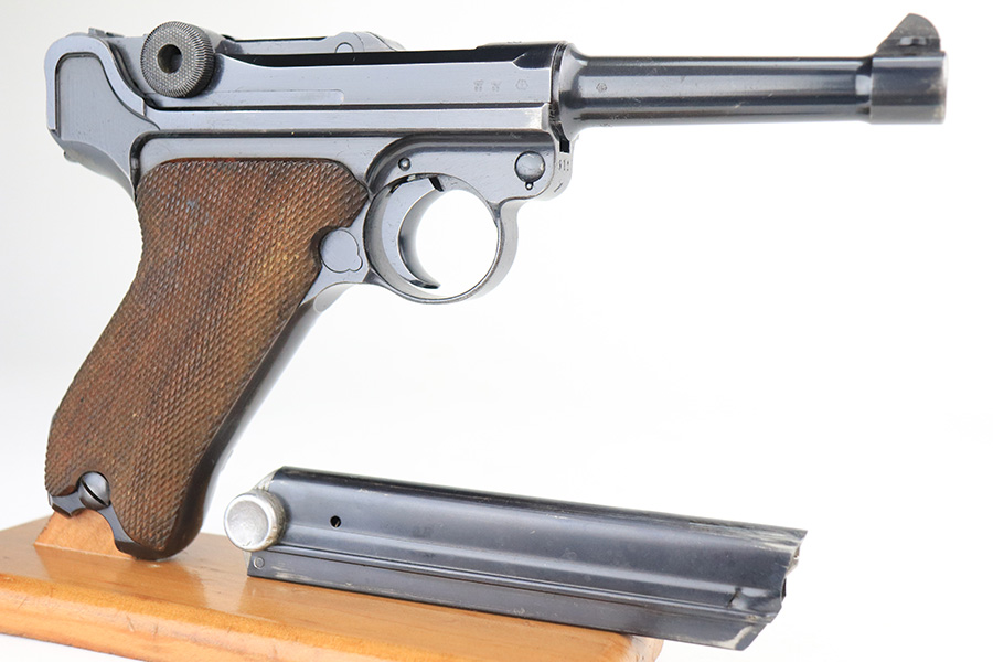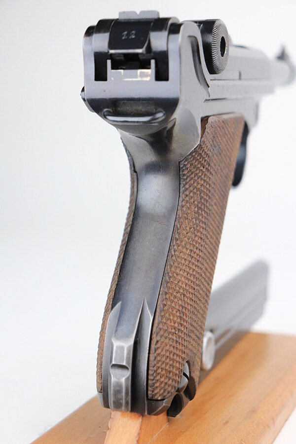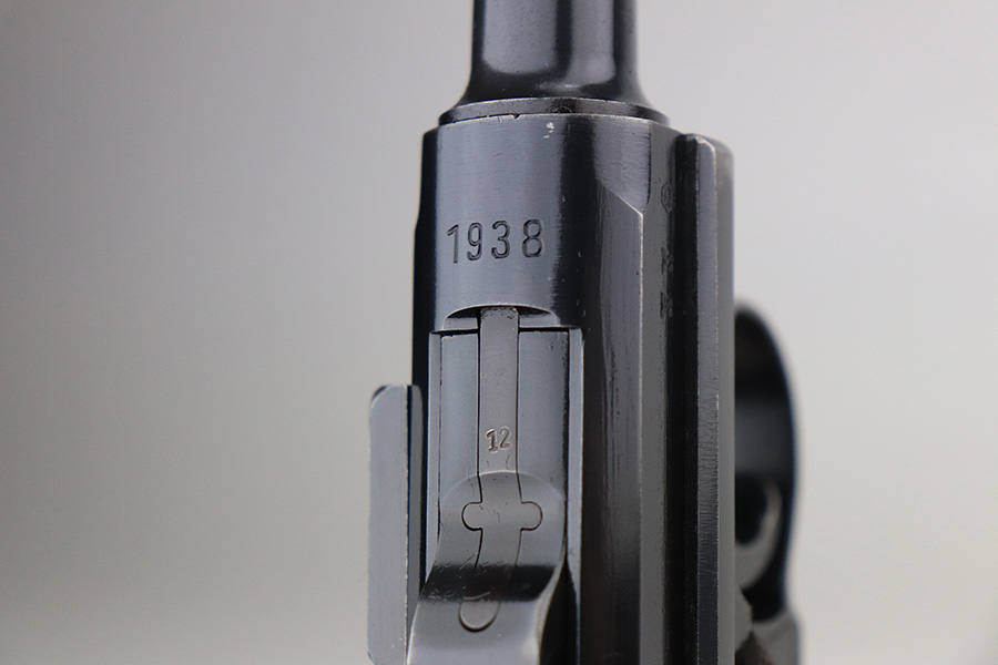 1/25/22 – This is a very nice example of a Mauser Luger issued to the Nazi military in 1938. The gun is all matching and has the proper “Eagle 63” Nazi military acceptance proofs on the right side of the slide. The gun has retained about 94% of its original finish. There are just hints of wear on the side plate, front edges of the side rails, and around the muzzle. Minor thinning on both grip straps and some light scratches/handling marks on the front strap. A couple of very tiny dings on the underside of the barrel. Comes with minty wood grips and a mismatched period-correct magazine. The bore has strong rifling with minor freckling here and there.