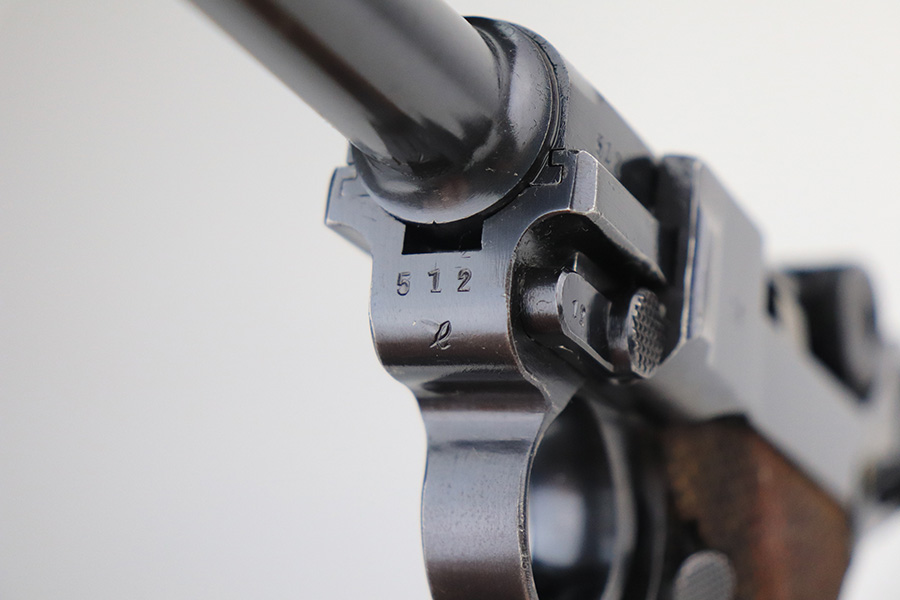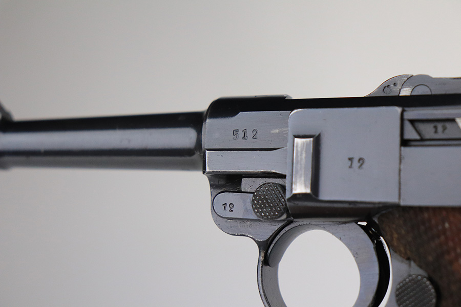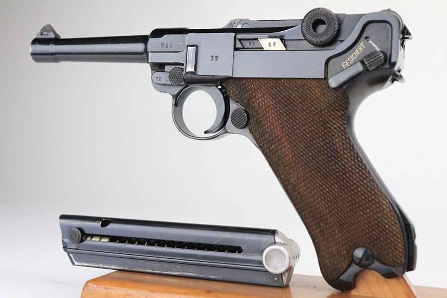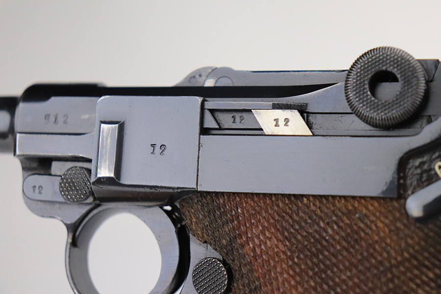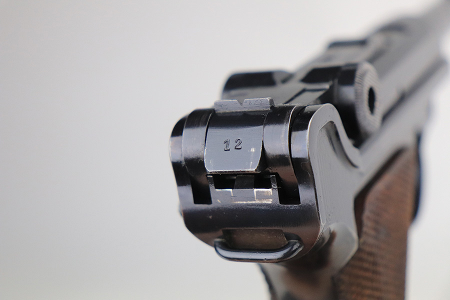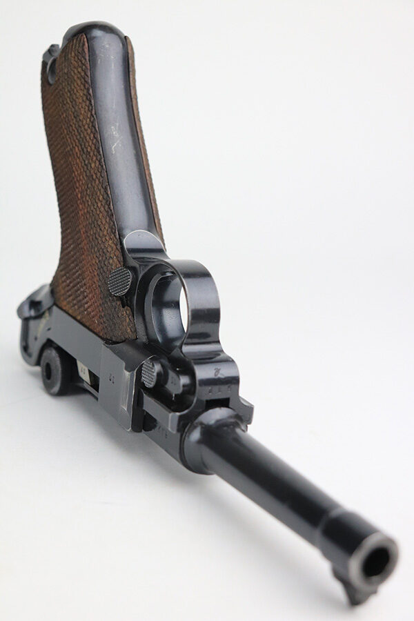 1/25/22 – This is a very nice example of a Mauser Luger issued to the Nazi military in 1938. The gun is all matching and has the proper “Eagle 63” Nazi military acceptance proofs on the right side of the slide. The gun has retained about 94% of its original finish. There are just hints of wear on the side plate, front edges of the side rails, and around the muzzle. Minor thinning on both grip straps and some light scratches/handling marks on the front strap. A couple of very tiny dings on the underside of the barrel. Comes with minty wood grips and a mismatched period-correct magazine. The bore has strong rifling with minor freckling here and there.