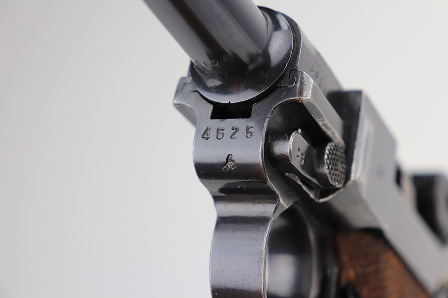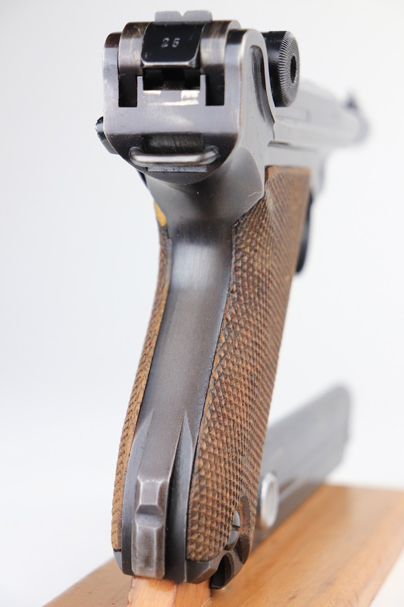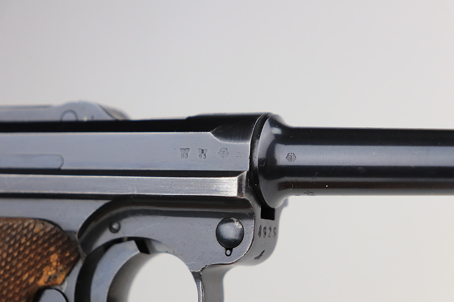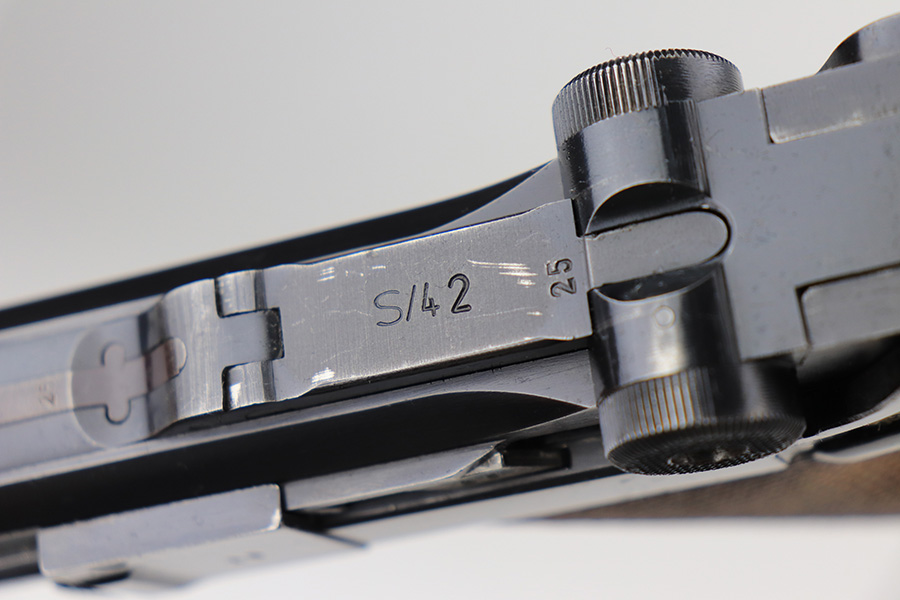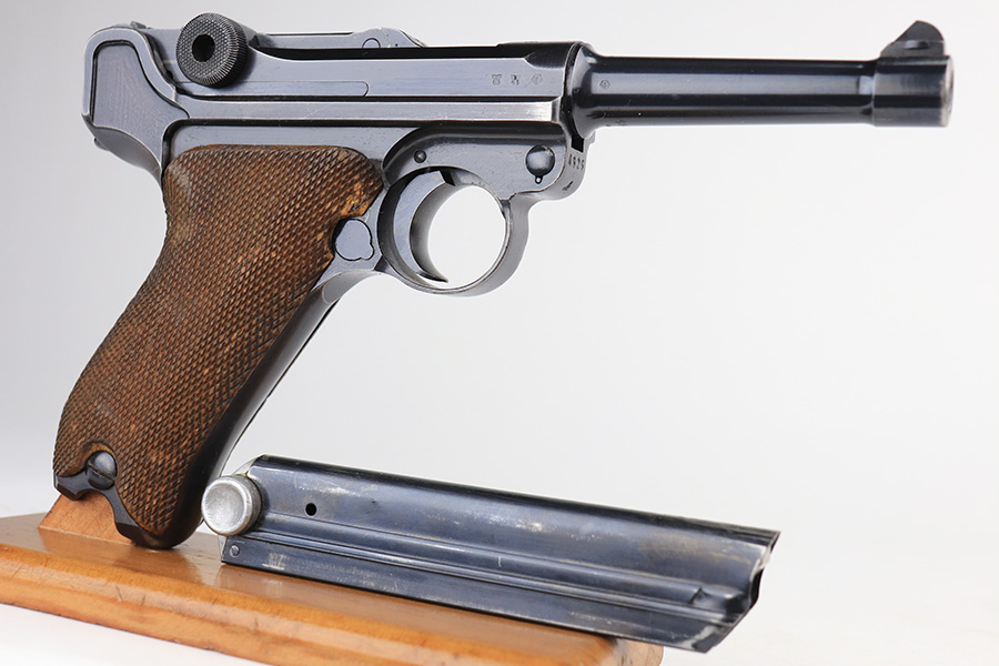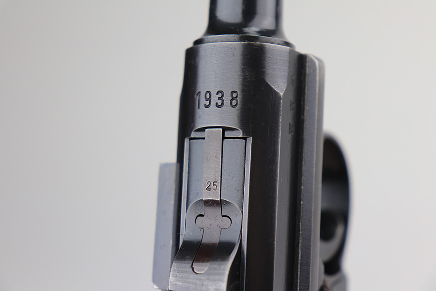 2/9/22 – This is a very nice example of an original Nazi Mauser Luger from 1938. All matching numbers, including the original grips. The pistol retains about 94% of its original blue, with standard edge wear around muzzle and sideplate. Also some bluing loss on the right side rail and receiver ears. Mint bore, looks like it hasn’t been used much at all. Original grips are in good shape other than the common chip under the safety. Period original but mismatched mag.