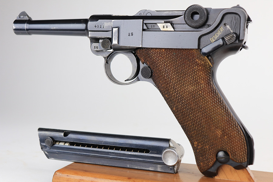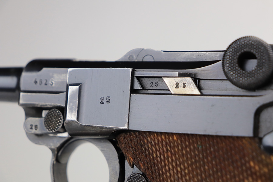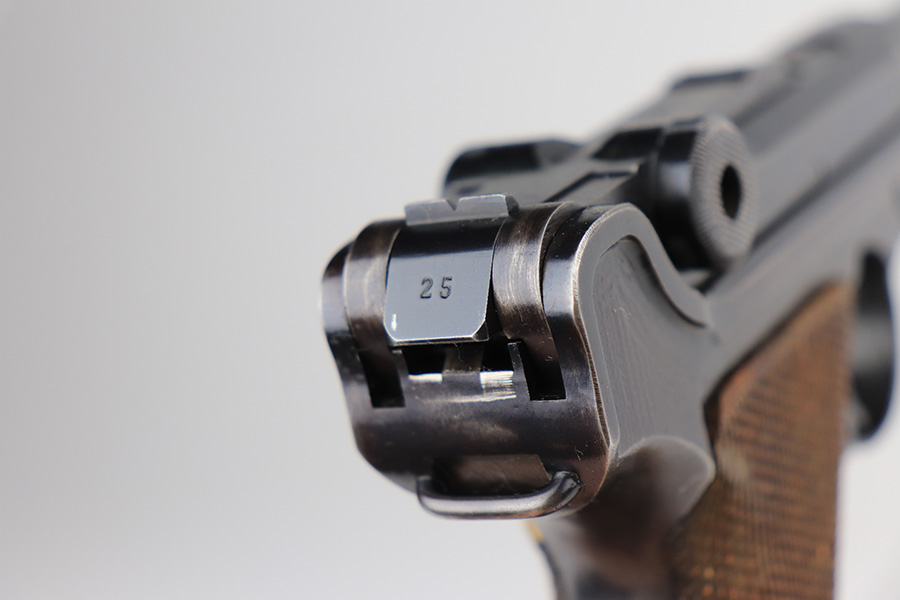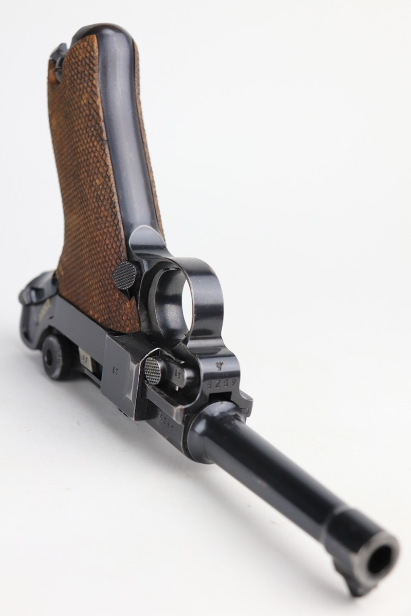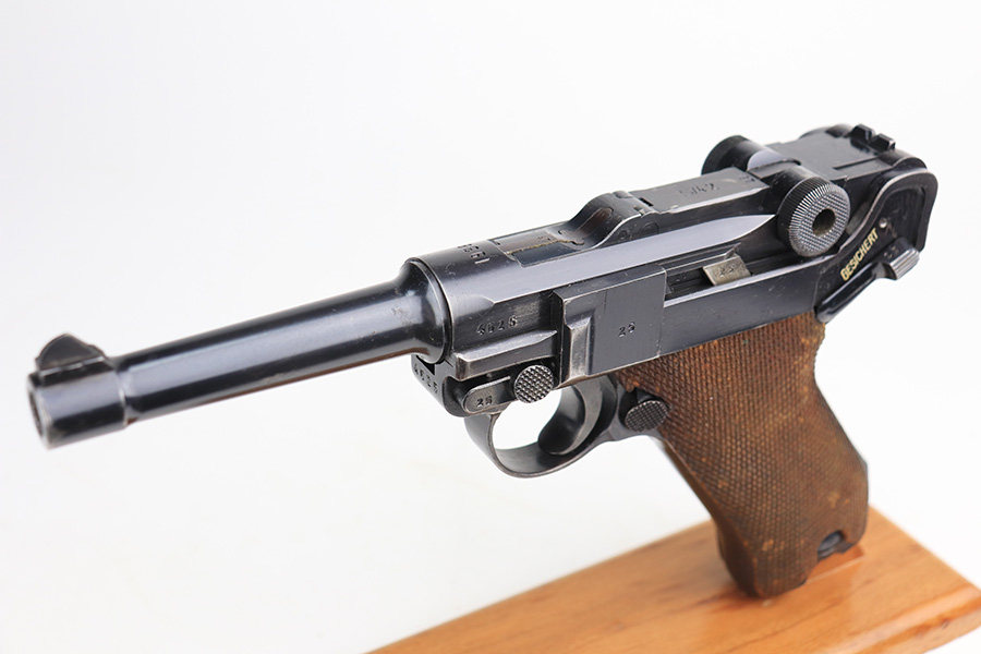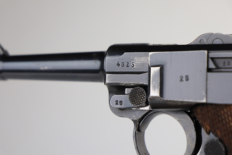 2/9/22 – This is a very nice example of an original Nazi Mauser Luger from 1938. All matching numbers, including the original grips. The pistol retains about 94% of its original blue, with standard edge wear around muzzle and sideplate. Also some bluing loss on the right side rail and receiver ears. Mint bore, looks like it hasn’t been used much at all. Original grips are in good shape other than the common chip under the safety. Period original but mismatched mag.