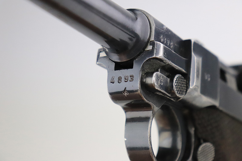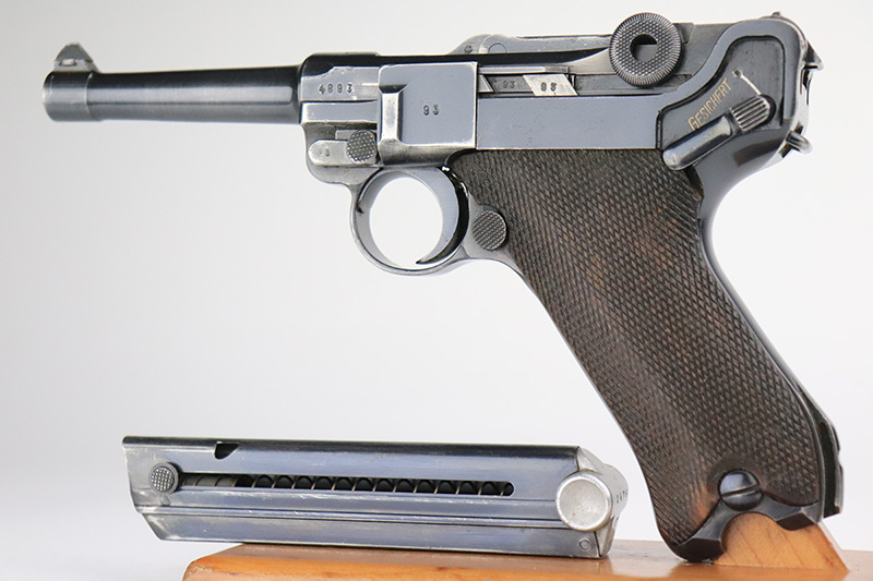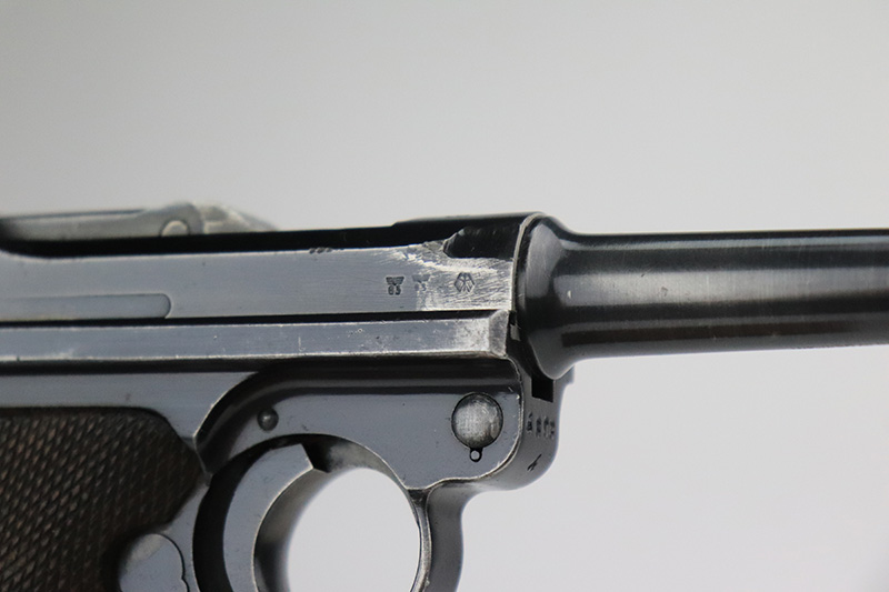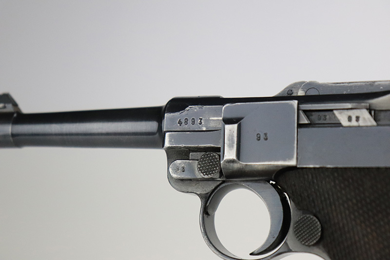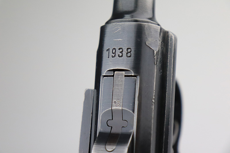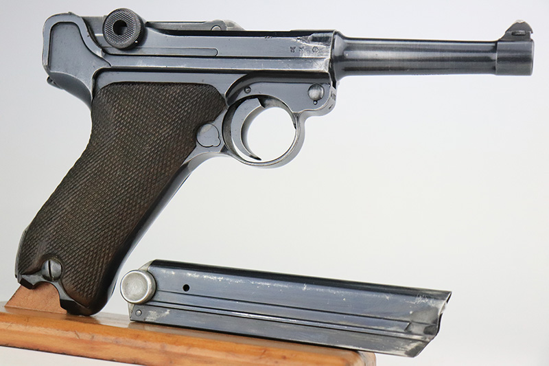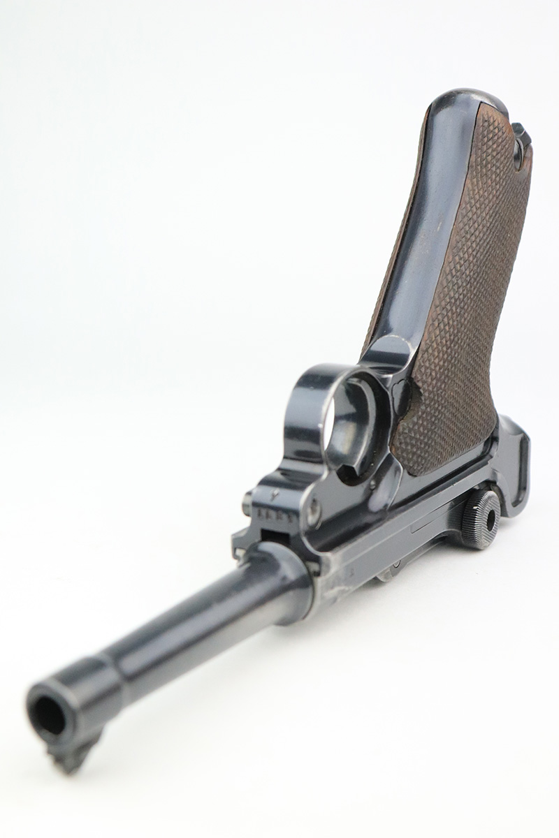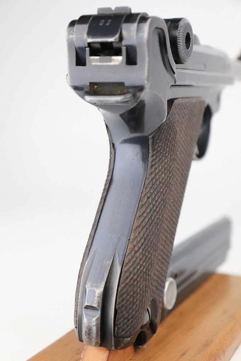9/14/22 – This is a very nice example of a Mauser Luger issued to the Nazi military in 1938. It is all matching except for the barrel, which has been replaced – it is un-numbered and has a “Made in Germany” export marking. The gun has the proper “Eagle 63” military acceptance proofs and has retained about 93% of its original finish. There is minor wear on the side plate and around the front edges of the slide and frame. Minor thinning along the barrel. Light scratchy wear and pin-pricking on both grips straps. A few very light scratches on the left side of the frame and around the muzzle. A few tiny dings around the high edges of the chamber. Comes with nice wood grips – no legible numbering. Small chip in the top corner of the left panel. Also comes with a period-correct but mismatched magazine. The bore is near-mint.