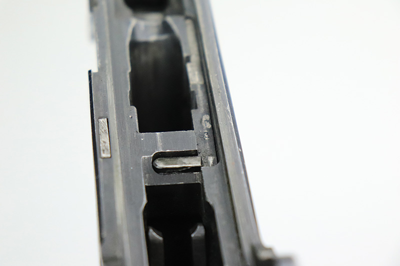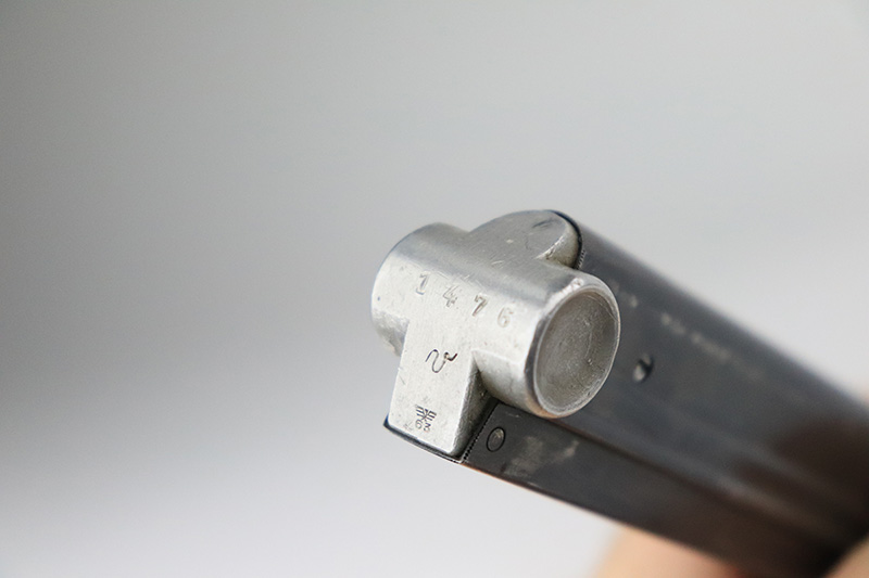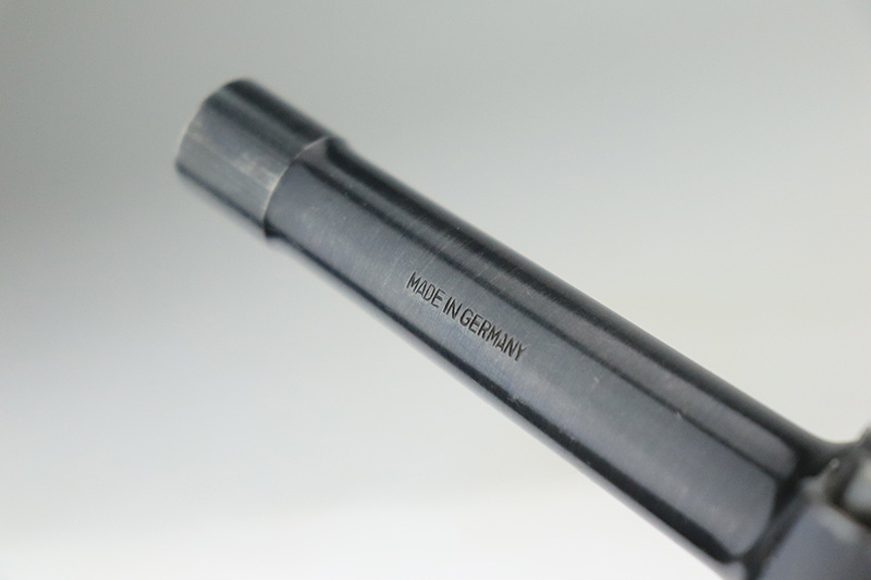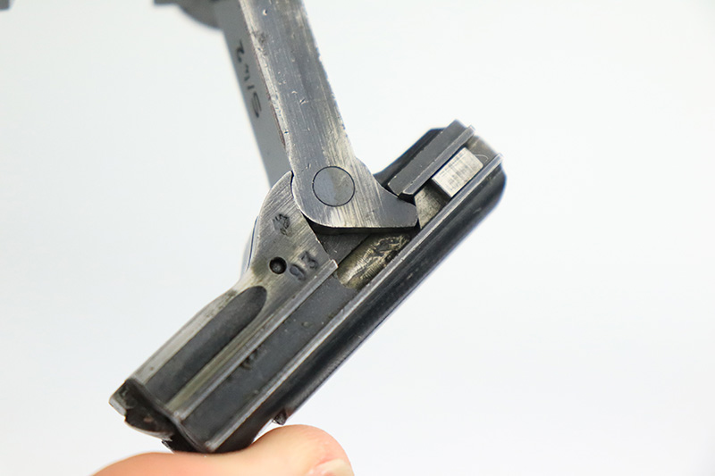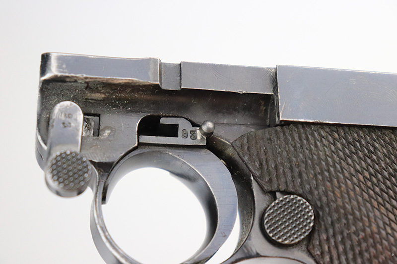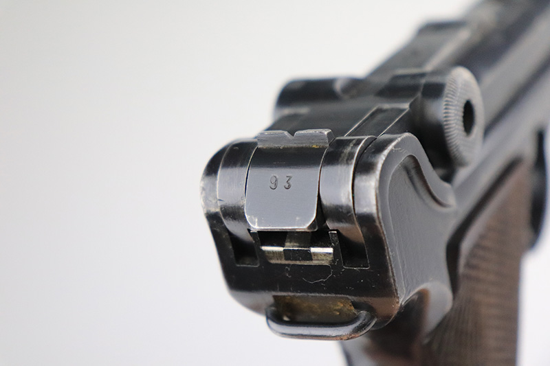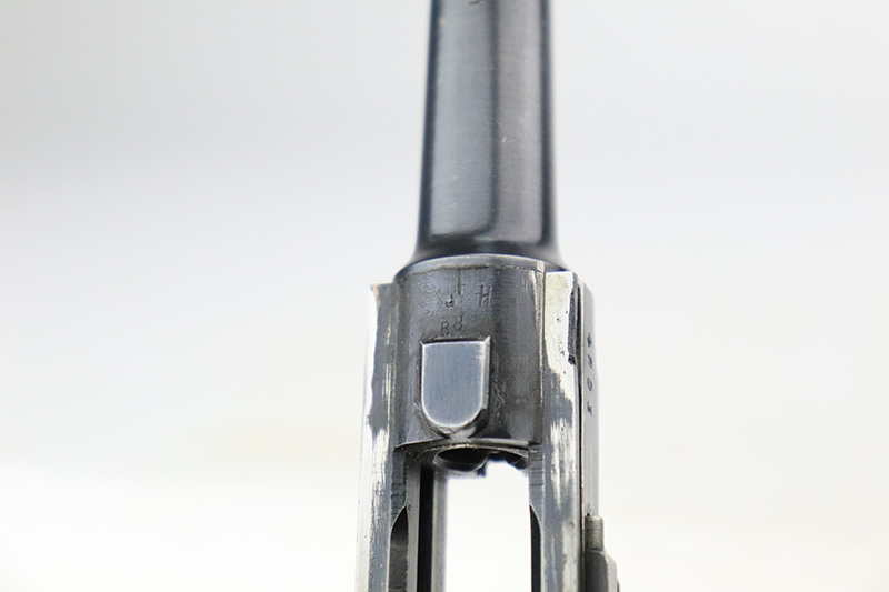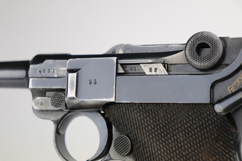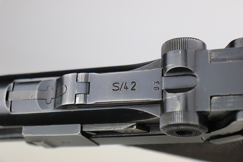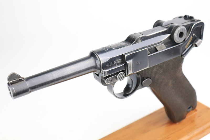 9/14/22 – This is a very nice example of a Mauser Luger issued to the Nazi military in 1938. It is all matching except for the barrel, which has been replaced – it is un-numbered and has a “Made in Germany” export marking. The gun has the proper “Eagle 63” military acceptance proofs and has retained about 93% of its original finish. There is minor wear on the side plate and around the front edges of the slide and frame. Minor thinning along the barrel. Light scratchy wear and pin-pricking on both grips straps. A few very light scratches on the left side of the frame and around the muzzle. A few tiny dings around the high edges of the chamber. Comes with nice wood grips – no legible numbering. Small chip in the top corner of the left panel. Also comes with a period-correct but mismatched magazine. The bore is near-mint.