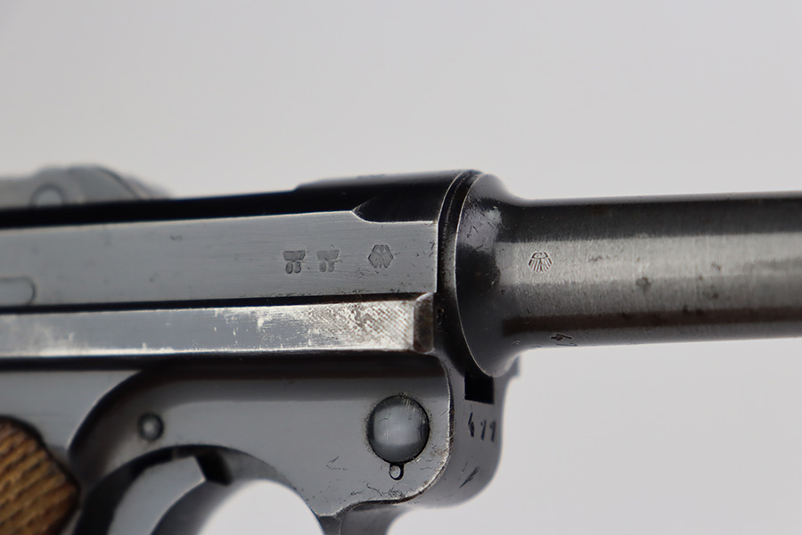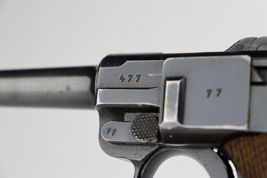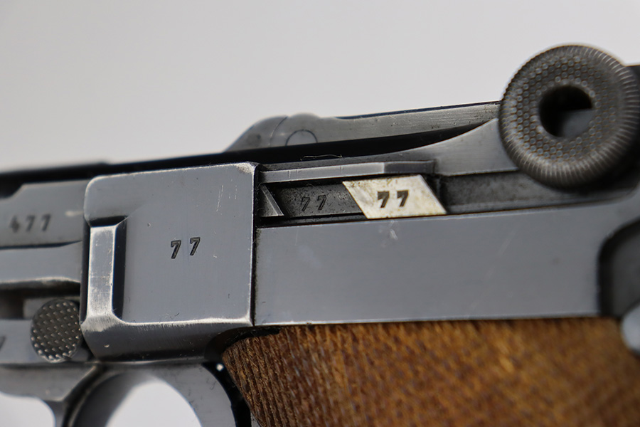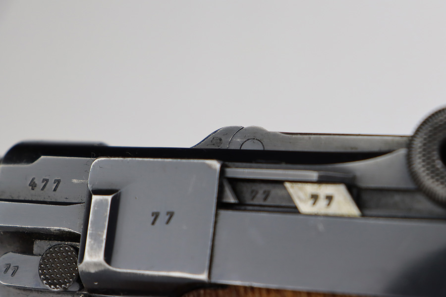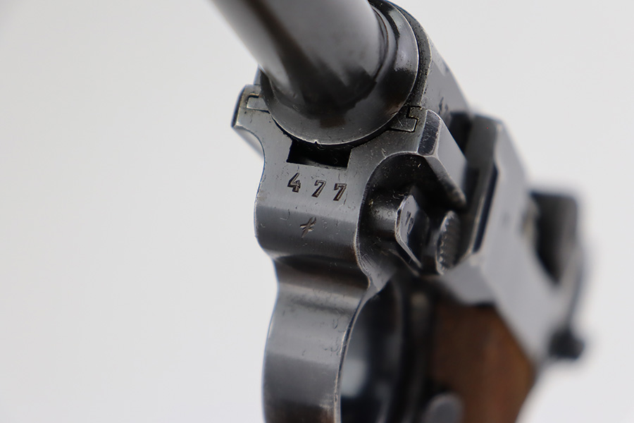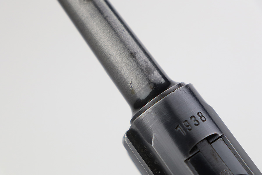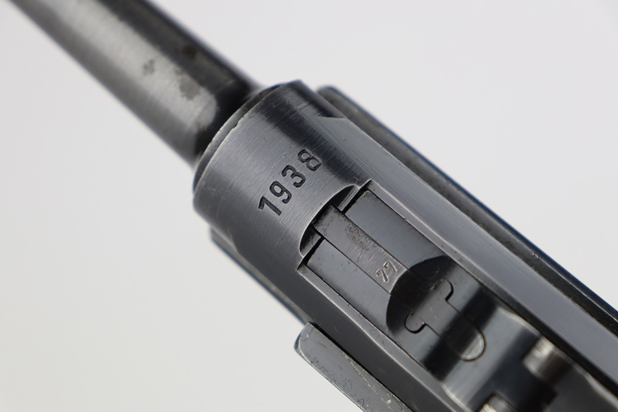 6/27/23 – This is a nice example of a Mauser Luger issued to the Nazi military in 1938. It is all matching and has the proper “Eagle 63” military acceptance proofs. It has retained roughly 80-85% of its original bluing. The majority of the finish loss comes in the form of thinning along the whole barrel and on the front toggle link. There is also wear around the muzzle, on the side plate, and on the side rails. Fitted with a minty set of matching-numbered wood grips. Comes with a mismatched “Eagle 63” proofed magazine. The bore has great rifling, but there is minor freckling in the grooves.