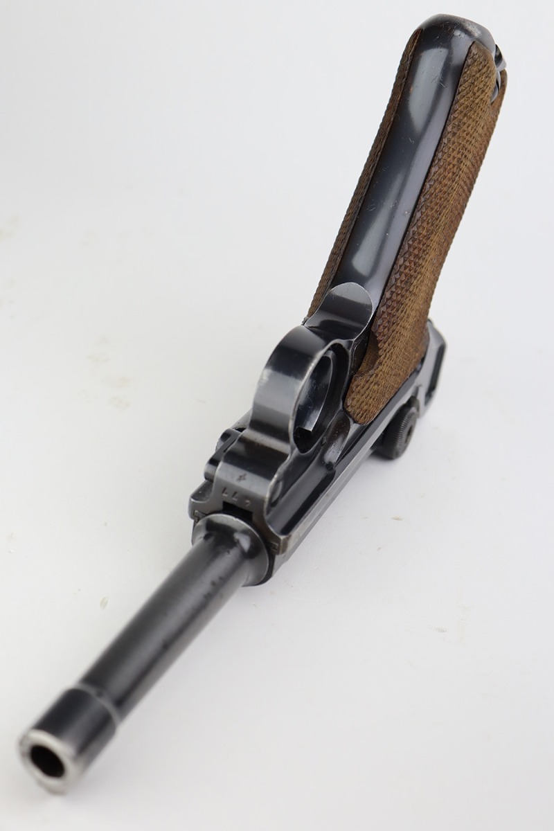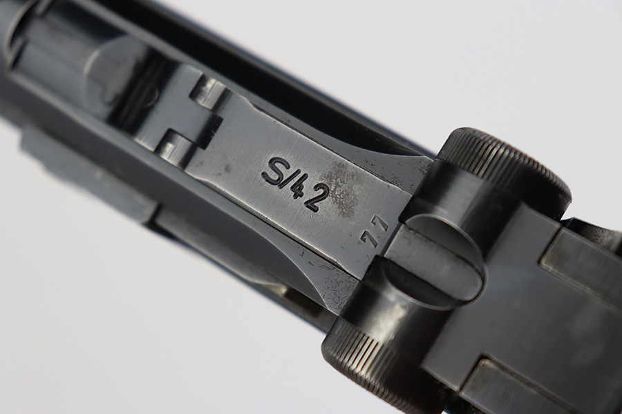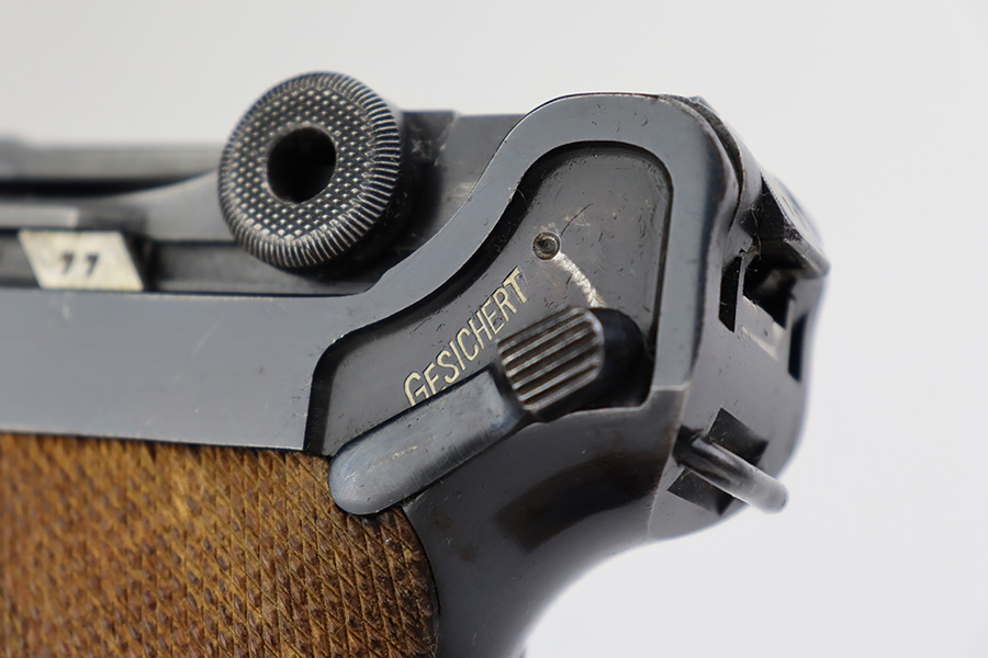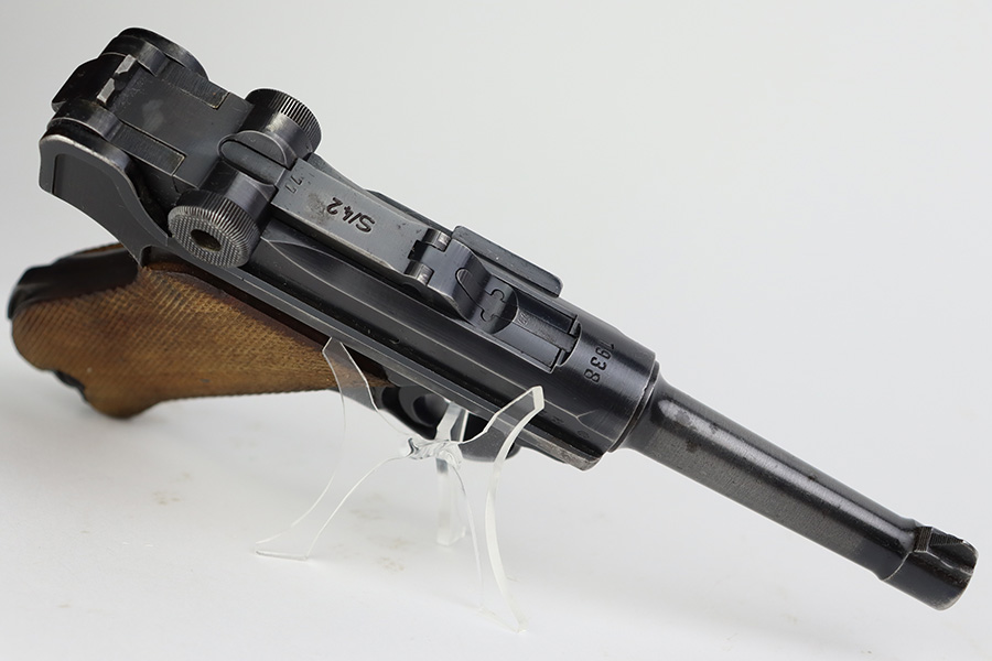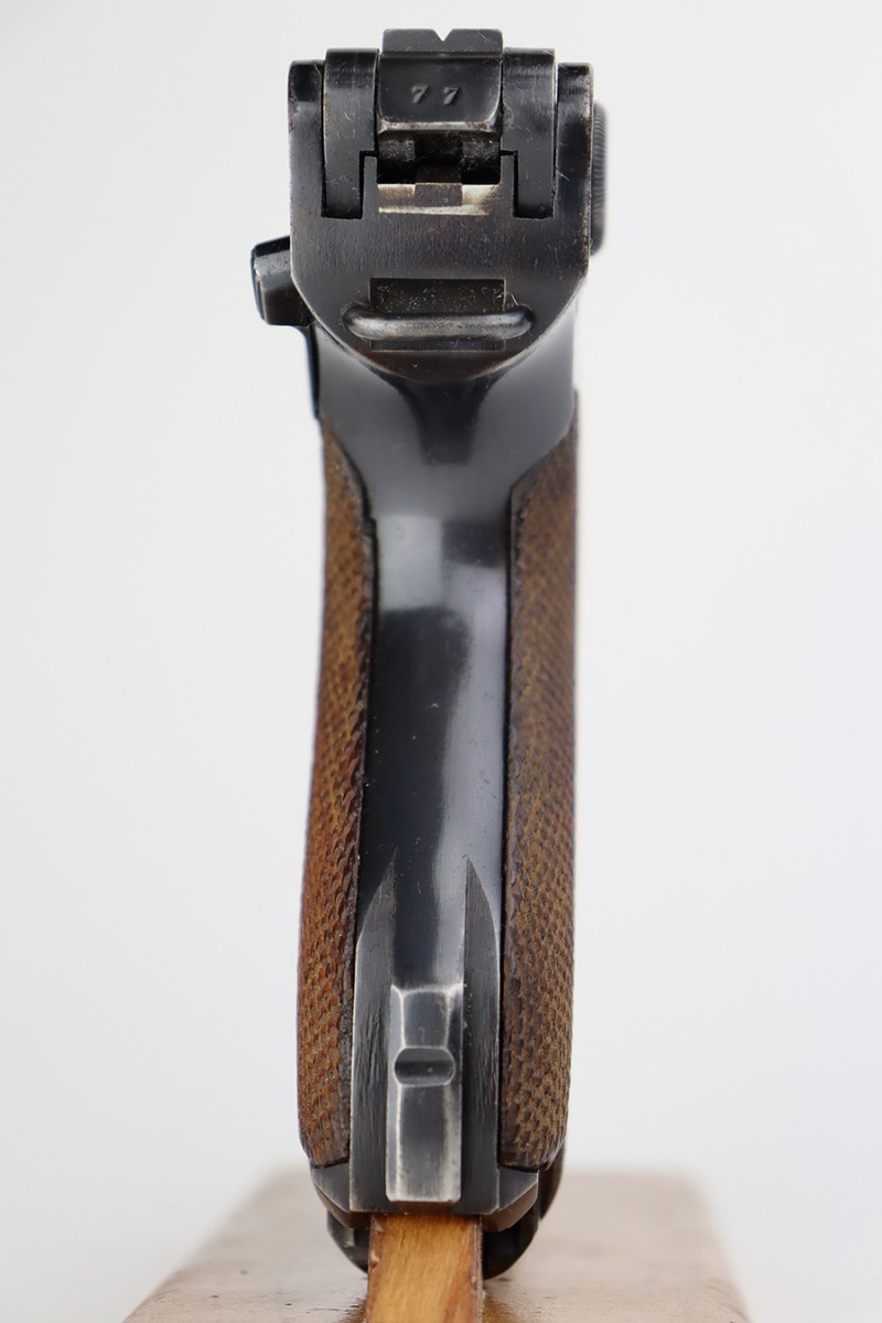 6/27/23 – This is a nice example of a Mauser Luger issued to the Nazi military in 1938. It is all matching and has the proper “Eagle 63” military acceptance proofs. It has retained roughly 80-85% of its original bluing. The majority of the finish loss comes in the form of thinning along the whole barrel and on the front toggle link. There is also wear around the muzzle, on the side plate, and on the side rails. Fitted with a minty set of matching-numbered wood grips. Comes with a mismatched “Eagle 63” proofed magazine. The bore has great rifling, but there is minor freckling in the grooves.