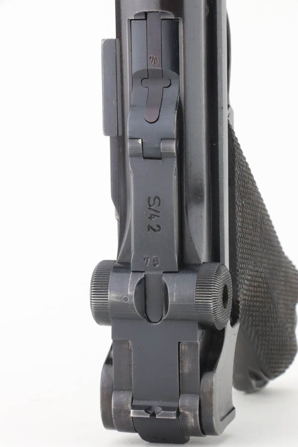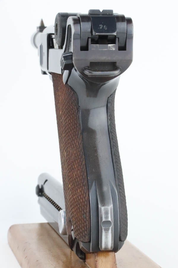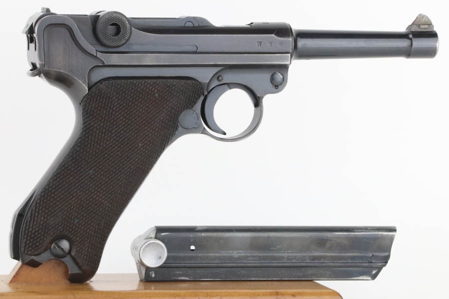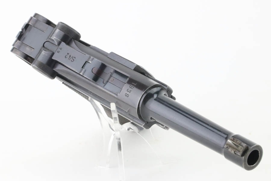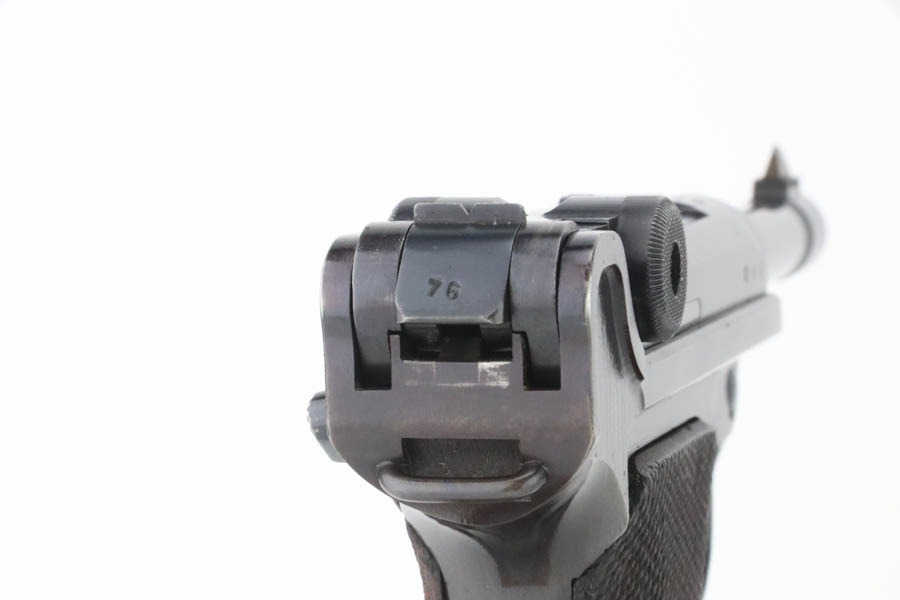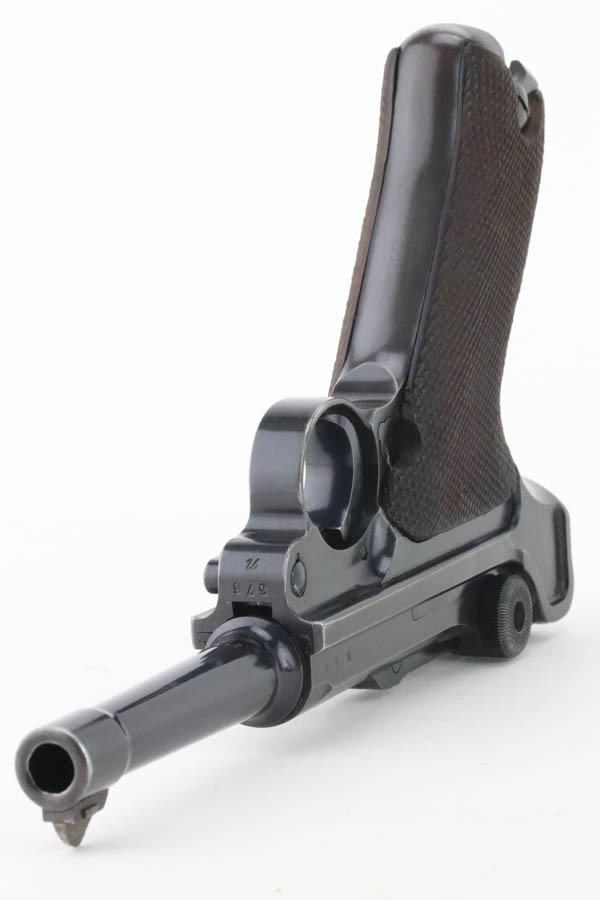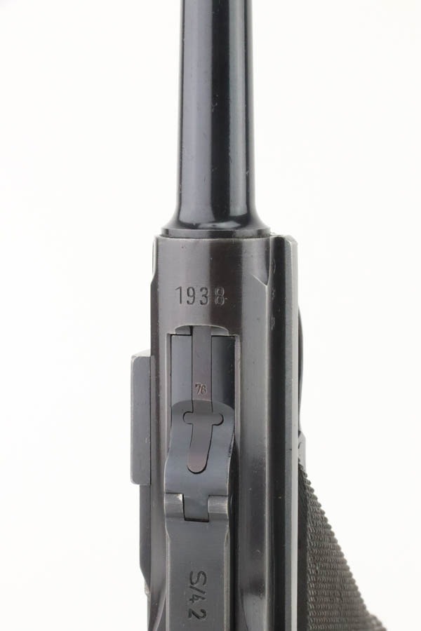 9/27/24 – This is a very nice example of a Mauser Luger issued to the Nazi military in 1938. All matching with the proper “Eagle 63” military acceptance proofs. It comes as a rig with of a very nice 1938-dated holster, an “Eagle 63” tool, and one original matching-numbered magazine. The gun itself has retained about 93% of its original finish with minor muzzle wear, minor high edge wear, and some minor thinning with light brown patina on the grip straps. Fitted with excellent un-numbered wood grips. Mint bore.