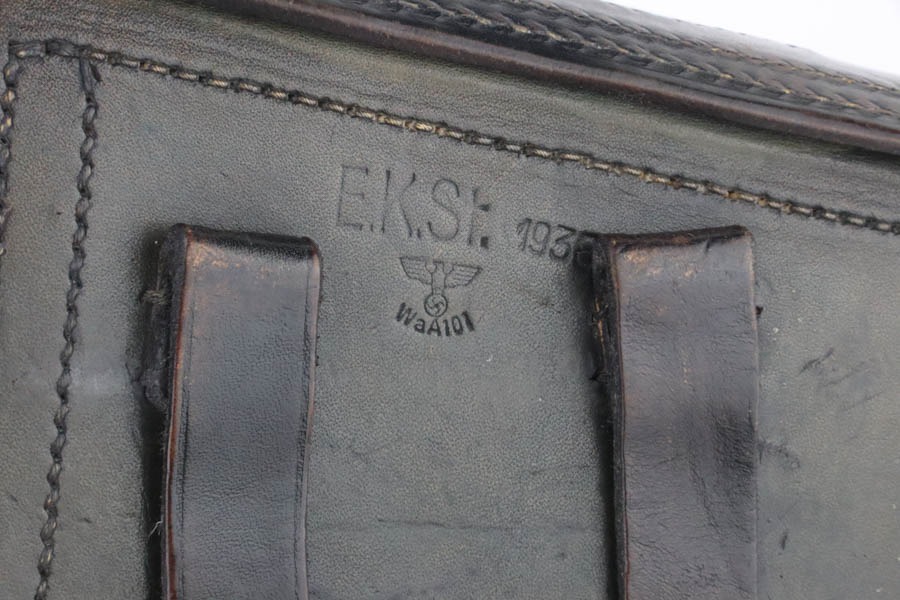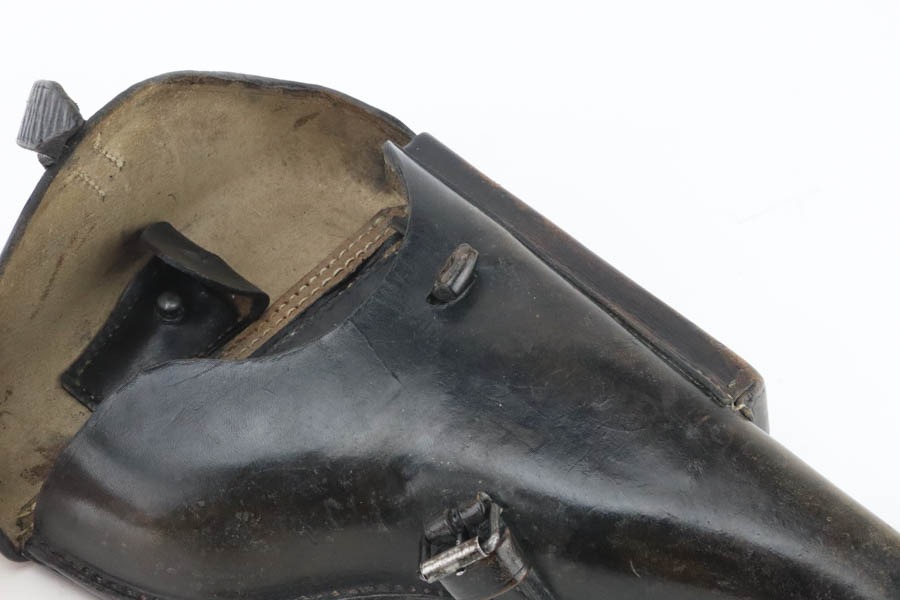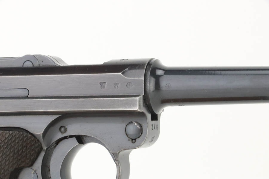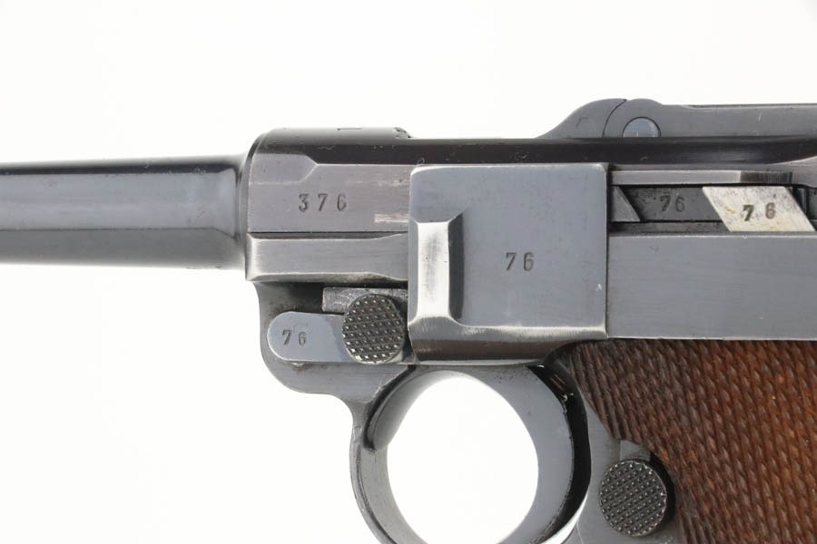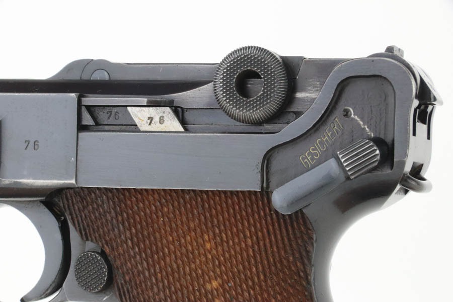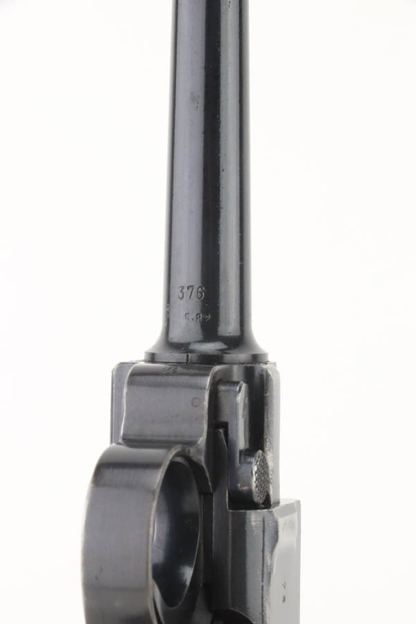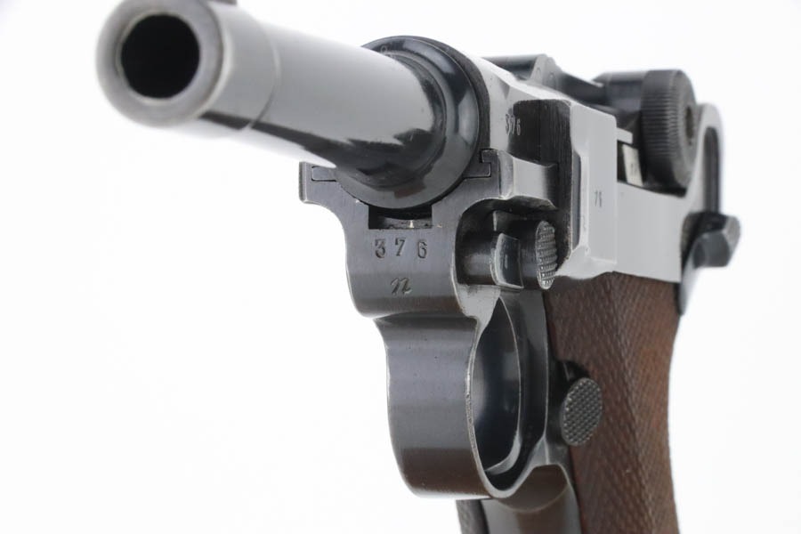 9/27/24 – This is a very nice example of a Mauser Luger issued to the Nazi military in 1938. All matching with the proper “Eagle 63” military acceptance proofs. It comes as a rig with of a very nice 1938-dated holster, an “Eagle 63” tool, and one original matching-numbered magazine. The gun itself has retained about 93% of its original finish with minor muzzle wear, minor high edge wear, and some minor thinning with light brown patina on the grip straps. Fitted with excellent un-numbered wood grips. Mint bore.