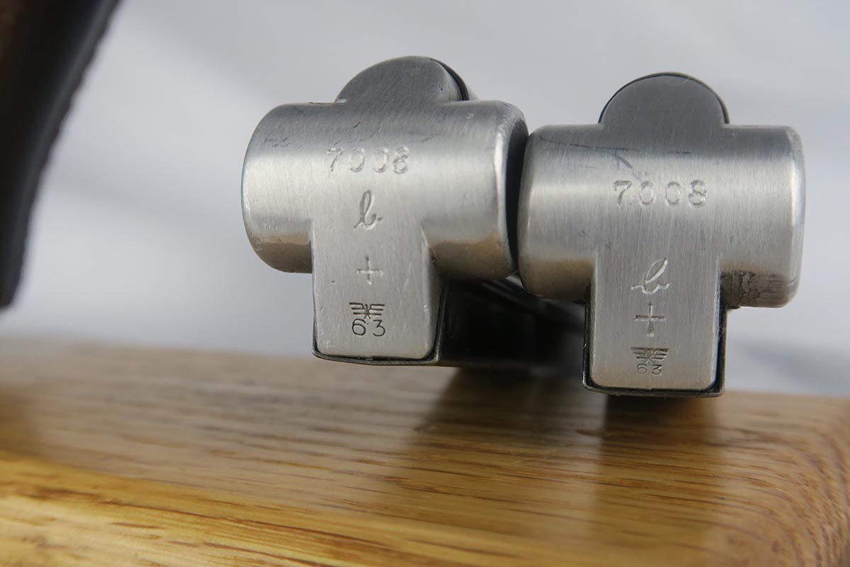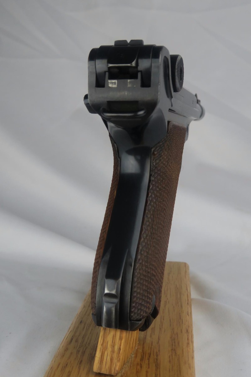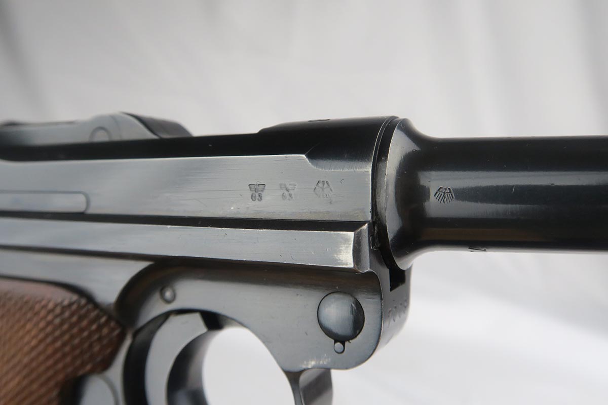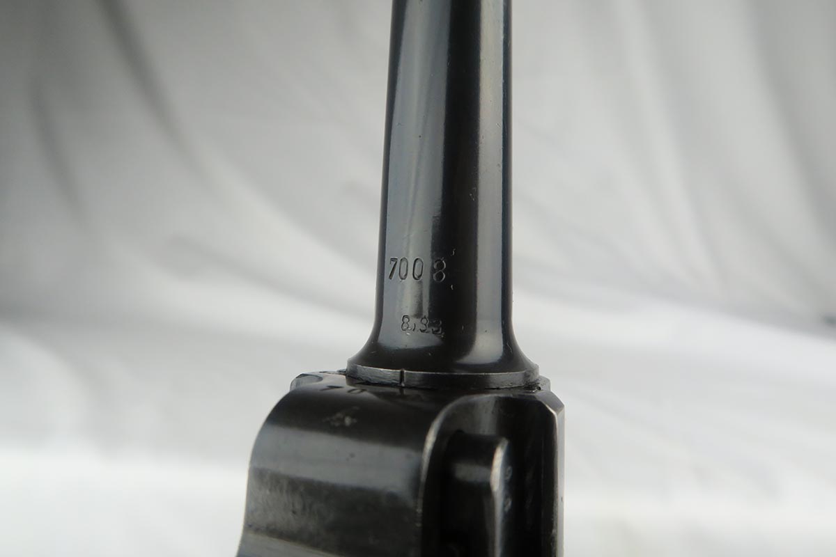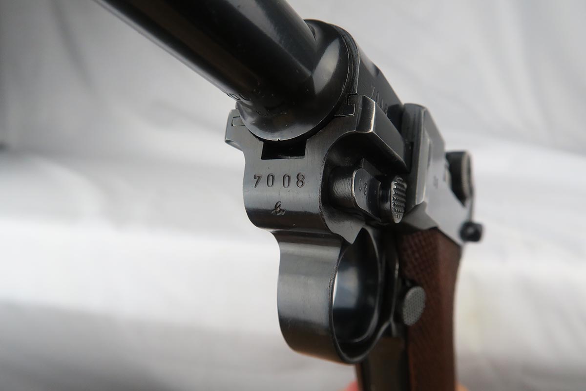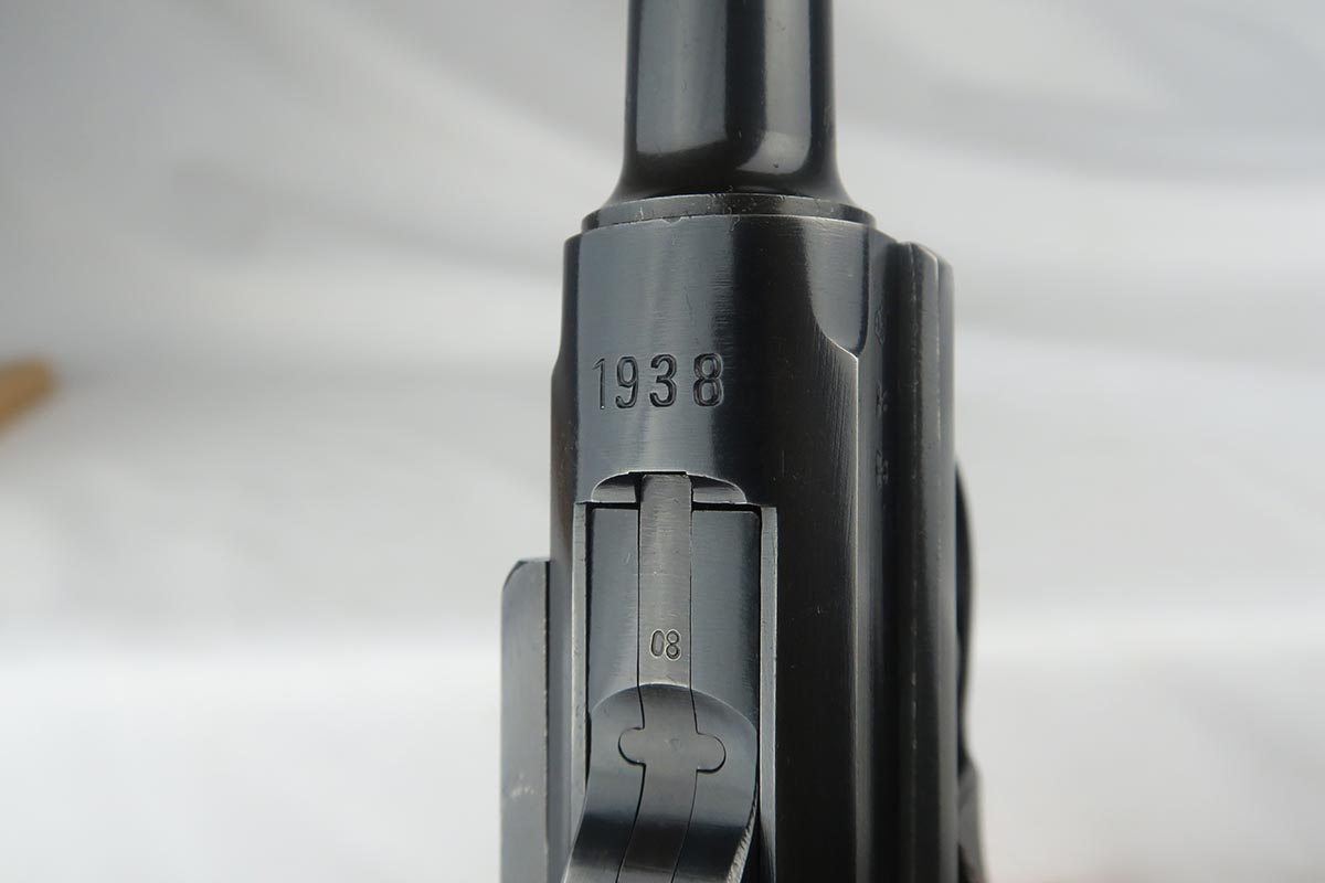 9/26/17 – This is a nice Mauser luger, manufactured in 1938, with two force matched magazines. The pistol itself is all original and correct with about 96% blue remaining. There is some holster wear on the left side of the pistol, mainly the left side of the barrel, near the muzzle. The gun is all matching, including the grips. The magazines are period correct but have been renumbered to match the gun. Excellent bore.