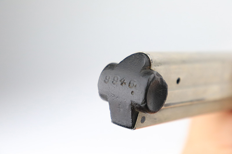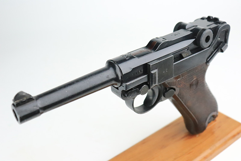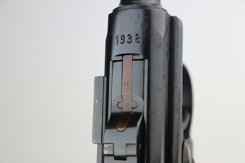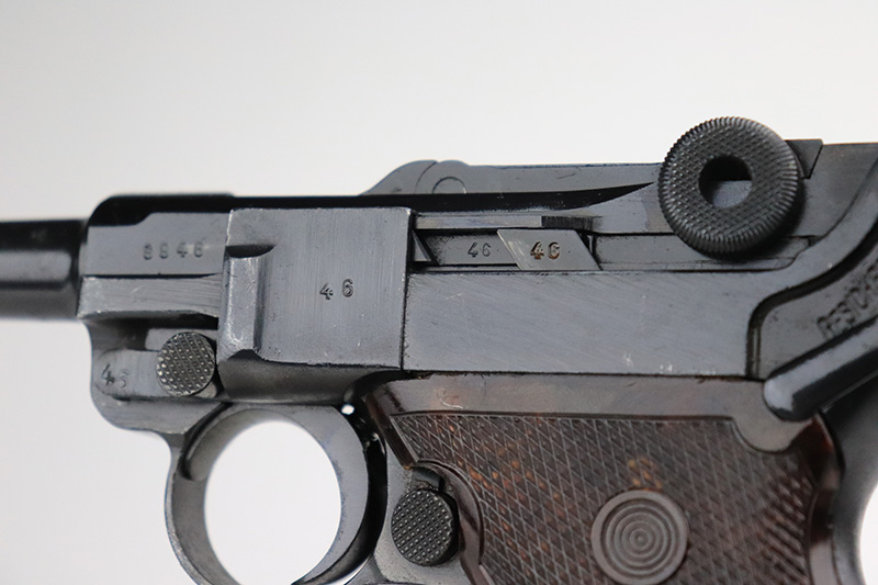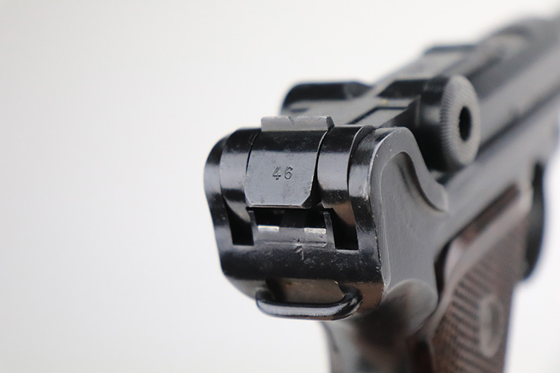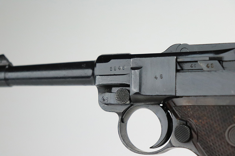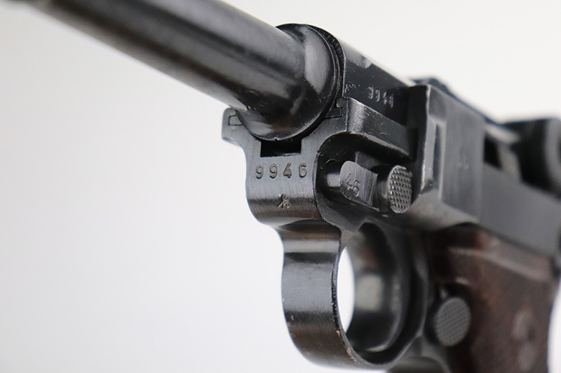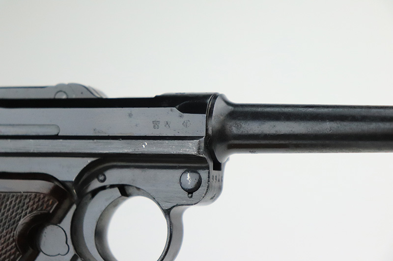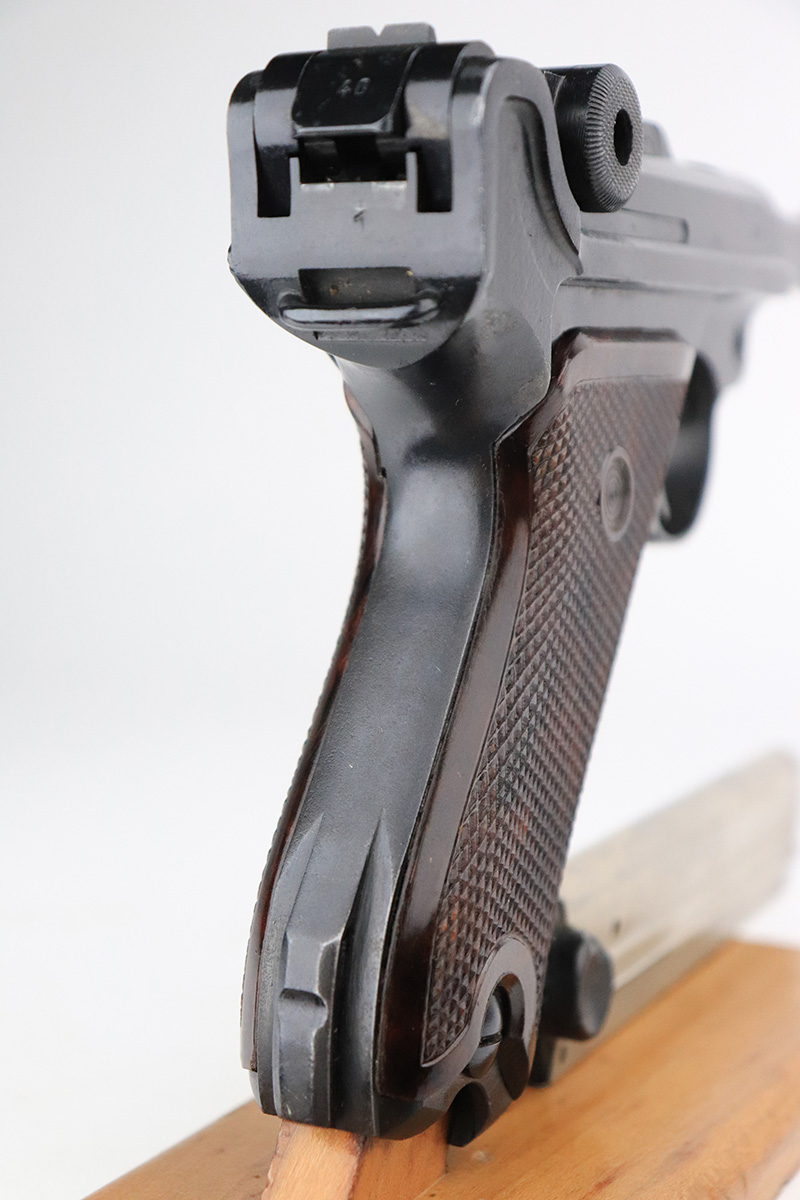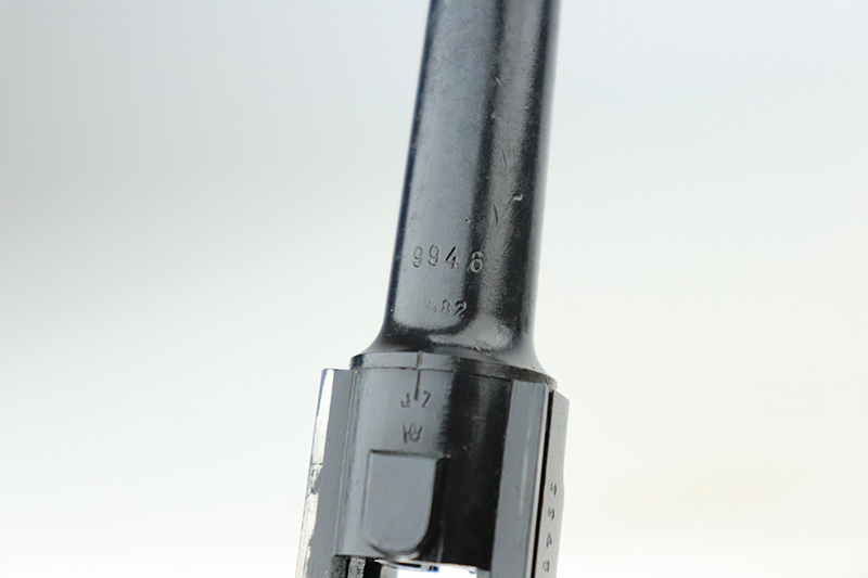 9/14/22 – This is a very nice example of a Mauser Luger issued to the Nazi military in 1938. The gun is mostly matching except for the rear toggle pin. It has the proper “Eagle 63” military acceptance proofs. This gun eventually ended up with the VoPo or East German police force, as evidence by its dark “dipped” finish, East German style numbering on some of the parts, post-war VoPo plastic grips, and post-war matching-numbered magazine. There is almost no actual finish loss, but there is obvious pin-pricking along the barrel and on both grip straps. The rifling in the bore is fairly worn with noticeable pin-pricking in the grooves.